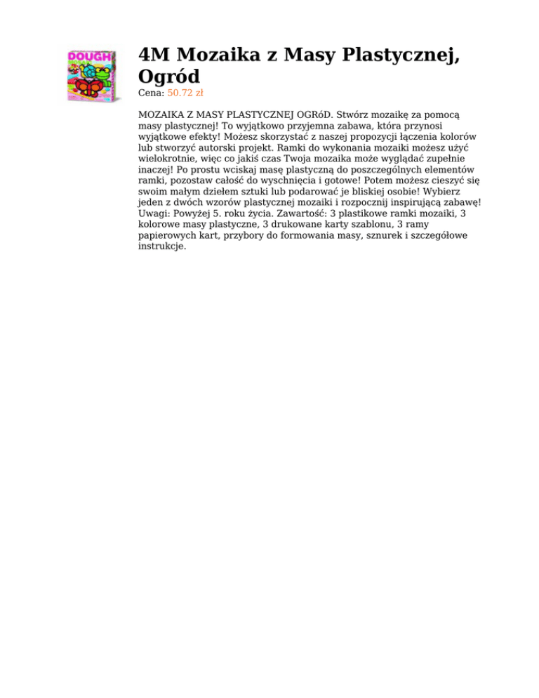 4M Mozaika z Masy Plastycznej, Ogród Cena: 50.72 zł MOZAIKA Z MASY PLASTYCZNEJ OGRóD. Stwórz mozaikę za pomocą masy plastycznej! To wyjątkowo przyjemna zabawa, która przynosi wyjątkowe efekty! Możesz skorzystać z naszej propozycji łączenia kolorów lub stworzyć autorski projekt. Ramki do wykonania mozaiki możesz użyć wielokrotnie, więc co jakiś czas Twoja mozaika może wyglądać zupełnie inaczej! Po prostu wciskaj masę plastyczną do poszczególnych elementów ramki, pozostaw całość do wyschnięcia i gotowe! Potem możesz cieszyć się swoim małym dziełem sztuki lub podarować je bliskiej osobie! Wybierz jeden z dwóch wzorów plastycznej mozaiki i rozpocznij inspirującą zabawę! Uwagi: Powyżej 5. roku życia. Zawartość: 3 plastikowe ramki mozaiki, 3 kolorowe masy plastyczne, 3 drukowane karty szablonu, 3 ramy papierowych kart, przybory do formowania masy, sznurek i szczegółowe instrukcje.