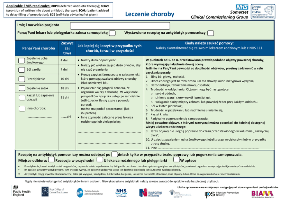Applicable EMIS read codes: 8BP0 (deferred antibiotic therapy); 8OA9 (provision of written info about antibiotic therapy); 8CAk (patient advised to delay filling of prescription); 8CE (self-help advice leaflet given) Leczenie choroby Imię i nazwisko pacjenta Pana/Pani lekarz lub pielęgniarka zaleca samoopiekę Pana/Pani choroba Zazwyc zaj trwa Zapalenie ucha środkowego 4 dni Ból gardła 7 dni Przeziębienie 10 dni Zapalenie zatok 18 dni Kaszel lub zapalenie oskrzeli 21 dni Inna choroba: ............................. .......dni Wystawiono receptę na antybiotyk pomocniczy Jak lepiej się leczyć w przypadku tych chorób, teraz i w przyszłości Należy dużo odpoczywać. Należy pić wystarczająco dużo płynów, aby nie czuć pragnienia. Proszę zapytać farmaceutę o zalecane leki, które pomogą zwalczyć objawy choroby i/lub uśmierzyć ból. Pojawienie się gorączki oznacza, że organizm walczy z chorobą. W większości przypadków gorączka ustępuje samoistnie. Jeśli dziecko źle się czuje z powodu gorączki, można mu podać paracetamol (lub ibuprofen). Inne czynności zalecane przez lekarza rodzinnego lub pielęgniarkę: ..................................................... ..................................................... Kiedy należy szukać pomocy: Należy skontaktować się ze swoim lekarzem rodzinnym lub z NHS 111 W punktach od 1. do 8. przedstawiono prawdopodobne objawy poważnej choroby, które wymagają natychmiastowej oceny. Jeśli nie ma Pan/Pani pewności co do pilności objawów, prosimy zadzwonić w celu uzyskania porady. 1. Silny ból głowy, mdłości, 2. Skóra chorego jest bardzo zimna lub ma dziwny kolor, nietypowa wysypka, 3. Dezorientacja, zaburzenia mowy, ospałość, 4. Trudności w oddychaniu. Objawy mogą być następujące: o szybki oddech, o sinienie warg i skóry wokół i poniżej ust, o wciąganie skóry między żebrami lub powyżej żeber przy każdym oddechu. 5. Ból w klatce piersiowej, 6. Trudności w przełykaniu lub nadmierne ślinienie się, 7. Kaszel krwią. 8. Radykalne pogorszenie się samopoczucia. Mniej poważne objawy, z którymi zazwyczaj można poczekać do kolejnej dostępnej wizyty u lekarza rodzinnego: 9. Jeżeli objawy nie ulegną poprawie do czasu przedstawionego w kolumnie „Zazwyczaj trwa”, 10. U dzieci z zapaleniem ucha środkowego: jeżeli z uszu wycieka płyn lub w przypadku utraty słuchu. 11. Inne ………………………………………………………………………………………………………………… Receptę na antybiotyk pomocniczy można odebrać po dniach tylko w przypadku braku poprawy lub pogorszenia samopoczucia. Miejsce odbioru: Recepcja w przychodni U lekarza rodzinnego lub pielęgniarki W aptece Przeziębienia, kaszel w większości przypadków, zapalenie zatok, zapalenie ucha, ból gardła oraz inne choroby często ustępują bez antybiotyków, ponieważ organizm zazwyczaj potrafi je zwalczyć samodzielnie. Im częściej używamy antybiotyków, tym większe ryzyko, że bakterie uodpornią się na ich działanie i nie będą już skutecznie zwalczać chorób. Antybiotyki mogą wywołać skutki uboczne, takie jak wysypka, kandydoza, ból brzucha, biegunka, uczulenie na światło słoneczne, inne objawy, lub mdłości po wypiciu alkoholu z metronidazolem. Nigdy nie należy udostępniać antybiotyków innym osobom. Niewykorzystane antybiotyki należy zawsze zwracać do apteki w celu bezpiecznej utylizacji. Ulotka opracowana we współpracy z następującymii stowarzyszeniami profesjonalistów.