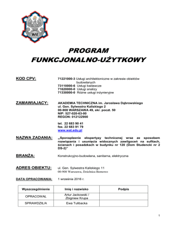 PROGRAM FUNKCJONALNO-UŻYTKOWY KOD CPV: 71221000-3 Usługi architektoniczne w zakresie obiektów budowlanych 73110000-6 Usługi badawcze 71620000-0 Usługi analizy 71330000-0 Różne usługi inżynieryjne ZAMAWIAJĄCY: AKADEMIA TECHNICZNA im. Jarosława Dąbrowskiego ul. Gen. Sylwestra Kaliskiego 2 00-908 WARSZAWA 49, skr. poczt. 50 NIP: 527-020-63-00 REGON: 012122900 tel. 22 683 90 41 fax. 22 683 91 79 www.wat.edu.pl NAZWA ZADANIA: „Sporządzenie BRANŻA: Konstrukcyjno-budowlana, sanitarna, elektryczna ADRES OBIEKTU: ul. Gen. Sylwestra Kaliskiego 11 00-908 Warszawa, Dzielnica Bemowo DATA OPRACOWANIA: 1 września 2016 r. ekspertyzy technicznej wraz ze sposobem rozwiązania i usunięcia widocznych zawilgoceń na sufitach, ścianach i posadzkach w budynku nr 120 (Dom Studencki nr 2 DS-2)” Wyszczególnienie Imię i nazwisko OPRACOWAŁ Artur Jackowski / Zbigniew Krupa SPRAWDZIŁ/A Ewa Tulibacka Podpis 1 Spis treści Lp. Opis Str. A CZĘŚĆ OPISOWA PROGRAMU FUNKCJONALNO-UŻYTKOWEGO 3 1 Podstawa opracowania 3 2 Charakterystyczne parametry budynku nr 120 (DS-2) 3 Aktualne uwarunkowania wykonania przedmiotu zamówienia. 4 Opis Wymagań Zamawiającego w stosunku do przedmiotu zamówienia 4-5 5 Poglądowy opis prac i zdjęcia do wykorzystania w celu sporządzenia ekspertyzy technicznej 5 - 12 B CZĘŚĆ INFORMACYJNA PROGRAMU FUNKCJONALNOUŻYTKOWEGO 1 Koszty administracyjne: wszelkich uzgodnień, uzyskania mapy zasadniczej, warunków zabudowy i pozwolenia budowlanego, ponosi Wykonawca. 2 Dokumenty potwierdzające zgodność zamierzenia budowlanego z wymaganiami wynikającymi z odrębnych przepisów 13 - 14 3 Właściwe organy wojskowe do uzgodnienia dokumentacji pod względem p.poż. i sanitarnym 14 4 Przepisy prawne i normy związane z projektowaniem i wykonaniem zamierzenia budowlanego 14 - 15 5 Inne informacje i dokumenty niezbędne do zaprojektowania robót budowlanych 15 3-4 4 13 13 2 A. CZĘŚĆ OPISOWA PROGRAMU FUNKCJONALNO-UŻYTKOWEGO Przedmiotem opracowania jest sporządzenie ekspertyzy technicznej wraz ze sposobem rozwiązania i usunięcia powstałych zawilgoceń na sufitach, ścianach i posadzkach w budynku nr 120 (Dom Studencki nr 2 DS-2). Ekspertyza obejmuje budynek nr 120 w następującym zakresie: - ekspertyza techniczna dotycząca w pomieszczeniach sanitarnych i przyległych, powstałego zawilgocenia - ekspertyza instalacji co w pomieszczeniach i wymaganych projektowo wielkości), - ekspertyza białego montażu (m.in. spłuczki do pisuarów, baterie prysznicowe) – stanu zużycia i prawidłowości działania przyjętych rozwiązań w tego typu obiekcie, - ekspertyza wentylacji w sanitariatach (m.in. kratek wentylacyjnych) - stan zużycia i prawidłowości działania przyjętych rozwiązań w tego typu obiekcie, - ekspertyza zabezpieczeń ppoż. instalacji obsługujących sanitariaty (m.in. klap ppoż.) prawidłowości działania przyjętych rozwiązań w nawiązaniu do rozwiązań pożarowych dla całego obiektu (m.in. Systemu Sygnalizacji Pożarowej), - specyfikacja techniczna wykonania i odbioru robót budowlanych, - kosztorys inwestorski wraz z przedmiarem robót. sanitarnych (stanu budynku zużycia 1. Podstawa opracowania: art. 31 ust. 2 ustawy z dnia 22 czerwca 2016 r. Prawo zamówień publicznych (t.j.: Dz.U. z 2016 r. poz. 1020 t.j.) o treści: „Jeżeli przedmiotem zamówienia jest zaprojektowanie i wykonanie robót budowlanych w rozumieniu ustawy z dnia 7 lipca 1994 r. - Prawo budowlane, zamawiający opisuje przedmiot zamówienia za pomocą programu funkcjonalno-użytkowego. § 15 rozporządzenia Ministra Infrastruktury z dnia 2 września 2004 r. w sprawie w sprawie szczegółowego zakresu i formy dokumentacji projektowej, specyfikacji technicznych wykonania i odbioru robót budowlanych oraz programu funkcjonalnoużytkowego (Dz. U. z dnia 16 września 2004r. Nr 202, poz. 2072), wydanego na podstawie art. 31 ust. 4 ustawy Prawo zamówień publicznych o treści: „Program funkcjonalno-użytkowy służy do ustalenia planowanych kosztów prac projektowych i robót budowlanych, przygotowania oferty szczególnie w zakresie obliczenia ceny oferty oraz wykonania prac projektowych”. 1.1 Zakwalifikowanie do PKOB Obiekt zaliczony został do klasy: 1130 – Budynki zbiorowego zamieszkania stosownie z rozporządzeniem Rady Ministrów z dnia 30 grudnia 1999r. w sprawie Polskiej Klasyfikacji Obiektów Budowlanych (PKOB), (Dz. U. z dnia 31 grudnia 1999 r. Nr 112, poz. 1316 ze zm.) 2. Charakterystyczne parametry określające wielkość Budynku nr 120 a. b. c. d. Nr obrębu Nr działki Rok budowy Kubatura – 6-10-04 7/7 1971 – 12 850 m3 3 e. f. g. h. i. Powierzchnia użytkowa – 2 864 m2 Powierzchnia zabudowy – 3 901 m2 Liczba kond. nadziemnych –5 Liczba kond. podziemnych –1 Instalacje – wodociągowa, kanalizacyjna, c.o., wentylacyjna, elektryczna, odgromowa, niskoprądowa. 3. Aktualne uwarunkowania wykonania przedmiotu zamówienia. 3.1. Stan istniejący. Budynek nr 120 jest usytuowany na terenie otwartym Wojskowej Akademii Technicznej w Warszawie, gmina Bemowo przy ul. gen. Sylwestra Kaliskiego 11. Budynek jest domem studenckim oznaczanym jako DS-2. 3.2. Planowane roboty. Sporządzenie ekspertyzy technicznej w pomieszczeniach sanitarnych i przyległych, dla: ustalenia przyczyn i usunięcia powstałych zawilgoceń (prawdopodobnie z powodu niewłaściwie wykonanych prac budowlano-instalacyjnych) i wymiana znoszonych z tego powodu instalacji, ustalenia i usunięcia przyczyn wadliwie działającej wentylacji (m.in. brak wystarczającego wyciągu, zabezpieczenia ppoż.), ustalenia i usunięcia przyczyn wadliwie działających spłuczek do pisuarów i baterii do pryszniców oraz zamontowanie nowych innego typu (uzgodnionych z użytkownikiem), demontaż starych zniszczonych grzejników, aktualizacja doborów i montaż nowych, skoordynowanie zabezpieczeń ppoż. instalacji (m.in. klapy ppoż.) z systemem pożarowym w budynku 3.3. Przed rozpoczęciem projektowania należy z mi