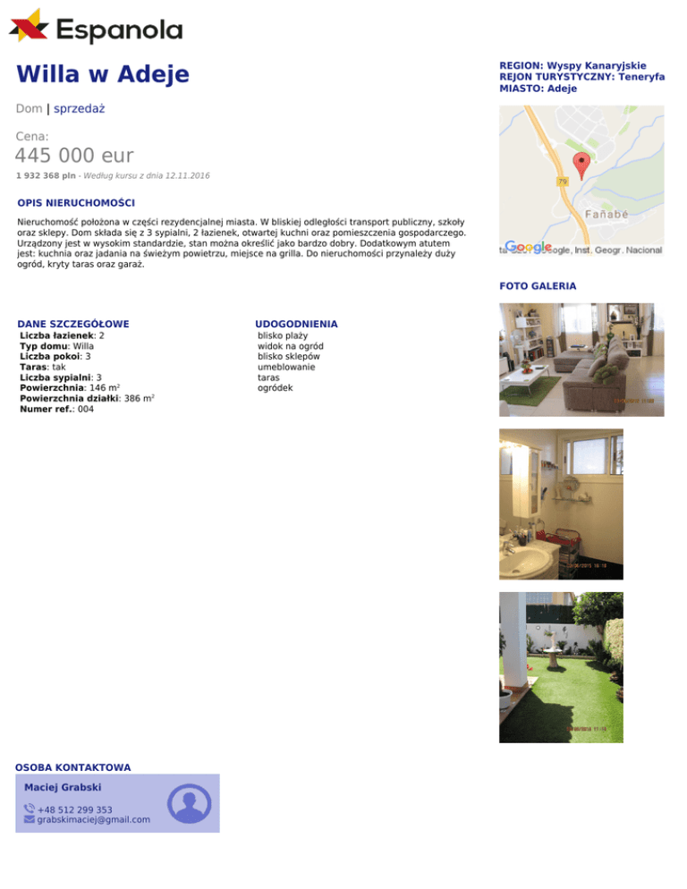 REGION: Wyspy Kanaryjskie REJON TURYSTYCZNY: Teneryfa MIASTO: Adeje Willa w Adeje Dom | sprzedaż Cena: 445 000 eur 1 932 368 pln - Według kursu z dnia 12.11.2016 OPIS NIERUCHOMOŚCI Nieruchomość położona w części rezydencjalnej miasta. W bliskiej odległości transport publiczny, szkoły oraz sklepy. Dom składa się z 3 sypialni, 2 łazienek, otwartej kuchni oraz pomieszczenia gospodarczego. Urządzony jest w wysokim standardzie, stan można określić jako bardzo dobry. Dodatkowym atutem jest: kuchnia oraz jadania na świeżym powietrzu, miejsce na grilla. Do nieruchomości przynależy duży ogród, kryty taras oraz garaż. FOTO GALERIA DANE SZCZEGÓŁOWE UDOGODNIENIA Liczba łazienek: 2 Typ domu: Willa Liczba pokoi: 3 Taras: tak Liczba sypialni: 3 Powierzchnia: 146 m2 Powierzchnia działki: 386 m2 Numer ref.: 004 blisko plaży widok na ogród blisko sklepów umeblowanie taras ogródek OSOBA KONTAKTOWA Maciej Grabski +48 512 299 353 [email protected] Teneryfa Avenida Austria 46 38660 Adeje [email protected] Warszawa Al. Jana Pawła II 27, 00-867 Warszawa [email protected] Costa del Sol Avenida del Lido 6, 29620 Torremolinos [email protected] Białystok ul. Świętojańska 15 15-277 Białystok Biał[email protected]