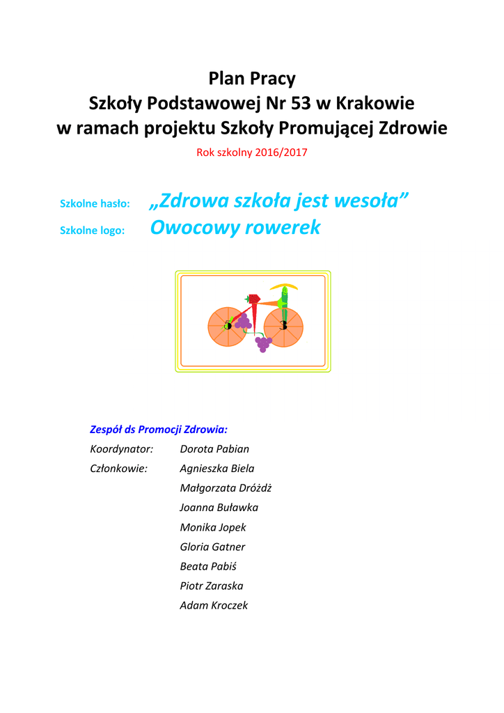 Plan Pracy Szkoły Podstawowej Nr 53 w Krakowie w ramach projektu Szkoły Promującej Zdrowie Rok szkolny 2016/2017 Szkolne hasło: Szkolne logo: „Zdrowa szkoła jest wesoła” Owocowy rowerek Zespół ds Promocji Zdrowia: Koordynator: Dorota Pabian Członkowie: Agnieszka Biela Małgorzata Dróżdż Joanna Buławka Monika Jopek Gloria Gatner Beata Pabiś Piotr Zaraska Adam Kroczek Na podstawie analizy wywiadów, ankiet przeprowadzonych wśród reprezentacji uczniów, rozmów oraz obserwacji dokonano diagnozy wstępnej. Wyłoniono trzy główne problemy priorytetowe w naszej szkole: I. Niewystarczająca znajomość przez uczniów zasad bezpieczeństwa na terenie szkoły. II. Niewystarczający udział uczniów klas IV – VI w różnych formach aktywności ruchowej. III. Złe nawyki żywieniowe wśród uczniów. I. I problem priorytetowy: Niewystarczająca znajomość przez uczniów zasad bezpieczeństwa na ternie szkoły oraz poza szkołą. Przyczyny istnienia problemu: Brak świadomości uczniów o skutkach niebezpiecznych zachowań w szkole. Kryteria sukcesu: Wzrost świadomości uczniów zakresie bezpiecznego zachowania. Cel: Podniesienie poziomu wiedzy o skutkach niebezpiecznego zachowania. Przeprowadzanie szkoleń w zakresie udzielania pierwszej pomocy. Wyrabianie u uczniów nawyku dbania o bezpieczeństwo. Lp Działania – formy realizacji Termin Osoby odpowiedzialne 1. Spotkania ze Strażą Miejską dla klas I - temat: „Bezpieczeństwo w ruchu drogowym autochodzik”, cały rok szkolny Pedagog szkolny 2. Spotkania z Komendą Miejską Policji dla klas I –„Bezpieczeństwo w ruchu drogowym”. cały rok szkolny Pedagog szkolny 3. Spotkania z Policją – Wydział Prewencji dla klas II na temat agresywnych zachowań wśród dzieci. cały rok szkolny Pedagog szkolny 4. Udział z próbnych ewakuacjach przeciwpożarowych szkoły. cały rok szkolny A. Kroczek 5. Udział w warsztatach klas IV nt. „Cyberprzemocy”. (Komenda Miejska Policji) cały rok szkolny Pedagog szkolny 6. Obchody Międzynarodowego Dnia Świadomości Zagrożenia Hałasem. 25 IV 2017 Nauczyciele przyrody 7. Nauka udzielania pierwszej pomocy. Udział w projekcie „Szkoła Młodych Ratowników” IX 2016, III 2017 Pedagog Projekt pod patronatem 8. Zajęcia dla klas IV - VI na temat „Hałas skutki i zapobieganie”. 9. Obchody Dnia Bezpiecznego Internetu. 10. Udział w konkursie „Odblaskowa szkoła” (Wydział Ruchu Drogowego) cały rok szkolny II 2017 cały rok szkolny Pedagog szkolny, wychowawcy cały rok szkolny Nauczyciele dyżurujący Wychowawcy klas V 2017 K. Konopka, P. Zaraska cały rok szkolny Pedagog cały rok szkolny Pedagog Monitorowanie zachowań uczniów w czasie przerw śródlekcyjnych: 11. - eliminowanie hałasu na przerwach szkolnych - indywidualne rozmowy z uczniami, którzy zagrażają bezpieczeństwu. 12. Kurs i egzamin na kartę rowerową. Gminy Miejskiej Kraków Nauczyciele przyrody, Zespół ds. Pr. zdrowia Nauczyciele informatyki Udział w Profilaktycznym Programie Edukacyjnym: „ Nie pal przy mnie, proszę” 13. (klasy I-III), „ Znajdź właściwe rozwiązani (klasy IV)- pod patronatem Sanepidu Udział w akcji edukacyjnej „Moja krew – 14. twoje życie”. II. II problem priorytetowy:. Mały udział uczniów klas IV – VI w różnych formach aktywności ruchowej. Opis problemu: Wysoki procent uczniów klas IV – VI zbyt mało czasu poświęca na aktywne formy spędzania czasu wolnego, (ankiety wykazały iż uczniowie spędzają za dużo czasu przed telewizorem i komputerem). Przyczyny istnienia problemu: brak pełnej świadomości na temat wpływu aktywności fizycznej na zdrowie. Kryteria sukcesu: Wzrost świadomości uczniów na temat właściwego spędzania czasu wolnego i zasad zdrowego stylu życia. Uczniowie chętniej będą korzystać z różnych form aktywności ruchowej w szkole i poza szkołą. Cel: Promowanie różnych form aktywności ruchowej. Budowa nowej sali gimnastycznej. Lp 1. Działania – formy realizacji Udział w zajęciach pozalekcyjnych: piłka nożna, siatkówka, koszykówka, tenis stołowy, siatkówka, piłka ręczna, pływanie, karate, unihokej, gimnastyka korekcyjna. Termin Osoby odpowiedzialne cały rok szkolny nauczyciele wychowania fizycznego cały rok szkolny Wychowawcy 2. Organizowanie obozów sportowych, zielonych szkół, pikników, wycieczek, rajdów. 3. Udział w międzyszkolny zawodach sportowych w ramach Mistrzostw Ligii Dzielnicy VIII. cały rok szkolny nauczyciele wychowania fizycznego 7. Organizowanie wycieczek szkolnych, zielonych szkół, rajdów. cały rok szkolny Wychowawcy 8. Organizowanie przerw śródlekcyjnych dla klas I –III cały rok szkolny Wychowawcy cały rok szkolny Wychowawcy Nauczyciele dyżurujący II 2017 Wychowawcy XII 2016 Nauczyciele przyrody V 2017 Nauczyciele wychowania fizycznego, wychowawcy 9. Zorganizowanie przerwach. zabaw dla uczniów na 10. Zimowy kulig 11. Lekcje otwarte w klasie IV: „Zdrowym być – wpływ hałasu na zdrowie” 12. Wiosenny Turniej Rodzinny pod hasłem „Zdrowa szkoła jest wesoła – ćwiczmy razem” III. III problem priorytetowy: Złe nawyki żywieniowe wśród uczniów. Opis problemu: Uczniowie nie mają utrwalonych dobrych nawyków żywieniowych (spożywanie zbyt dużych ilości słodyczy, picie wysoko słodzonych napojów, nieregularna dieta, częste braki drugiego śniadania, złe wybory żywieniowe). Przyczyny istnienia problemu: Brak umiejętności dokonywania właściwych wyborów w zakresie produktów żywnościowych niezbędnych dla prawidłowego rozwoju, nieznajomość wartościowych produktów żywnościowych dla organizmu, zakup nie zawsze zdrowych produktów w sklepiku szkolnym. Kryteria sukcesu: Większość uczniów zmieni swój styl życia na prozdrowotny. Wykonanie przez uczniów gazetek ściennych i plakatów promujących zdrowy styl życia, aktywne uczestniczenie w różnych formach promocji zdrowia ( pogadanki, opisy, zdjęcia, filmy), poznawanie zasady 