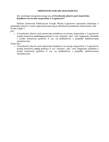 SPROSTOWANIE DO OGŁOSZENIA dot: przetargu nieograniczonego pn.„Utwardzenie placów pod stanowiska handlowe na terenie targowiska w Legionowie” Referat Zamówień Publicznych Urzędu Miasta Legionowo uprzejmie informuje o zaistniałej omyłce w treści ogłoszenia dotyczącej określenia przedmiotu zamówienia i tak: W pkt.4 ppkt 1. jest: ➢ Utwardzenie placów pod stanowiska handlowe na terenie targowiska w Legionowie kostką betonową czerwoną grubości 6 cm i płytami „eko” oraz fragmentu chodnika z kostki betonowej grubości 8 cm, na podbudowie z pospółki stabilizowanej mechanicznie. winno być: ➢ Utwardzenie placów pod stanowiska handlowe na terenie targowiska w Legionowie kostką betonową szarą grubości 6 cm i płytami „eko” oraz fragmentu chodnika z kostki betonowej grubości 8 cm, na podbudowie z pospółki stabilizowanej mechanicznie.