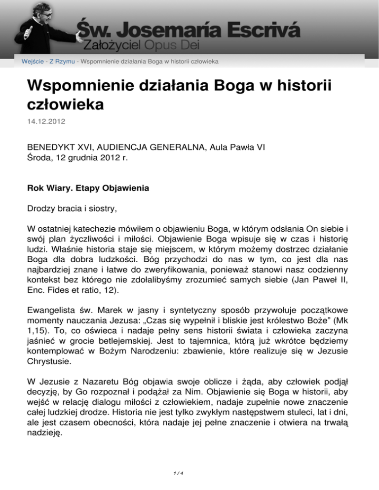 Wejście - Z Rzymu - Wspomnienie działania Boga w historii człowieka Wspomnienie działania Boga w historii człowieka 14.12.2012 BENEDYKT XVI, AUDIENCJA GENERALNA, Aula Pawła VI Środa, 12 grudnia 2012 r. Rok Wiary. Etapy Objawienia Drodzy bracia i siostry, W ostatniej katechezie mówiłem o objawieniu Boga, w którym odsłania On siebie i swój plan życzliwości i miłości. Objawienie Boga wpisuje się w czas i historię ludzi. Właśnie historia staje się miejscem, w którym możemy dostrzec działanie Boga dla dobra ludzkości. Bóg przychodzi do nas w tym, co jest dla nas najbardziej znane i łatwe do zweryfikowania, ponieważ stanowi nasz codzienny kontekst bez którego nie zdołalibyśmy zrozumieć samych siebie (Jan Paweł II, Enc. Fides et ratio, 12). Ewangelista św. Marek w jasny i syntetyczny sposób przywołuje początkowe momenty nauczania Jezusa: „Czas się wypełnił i bliskie jest królestwo Boże” (Mk 1,15). To, co oświeca i nadaje pełny sens historii świata i człowieka zaczyna jaśnieć w grocie betlejemskiej. Jest to tajemnica, którą już wkrótce będziemy kontemplować w Bożym Narodzeniu: zbawienie, które realizuje się w Jezusie Chrystusie. W Jezusie z Nazaretu Bóg objawia swoje oblicze i żąda, aby człowiek podjął decyzję, by Go rozpoznał i podążał za Nim. Objawienie się Boga w historii, aby wejść w relację dialogu miłości z człowiekiem, nadaje zupełnie nowe znaczenie całej ludzkiej drodze. Historia nie jest tylko zwykłym następstwem stuleci, lat i dni, ale jest czasem obecności, która nadaje jej pełne znaczenie i otwiera na trwałą nadzieję. 1/4 Gdzie możemy odczytać etapy Objawienia Boga? Pismo święte jest uprzywilejowanym miejscem odkrywania wydarzeń tej drogi i pragnę po raz kolejny zaprosić wszystkich w tym Roku Wiary, aby częściej brali do ręki Biblię, aby ją czytali i medytowali, a także aby zwrócić większą uwagę na czytania ze Mszy św. niedzielnej. Wszystko to stanowi cenny pokarm dla naszej wiary. Czytając Stary Testament, możemy dostrzec, że interwencje Boga w historię ludu, który sobie wybrał i z którym zawiera przymierze, nie są minionymi faktami, które popadają w zapomnienie, ale stają się „pamiątką”, tworzą „historię zbawienia”, zachowywaną żywo w świadomości ludzi poprzez celebrację wydarzeń zbawczych. I tak w Księdze Wyjścia Pan nakazuje Mojżeszowi świętować wielki moment wyzwolenia z niewoli egipskiej, żydowską Paschę wypowiadając następujące słowa: „Dzień ten będzie dla was dniem pamiętnym i obchodzić go będziecie jako święto dla uczczenia Pana. Po wszystkie pokolenia – na zawsze w tym dniu świętować będziecie” (12,14). Dla całego ludu Izraela przypominanie tego, co Bóg uczynił staje się pewnego rodzaju stałym imperatywem, aby upływający czas naznaczony był żywą pamięcią minionych wydarzeń. W Księdze Powtórzonego Prawa Mojżesz zwraca się do ludu słowami: „Tylko się strzeż bardzo i pilnuj siebie, byś nie zapomniał o tych rzeczach, które widziały twe oczy: by z twego serca nie uszły po wszystkie dni twego życia, ale ucz ich swych synów i wnuków” (4,9). Wiara żywi się odkryciem i pamięcią o Bogu zawsze wiernym, który kieruje historią i ustanawia pewny i stabilny fundament, na którym osadza się własne życie. Także pieśń Magnificat, którą Dziewica Maryja wznosi do Boga jest najwyższym przykładem tej historii zbawienia. Maryja wychwala miłosierne działanie Boga w konkretnym kroczeniu jego ludu, wierność obietnicom przymierza złożonych Abrahamowi i jego potomstwu; a wszystko to jest żywą pamiątką Bożej obecności, która nigdy nie ustaje (por. Łk 1, 46-55). Dla Izraela, Wyjście z Egiptu jest centralnym wydarzeniem historycznym, w który Bóg ukazuje swą potęgę. Bóg wyzwala Izraelitów z niewoli egipskiej, aby mogli powrócić do Ziemi Obiecanej i oddawać mu chwałę jak jedynemu i prawdziwemu Panu. Izrael nie wyrusza po to, aby stać się ludem tak na inne ludy, lecz aby służyć Bogu w kulcie i w życiu i świadczyć o Nim pośród innych ludów. Celebrowanie tego wydarzenia czyni go obecnym i aktualnym, gdyż dzieło Boga nigdy nie ustaje. On jest wierny swemu wyzwalającemu zamiarowi i dalej go realizuje, aby człowiek mógł rozpoznać i służyć swemu Panu i odpowiadać z 2/4 wiarą i miłością na Jego działanie. Bóg więc objawia siebie samego nie tylko w wydarzeniu pierwotnym stworzenia, ale wchodząc w naszą historię, w historię małego ludu, który nie był ani najliczniejszy ani najmocniejszy. To Boże Objawienie osiąga swoją pełnię w Jezusie Chrystusie: Bogu, Logosie, Słowie stwarzającym, które jest na początku świata, wcieliło się w Jezusie i ukazało prawdziwe oblicze Boga. W Jezusie spełnia się każda obietnica, w Nim wypełnia się historia Boża z ludzkością. Kiedy czytamy opowiadanie o dwóch uczniach idących do Emaus, przekazanym nam przez świętego Łukasza, widzimy w sposób jasny, że osoba Chrystusa oświetla Stary Testament, całą historię zbawienia i ukazuje wielki plan jednoczący dwa Testamenty. Jezus, w istocie, tłumaczy dwom wędrowcom zagubionym i rozczarowanym, że jest wypełnieniem każdej obietnicy: „I zaczynając od Mojżesza poprzez wszystkich proroków wykładał im, co we wszystkich Pismach odnosiło się do Niego” (24, 27). Ewangelista przytacza okrzyk dwóch uczniów kiedy rozpoznali, iż towarzyszem ich podróży był Pan: „I mówili nawzajem do siebie: «Czy serce nie pałało w nas, kiedy rozmawiał z nami w drodze i Pisma nam wyjaśniał?»” (32). Katechizm Kościoła Katolickiego streszcza etapy Bożego Objawienia i syntetycznie ukazuje ich rozwój (por. n. 54-64): Bóg zaprosił człowieka od początku do intymnej komunii z Sobą i także wtedy kiedy człowiek, przez własne nieposłuszeństwo, utracił Jego przyjaźń, Bóg nie pozostawił go pod władzą śmierci, ale wiele razy ofiar
