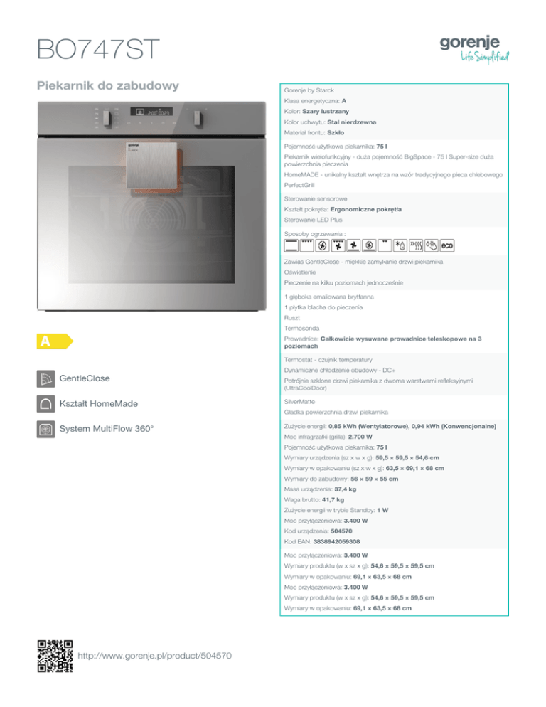 BO747ST Piekarnik do zabudowy Gorenje by Starck Klasa energetyczna: A Kolor: Szary lustrzany Kolor uchwytu: Stal nierdzewna Materiał frontu: Szkło Pojemność użytkowa piekarnika: 75 l Piekarnik wielofunkcyjny - duża pojemność BigSpace - 75 l Super-size duża powierzchnia pieczenia HomeMADE - unikalny kształt wnętrza na wzór tradycyjnego pieca chlebowego PerfectGrill Sterowanie sensorowe Kształt pokrętła: Ergonomiczne pokrętła Sterowanie LED Plus Sposoby ogrzewania : Zawias GentleClose - miękkie zamykanie drzwi piekarnika Oświetlenie Pieczenie na kilku poziomach jednocześnie 1 głęboka emaliowana brytfanna 1 płytka blacha do pieczenia Ruszt Termosonda Prowadnice: Całkowicie wysuwane prowadnice teleskopowe na 3 poziomach Termostat - czujnik temperatury Dynamiczne chłodzenie obudowy - DC+ GentleClose Kształt HomeMade Potrójnie szklone drzwi piekarnika z dwoma warstwami refleksyjnymi (UltraCoolDoor) SilverMatte Gładka powierzchnia drzwi piekarnika System MultiFlow 360° Zużycie energii: 0,85 kWh (Wentylatorowe), 0,94 kWh (Konwencjonalne) Moc infragrzałki (grilla): 2.700 W Pojemność użytkowa piekarnika: 75 l Wymiary urządzenia (sz x w x g): 59,5 × 59,5 × 54,6 cm Wymiary w opakowaniu (sz x w x g): 63,5 × 69,1 × 68 cm Wymiary do zabudowy: 56 × 59 × 55 cm Masa urządzenia: 37,4 kg Waga brutto: 41,7 kg Zużycie energii w trybie Standby: 1 W Moc przyłączeniowa: 3.400 W Kod urządzenia: 504570 Kod EAN: 3838942059308 Moc przyłączeniowa: 3.400 W Wymiary produktu (w x sz x g): 54,6 × 59,5 × 59,5 cm Wymiary w opakowaniu: 69,1 × 63,5 × 68 cm Moc przyłączeniowa: 3.400 W Wymiary produktu (w x sz x g): 54,6 × 59,5 × 59,5 cm Wymiary w opakowaniu: 69,1 × 63,5 × 68 cm http://www.gorenje.pl/product/504570