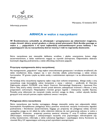 Warszawa, 15 kwietnia 2013 Informacja prasowa ARNICA w walce z naczynkami W Średniowieczu uchodziła za afrodyzjak i przypisywano jej właściwości magiczne, miała chronić zbiory przed gradem, a domy przed piorunami. Dziś Arnika pomaga w walce z … pajączkami. I to tymi najbardziej znienawidzonymi przez kobiety – bo pojawiającymi się na naczynkowej skórze twarzy. I robi to naprawdę skutecznie. Skóra naczynkowa jest niezwykle delikatna, wrażliwa i płytko unaczyniona. Łatwo ulega zaczerwienieniom, a także nadmiernie reaguje na czynniki zewnętrzne. Odpowiednio dobrane kosmetyki złagodzą podrażnienie, a także zlikwidują niechciane pajączki. Przyczyny występowania skóry naczynkowej Na występowanie „pajączków” mają wpływ uwarunkowania genetyczne i wrodzona wrażliwość, ale także niewłaściwa dieta, wiążące się z tym choroby układu pokarmowego, a także zmiany hormonalne. W gronie ryzyka są także osoby z nadciśnieniem tętniczym i te ze skłonnościami do alergii. Na kondycję skóry naczynkowej negatywny wpływ mają duże wahania temperatury, dlatego osoby z cerą naczynkową mają bezwzględny zakaz korzystania z sauny i solarium – podkreśla dr Henryka Dąbrowska, ekspert FLOSLEK oraz lekarz Centrum Dermatologii Estetycznej i laserowej Viva Derm. Taką skórę należy również chronić przed słońcem, zabezpieczać kremami z filtrem, a zimą preparatami ochronnymi. Niepożądane również gorące kąpiele i intensywny wysiłek fizyczny. Ponadto przy skłonności do naczynek trzeba zwrócić uwagę na dietę - unikać używek, bardzo gorących oraz ostrych potraw, często wybierać owoce i warzywa. Pielęgnacja skóry naczynkowej Skóra naczynkowa jest bardzo wymagająca, dlatego niezwykle ważny jest odpowiedni dobór kosmetyków. Kompleksowa pielęgnacja skóry powinna wzmacniać naczynia krwionośne, łagodzić podrażnienia i likwidować zaczerwienienia. Sięgając po preparaty do pielęgnacji należy zwrócić szczególną uwagę na ich skład, bo tylko właściwie dobrany da nam gwarancję sukcesu w walce z „pajączkami”. Skuteczne preparaty powinny zawierać witaminy C oraz P, roślinne substancje obkurczające, wzmacniające i uelastyczniające naczynka oraz poprawiające mikrokrążenie (np. arnikę, kasztanowiec, miłorząb), a także substancje łagodzące i uspokajające skórę. Konieczne są również filtry UV zapewniające ochronę przed czynnikami zewnętrznymi. Marka FLOSLEK PHARMA rozszerzyła cieszącą się wielką popularnością linię kosmetyków ARNICA o preparaty do pielęgnacji skóry naczynkowej, płytko unaczynionej oraz skłonnej do zaczerwień. Nowe preparaty zostały stworzone specjalnie do walki z naczynkami i zawierają wszystkie składniki gwarantujące sukces, z ekstraktem arniki na czele, dzięki któremu naczynka ulegają wzmocnieniu i uszczelnieniu, zmniejsza się ryzyko powstawania opuchnięć i cieni. Kosmetyki z tej serii wzmacniają i uszczelniają naczynka, łagodzą podrażnienia oraz chronią przed wolnymi rodnikami i promieniowaniem UV. Badania wykazały, ze po czterech tygodniach stosowania następuje redukcja rumienia, a koloryt skóry wyrównuje się. Marka FLOSLEK zadbała również o to, by pielęgnując cerę naczynkową można było równocześnie dbać o jej nawilżenie i chronić przed przedwczesnym starzeniem. Kosmetyki z linii Arnica: Nawilżający krem arnikowy SPF 15 Krem polecany jest do codziennej pielęgnacji płytko unaczynionej skóry, wymagającej nawilżenia i ochrony. Intensywnie nawilża oraz chroni barierę lipidową naskórka. Obkurcza, uszczelnia i wzmacnia naczynka krwionośne, łagodzi podrażnienia. Zabezpiecza również skórę przed działaniem promieniowania UV. Jest bezzapachowy, nie zawiera parabenów i alergenów. Sugerowana cena 19,99 zł Przeciwzmarszczkowy krem arnikowy Kosmetyk polecany jest do codziennej pielęgnacji dojrzałej, płytko unaczynionej skóry twarzy, szyi i dekoltu, z widocznymi zmarszczkami. Przywraca odpowiednie jej nawilżenie i napięcie oraz chroni przed utratą jędrności i elastyczności, a także zapobiega powstawaniu zmarszczek. Wzmacnia naczynka krwionośne, poprawia mikrokrążenie skóry oraz likwiduje zaczerwienienia i łagodzi podrażnienia. Nie zawiera parabenów, alergenów oraz barwników. Jest bezzapachowy. Sugerowana cena 19,99 zł Krem pod oczy arnikowy Krem polecany jest do codziennej pielęgnacji płytko unaczynionej skóry wokół oczu z widocznymi cieniami i zmarszczkami, skłonnej do podpuchnięć. Rozjaśnia, wygładza i uelastycznia skórę. Poprawia jej nawilżenie i napięcie wokół oczu. Zapobiega również powstawaniu zmarszczek, cieni i worków pod oczami. Działa także wzmacniająco na ścianki naczynek krwionośnych. Jest bezzapachowy, wolny od parabenów, alergenów i barwników. Sugerowana cena 17,50 zł FLOSLEK Pharma jest marką specjalistycznych dermokosmetyków stworzonych dla skóry problematycznej, wymagającej szczególnej pielęgnacji. Formuły preparatów FLOSLEK Pharma zostały przebadane przez akredytowane laboratoria badawcze i przetestowane pod nadzorem dermatologów przez osoby o skórze wrażliwej i skłonnej do alergii. Dermokosmetyki FLOSLEK gwarantują wysoką jakość, skuteczność i bezpieczeństwo stosowania. Charakteryzują się nie tylko wysoką efektywnością, ale również doskonałymi właściwościami aplikacyjnymi. Produkty Marki FLOSLEK Pharma są dostępne w aptekach. Serwis PR: Magdalena Ćwikła KiS Production Sp. z o.o. ul. Klimczaka 5 lok. 52 02-797 Warszawa tel.: 0-785-409-803 e-mail: [email protected] www.kisp.pl