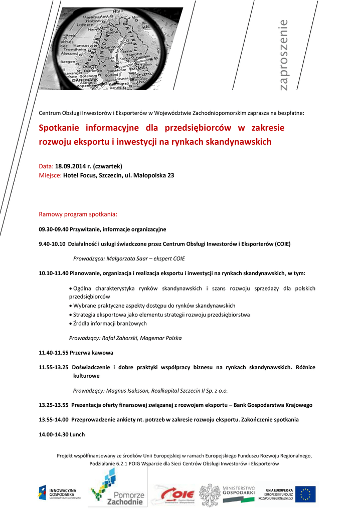 zaproszenie Centrum Obsługi Inwestorów i Eksporterów w Województwie Zachodniopomorskim zaprasza na bezpłatne: Spotkanie informacyjne dla przedsiębiorców w zakresie rozwoju eksportu i inwestycji na rynkach skandynawskich Data: 18.09.2014 r. (czwartek) Miejsce: Hotel Focus, Szczecin, ul. Małopolska 23 Ramowy program spotkania: 09.30-09.40 Przywitanie, informacje organizacyjne 9.40-10.10 Działalność i usługi świadczone przez Centrum Obsługi Inwestorów i Eksporterów (COIE) Prowadząca: Małgorzata Saar – ekspert COIE 10.10-11.40 Planowanie, organizacja i realizacja eksportu i inwestycji na rynkach skandynawskich, w tym: Ogólna charakterystyka rynków skandynawskich i szans rozwoju sprzedaży dla polskich przedsiębiorców Wybrane praktyczne aspekty dostępu do rynków skandynawskich Strategia eksportowa jako elementu strategii rozwoju przedsiębiorstwa Źródła informacji branżowych Prowadzący: Rafał Zahorski, Magemar Polska 11.40-11.55 Przerwa kawowa 11.55-13.25 Doświadczenie i dobre praktyki współpracy biznesu na rynkach skandynawskich. Różnice kulturowe Prowadzący: Magnus Isaksson, Realkapital Szczecin II Sp. z o.o. 13.25-13.55 Prezentacja oferty finansowej związanej z rozwojem eksportu – Bank Gospodarstwa Krajowego 13.55-14.00 Przeprowadzenie ankiety nt. potrzeb w zakresie rozwoju eksportu. Zakończenie spotkania 14.00-14.30 Lunch Projekt współfinansowany ze środków Unii Europejskiej w ramach Europejskiego Funduszu Rozwoju Regionalnego, Podziałanie 6.2.1 POIG Wsparcie dla Sieci Centrów Obsługi Inwestorów i Eksporterów