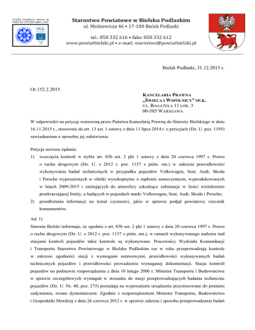 Bielsk Podlaski, 31.12.2015 r. Or.152.2.2015 KANCELARIA PRAWNA „ŚWIECA I WSPÓLNICY” SP.K. UL. BAGATELA 11 LOK. 3 00-585 WARSZAWA W odpowiedzi na petycję wniesioną przez Państwa Kancelarię Prawną do Starosty Bielskiego w dniu 16.11.2015 r., stosownie do art. 13 ust. 1 ustawy z dnia 11 lipca 2014 r. o petycjach (Dz. U. poz. 1195) zawiadamiam o sposobie jej załatwienia. Petycja zawiera żądania: 1) wszczęcia kontroli w trybie art. 83b ust. 2 pkt 1 ustawy z dnia 20 czerwca 1997 r. Prawo o ruchu drogowym (Dz. U. z 2012 r. poz. 1137 z późn. zm.) w zakresie prawidłowości wykonywania badań technicznych w przypadku pojazdów Volkswagen, Seat, Audi, Skoda i Porsche wyposażonych w silniki wysokoprężne o zapłonie samoczynnym, wyprodukowanych w latach 2009-2015 i emitujących do atmosfery szkodzące substancje w ilości wielokrotnie przekraczającej limity, a będących w pojazdach marki Volkswagen, Seat, Audi, Skoda i Porsche; 2) przedłożenia informacji na temat czynności, jakie w sprawie podjął powiatowy rzecznik konsumentów. Ad. 1) Starosta Bielski informuje, że zgodnie z art. 83b ust. 2 pkt 1 ustawy z dnia 20 czerwca 1997 r. Prawo o ruchu drogowym (Dz. U. z 2012 r. poz. 1137 z późn. zm.), w ramach wykonywanego nadzoru nad stacjami kontroli pojazdów takie kontrole są wykonywane. Pracownicy Wydziału Komunikacji i Transportu Starostwa Powiatowego w Bielsku Podlaskim raz w roku przeprowadzają kontrole w zakresie zgodności stacji z wymogami ustawowymi, prawidłowości wykonywanych badań technicznych pojazdów i prawidłowości prowadzenia wymaganej dokumentacji. Stacje kontroli pojazdów na podstawie rozporządzenia z dnia 10 lutego 2006 r. Ministra Transportu i Budownictwa w sprawie szczegółowych wymagań w stosunku do stacji przeprowadzających badania techniczne pojazdów (Dz. U. Nr. 40, poz. 275) posiadają na wyposażeniu urządzenie przystosowane do pomiaru zadymienia, zwane dymomierzem. Zgodnie z rozporządzeniem Ministra Transportu, Budownictwa i Gospodarki Morskiej z dnia 26 czerwca 2012 r. w sprawie zakresu i sposobu przeprowadzania badań technicznych pojazdów oraz wzorów dokumentów stosowanych przy tych badaniach (Dz. U. z 2015 r. poz. 776 z późn. zm.) diagnosta jest zobowiązany do sprawdzenia i oceny stanu technicznego układu wydechowego, emisji zanieczyszczeń gazowych lub zadymienia spalin. W dniu 17.12.2015 r. Starosta Bielski, jako sprawujący nadzór nad stacjami kontroli pojazdów w granicach Powiatu Bielskiego, wystosował pismo do wszystkich stacji kontroli pojazdów nakazujące ścisłe przestrzeganie rozdziału III cytowanego wyżej rozporządzenia: Pomiar zadymienia spalin pojazdów z silnikiem o zapłonie samoczynnym i niedopuszczania do ruchu pojazdów przekraczających określone normy. Według informacji Federalnego Urzędu Transportu Drogowego we Flensburgu w Niemczech koncern VW wzywa do serwisu około 2,5 mln właścicieli aut ze zmanipulowanymi silnikami. Mając powyższe na uwadze, Starosta Bielski poprzestanie na ścisłej kontroli stacji kontroli pojazdów pod względem przeprowadzanych badań technicznych pojazdów odnośnie spełniania norm prawnych dotyczących bezpieczeństwa i ochrony środowiska. Ad. 2) Podstawowym aktem prawnym, ustanawiającym instytucję powiatowego rzecznika konsumentów, określającym jego zadania, jak i wyposażającym go w odpowiednie uprawnienia jest ustawa z dnia 16 lutego 2007 roku o ochronie konkurencji i konsumentów (Dz. U. z 2015 r. poz. 184, z późn. zm.). Ustawowym zadaniem rzeczników jest przede wszystkim zapewnienie bezpłatnego poradnictwa konsumenckiego oraz występowanie do przedsiębiorców w sprawach z zakresu ochrony praw i interesów konsumentów. Jednak należy podkreślić, że rzecznik konsumentów nie wszczyna działań z urzędu. Zakres działań podejmowanych przez rzecznika wyznacza indywidualny wniosek konsumenta. Do Powiatowego Rzecznika Konsumentów w Bielsku Podlaskim żaden wniosek sygnalizujący problem opisany w petycji nie został złożony. Dodatkowo wyjaśnia się, że Prezes Urzędu Ochrony Konkurencji i Konsumentów, który jest organem właściwym w sprawach dotyczących naruszenia zbiorowych interesów konsumentów, wszczął postępowanie wyjaśniające w sprawie manipulowania wskaźnikiem emisji spalin w samochodach koncernu Volkswagen. Wyniki tego postępowania będą mogły mieć istotne znaczenie dla konsumentów w zakresie wyboru podstaw prawnych dochodzenia ewentualnych roszczeń, tj. z tytułu niezgodności towaru z umową, odpowiedzialności z tytuły rękojmi, uchylenia się od skutków prawnych oświadczenia woli złożonego pod wpływem błędu, czy też odpowiedzialności z tytułu zastosowania wobec konsumentów nieuczciwej praktyki rynkowej. Powiatowy Rzecznik Konsumentów w Bielsku Podlaskim zapewnia, że każdemu konsumentowi, który indywidualnie zgłosi do rzecznika problem opisany w petycji, w ramach ustawowych kompetencji rzecznika zostanie udzielona stosowna pomoc prawna. Z up. STAROSTY mgr Ryszard Anusiewicz Sekretarz Powiatu 2