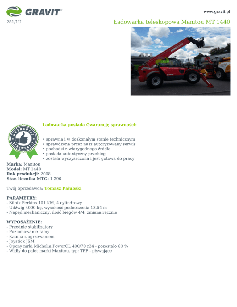 www.gravit.pl Ładowarka teleskopowa Manitou MT 1440 281/LU Ładowarka posiada Gwarancję sprawności: • sprawna i w doskonałym stanie technicznym • sprawdzona przez nasz autoryzowany serwis • pochodzi z wiarygodnego źródła • posiada autentyczny przebieg • została wyczyszczona i jest gotowa do pracy Marka: Manitou Model: MT 1440 Rok produkcji: 2008 Stan licznika MTG: 1 290 Twój Sprzedawca: Tomasz Pałubski PARAMETRY: - Silnik Perkins 101 KM, 4 cylindrowy - Udźwig 4000 kg, wysokość podnoszenia 13,54 m - Napęd mechaniczny, ilość biegów 4/4, zmiana ręcznie WYPOSAŻENIE: - Przednie stabilizatory - Poziomowanie ramy - Kabina z ogrzewaniem - Joystick JSM - Opony mrki Michelin PowerCL 400/70 r24 - pozostało 60 % - Widły do palet marki Manitou, typ: TFF - pływające
