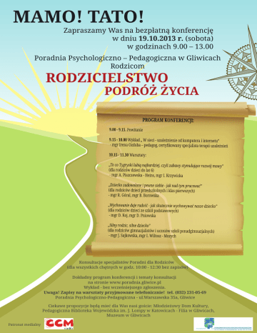 MAMO! TATO! Zapraszamy Was na bezpłatną konferencję w dniu 19.10.2013 r. (sobota) w godzinach 9.00 – 13.00 Poradnia Psychologiczno – Pedagogiczna w Gliwicach Rodzicom RODZICIELSTWO PODRÓŻ ŻYCIA PROGRAM KONFERENCJI: 9.00 - 9.15. Powitanie 9.15 - 10.00 Wykład „ W sieci - uzależnienie od komputera i internetu” - mgr Irena Ozdoba – pedagog, certyfikowany specjalista terapii uzależnień 10.15 - 11.30 Warsztaty: „To co Tygryski lubią najbardziej, czyli zabawy stymulujące rozwój mowy” (dla rodziców dzieci do lat 6) - mgr A. Piszczewska - Heins, mgr I. Krzywicka „Dziecko zadowolone i pewne siebie - jak nad tym pracować” (dla rodziców dzieci przedszkolnych i klas pierwszych) - mgr R. Góral, mgr B. Borowska „Wychowanie daje radość - jak skutecznie wychowywać nasze dziecko” (dla rodziców dzieci ze szkół podstawowych) - mgr D. Koj, mgr D. Pniowska „Silny rodzic, silne dziecko” (dla rodziców gimnazjalistów i uczniów szkół ponadgimnazjalnych) - mgr J. Sajkowska, mgr I. Wiltosz - Mozych Konsultacje specjalistów Poradni dla Rodziców (dla wszystkich chętnych w godz. 10:00 - 12:30 bez zapisów) Dokładny program konferencji i tematy konsultacji na stronie www.poradnia.gliwice.pl Wykład - bez wcześniejszego zgłoszenia. Uwaga! Zapisy na warsztaty przyjmowane telefonicznie! tel. (032) 231-05-69 Poradnia Psychologiczno-Pedagogiczna - ul.Warszawska 35a, Gliwice Ciekawe propozycje będą mieć dla Was nasi goście: Młodzieżowy Dom Kultury, Pedagogiczna Biblioteka Wojewódzka im. J. Lompy w Katowicach - Filia w Gliwicach, Muzeum w Gliwicach Patronat medialny