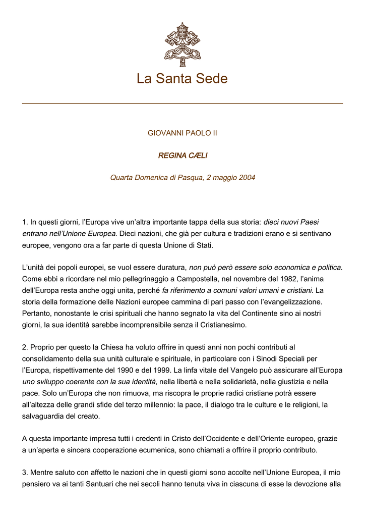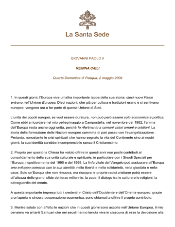 La Santa Sede GIOVANNI PAOLO II REGINA CÆLI Quarta Domenica di Pasqua, 2 maggio 2004 1. In questi giorni, l’Europa vive un’altra importante tappa della sua storia: dieci nuovi Paesi entrano nell’Unione Europea. Dieci nazioni, che già per cultura e tradizioni erano e si sentivano europee, vengono ora a far parte di questa Unione di Stati. L’unità dei popoli europei, se vuol essere duratura, non può però essere solo economica e politica. Come ebbi a ricordare nel mio pellegrinaggio a Campostella, nel novembre del 1982, l’anima dell’Europa resta anche oggi unita, perché fa riferimento a comuni valori umani e cristiani. La storia della formazione delle Nazioni europee cammina di pari passo con l’evangelizzazione. Pertanto, nonostante le crisi spirituali che hanno segnato la vita del Continente sino ai nostri giorni, la sua identità sarebbe incomprensibile senza il Cristianesimo. 2. Proprio per questo la Chiesa ha voluto offrire in questi anni non pochi contributi al consolidamento della sua unità culturale e spirituale, in particolare con i Sinodi Speciali per l’Europa, rispettivamente del 1990 e del 1999. La linfa vitale del Vangelo può assicurare all’Europa uno sviluppo coerente con la sua identità, nella libertà e nella solidarietà, nella giustizia e nella pace. Solo un’Europa che non rimuova, ma riscopra le proprie radici cristiane potrà essere all’altezza delle grandi sfide del terzo millennio: la pace, il dialogo tra le culture e le religioni, la salvaguardia del creato. A questa importante impresa tutti i credenti in Cristo dell’Occidente e dell’Oriente europeo, grazie a un’aperta e sincera cooperazione ecumenica, sono chiamati a offrire il proprio contributo. 3. Mentre saluto con affetto le nazioni che in questi giorni sono accolte nell’Unione Europea, il mio pensiero va ai tanti Santuari che nei secoli hanno tenuta viva in ciascuna di esse la devozione alla 2 Vergine Maria. Alla Madonna, Madre della speranza, e ai Santi e alle Sante che veneriamo come Patroni d’Europa affidiamo il presente e il futuro del Continente. Dopo il Regina Caeli Parole di saluto ai pellegrini in Piazza S. Pietro, all’Episcopato Polacco e ai Rappresentanti degli Episcopati europei, raccolti in preghiera sulla spianata Pola Wilanowskie di Varsavia, in occasione dell’ingresso nell’Unione Europea di dieci nuovi Paesi, tra cui la Polonia: W dniu wczorajszym, dzięki przemianom zapoczątkowanym w Polsce, Unia Europejska powiększyła się o 10 nowych państw, które chcą ściśle ze sobą współpracować na terenie Europy i całego świata. To wydarzenie objęte jest modlitwą, która w tej chwili trwa na Polach Wilanowskich w Warszawie. Na terenie wznoszonej świątyni Opatrzności Bożej modli się Episkopat Polski, modlą się obecni tam przedstawiciele Episkopatów Europy, a Mszy św. przewodniczy kard. Egan z Nowego Jorku. Modlitwę tę wspierają święci Europy: ich relikwie są obecne na miejscu celebry. Pozdrawiam wszystkich kardynałów, biskupów, duchowieństwo i świeckich. Pozdrawiam najwyższe władze państwa polskiego, samorządy i odpowiedzialnych za życie cywilne oraz dyplomatów z różnych krajów. Razem z wami zawierzam Bożej Opatrzności, mądrej, sprawiedliwej i miłosiernej, przyszłość Europy. Niech wzrasta na fundamencie miłości Chrystusa. Pozdrawiam pielgrzymów obecnych na placu św. Piotra i wszystkich, którzy łaczą się z nami przez radio i telewizję. Z Wolbromia — parafię Świętego Krzyża, ze Staszowa — Liceum im. kard. Stefana Wyszyńskiego, z Warszawy — Duszpasterstwo Księży Pallotynów, wspólnoty neokatechumenalne z Warszawy, Gdyni i Puław. Niech Bóg wszystkim błogosławi! Traduzione italiana delle parole del Papa sul ruolo avuto dalla Polonia nell'ampliamento dell'Unione Europea: Ieri, grazie alle trasformazioni iniziate in Polonia, l'Unione Europea si è allargata con i 10 paesi nuovi che vogliono strettamente collaborare tra di loro sul territorio dell'Europa e di tutto il mondo. Quest'evento viene accompagnato dalla preghiera che in questo momento si svolge sulla spianata Pola Wilanowskie di Varsavia. In quel luogo dove è in costruzione il Tempio della Divina Provvidenza l'Episcopato Polacco e i rappresentanti degli Episcopati europei pregano e viene celebrata la S. Messa presieduta dal card. Egan di New York. La preghiera viene appoggiata dall’intercessione dei santi: infatti, le loro reliquie sono esposte sul luogo della cerimonia. Saluto tutti i cardinali, vescovi, religiosi e laici. Saluto le autorità supreme dello Stato polacco, le 3 autorità locali, responsabili della vita civile e rappresentanti diplomatici di vari Paesi. Insieme con voi affido alla saggia, giusta e misericordiosa Provvidenza Divina il futuro dell'Europa. Essa cresca sul fondamento dell'amore di Cristo. Saluto i pellegrini presenti in piazza San Pietro e tutti coloro che si uniscono a noi tramite la radio e la televisione. Da Wolbrom — la parrocchia della Santa Croce, da Staszów — il Liceo Cardinal Stefan Wyszyński, da Varsavia — la Pastorale dei Padri Pallottini, le comunità neocatecumenali giunte da Varsavia, Gdynia e Puławy. Dio vi benedica tutti! Questa mattina, nella Basilica di San Pietro, ho ordinato ventisei nuovi Sacerdoti. Ad essi e ai loro familiari ed amici rinnovo il mio cordiale saluto. Possano essere sempre, in mezzo al Popolo di Dio, immagine viva di Cristo, Buon Pastore. Si celebra oggi la Giornata mondiale di preghiera per le Vocazioni. Rivolgo uno speciale pensiero a quanti, sono impegnati nel cammino di formazione al sacerdozio e alla vita consacrata; e invito a pregare perché non manchino mai numerose e sante vocazioni nella Chiesa. Saludo cordialmente a los peregrinos de lengua española, en particular al grupo parroquial de San Roque, de Sevilla. En este domingo del Buen Pastor, renuevo a todos la invitación a orar por las vocaciones al sacerdocio y a la vida consagrada. Feliz domingo.