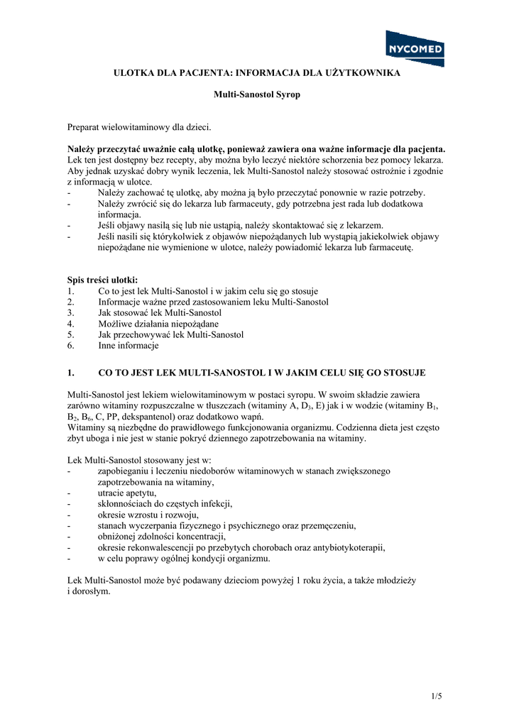 ULOTKA DLA PACJENTA: INFORMACJA DLA UŻYTKOWNIKA Multi-Sanostol Syrop Preparat wielowitaminowy dla dzieci. Należy przeczytać uważnie całą ulotkę, ponieważ zawiera ona ważne informacje dla pacjenta. Lek ten jest dostępny bez recepty, aby można było leczyć niektóre schorzenia bez pomocy lekarza. Aby jednak uzyskać dobry wynik leczenia, lek Multi-Sanostol należy stosować ostrożnie i zgodnie z informacją w ulotce. Należy zachować tę ulotkę, aby można ją było przeczytać ponownie w razie potrzeby. Należy zwrócić się do lekarza lub farmaceuty, gdy potrzebna jest rada lub dodatkowa informacja. Jeśli objawy nasilą się lub nie ustąpią, należy skontaktować się z lekarzem. Jeśli nasili się którykolwiek z objawów niepożądanych lub wystąpią jakiekolwiek objawy niepożądane nie wymienione w ulotce, należy powiadomić lekarza lub farmaceutę. Spis treści ulotki: 1. Co to jest lek Multi-Sanostol i w jakim celu się go stosuje 2. Informacje ważne przed zastosowaniem leku Multi-Sanostol 3. Jak stosować lek Multi-Sanostol 4. Możliwe działania niepożądane 5. Jak przechowywać lek Multi-Sanostol 6. Inne informacje 1. CO TO JEST LEK MULTI-SANOSTOL I W JAKIM CELU SIĘ GO STOSUJE Multi-Sanostol jest lekiem wielowitaminowym w postaci syropu. W swoim składzie zawiera zarówno witaminy rozpuszczalne w tłuszczach (witaminy A, D3, E) jak i w wodzie (witaminy B1, B2, B6, C, PP, dekspantenol) oraz dodatkowo wapń. Witaminy są niezbędne do prawidłowego funkcjonowania organizmu. Codzienna dieta jest często zbyt uboga i nie jest w stanie pokryć dziennego zapotrzebowania na witaminy. Lek Multi-Sanostol stosowany jest w: zapobieganiu i leczeniu niedoborów witaminowych w stanach zwiększonego zapotrzebowania na witaminy, utracie apetytu, skłonnościach do częstych infekcji, okresie wzrostu i rozwoju, stanach wyczerpania fizycznego i psychicznego oraz przemęczeniu, obniżonej zdolności koncentracji, okresie rekonwalescencji po przebytych chorobach oraz antybiotykoterapii, w celu poprawy ogólnej kondycji organizmu. Lek Multi-Sanostol może być podawany dzieciom powyżej 1 roku życia, a także młodzieży i dorosłym. 1/5 2. ZANIM ZASTOSUJE SIĘ LEK MULTI-SANOSTOL Kiedy nie stosować leku Multi-Sanostol Jeśli u pacjenta stwierdzono uczulenie (nadwrażliwość) na substancje czynne lub którykolwiek z pozostałych składników leku. Jeśli u pacjenta występują rzadkie dziedziczne zaburzenia związane z nietolerancją fruktozy, zespołem złego wchłaniania glukozy-galaktozy, niedoborem sacharazy-izomaltazy, zwiększone stężenie wapnia we krwi (hiperkalcemia), zwiększone wydalanie wapnia z moczem (hiperkalcynuria), zwiększone stężenie witaminy A lub D (hiperwitaminoza A lub D). Kiedy zachować szczególną ostrożność stosując lek Multi-Sanostol Multi-Sanostol nie powinien być stosowany w większych dawkach niż zalecane u osób z kamicą nerkową bądź cierpiących na sarkoidozę (choroba Boeck’a). W tych przypadkach przed zastosowaniem leku należy zasięgnąć porady lekarza. W przypadku długotrwałego stosowania nie wolno przekraczać zalecanego dawkowania. Stosowanie leku Multi-Sanostol w dawkach większych niż zalecane może doprowadzić do przedawkowania witamin A lub D, szczególnie przy jego jednoczesnym stosowaniu z innymi lekami zawierającymi te witaminy. W przypadku specyficznych niedoborów poszczególnych witamin należy skontaktować się z lekarzem. Przy stosowaniu leku Multi-Sanostol może wystąpić żółte zabarwienie moczu, które jest spowodowane zawartością witamin z grupy B. Jeżeli stwierdzono wcześniej u pacjenta nietolerancję niektórych cukrów, pacjent powinien skontaktować się z lekarzem przed przyjęciem leku. Uwaga Informacja dla chorych na cukrzycę: 10 ml leku Multi-Sanostol zawiera 6,55 g sacharozy (cukru) i 1,31 g glukozy, co jest równoważne około 0,66 jednostki węglowodanowej. Ze względu na zawartość witamin rozpuszczalnych w tłuszczach oraz w wodzie syrop może ulegać rozwarstwieniu. Stan ten nie wpływa na jakość leku. W przypadku rozwarstwienia butelkę należy wstrząsnąć przed użyciem. Stosowanie leku Multi-Sanostol z innymi lekami Należy poinformować lekarza lub farmaceutę o wszystkich przyjmowanych ostatnio lekach, nawet tych, które są wydawane bez recepty. Przy stosowaniu zalecanych dawek nie zaobserwowano specyficznych interakcji. Przy jednoczesnym stosowaniu preparatów zawierających witaminy A lub D istnieje ryzyko ich przedawkowania. Istnieje ryzyko wystąpienia hiperkalcemii (zwiększonego stężenia wapnia we krwi) przy jednoczesnym stosowaniu tiazydów (leków zwiększających wydzielanie wody z organizmu). 2/5 W przypadku zwiększonego stężenia wapnia we krwi i jednoczesnego stosowania preparatów naparstnicy mogą pojawić się zaburzenia rytmu serca. Witamina B6 w dobowej dawce 5 mg lub większej może ograniczać skuteczność L-dopy (leku stosowanego w leczeniu choroby Parkinsona). Ciąża i karmienie piersią Przed zastosowaniem każdego leku należy poradzić się lekarza lub farmaceuty. Ze względu na ryzyko uszkodzenia płodu, należy unikać przedawkowania witaminy A w okresie ciąży. Podobnie, w przypadku długotrwałego przedawkowania witaminy D rezultatem jest podwyższony poziom wapnia we krwi mogący doprowadzić do zmian fizycznych i psychicznych dziecka. Dlatego też kobiety w ciąży oraz karmiące piersią nie powinny samodzielnie podejmować decyzji o przyjmowaniu leku. W okresie ciąży i karmienia piersią nie należy przekraczać dobowej dawki leku. Prowadzenie pojazdów i obsługa maszyn Przyjmowanie leku Multi-Sanostol nie wpływa na zdolność kierowania pojazdami mechanicznymi, obsługę maszyn i urządzeń będących w ruchu. 3. JAK STOSOWAĆ LEK MULTI-SANOSTOL Do stosowania doustnego. Przed użyciem butelkę należy wstrząsnąć. Dzieci od 1. do 5. roku życia: 2 razy na dobę po 5 ml syropu. Dzieci w wieku od 6 lat, młodzież i dor
