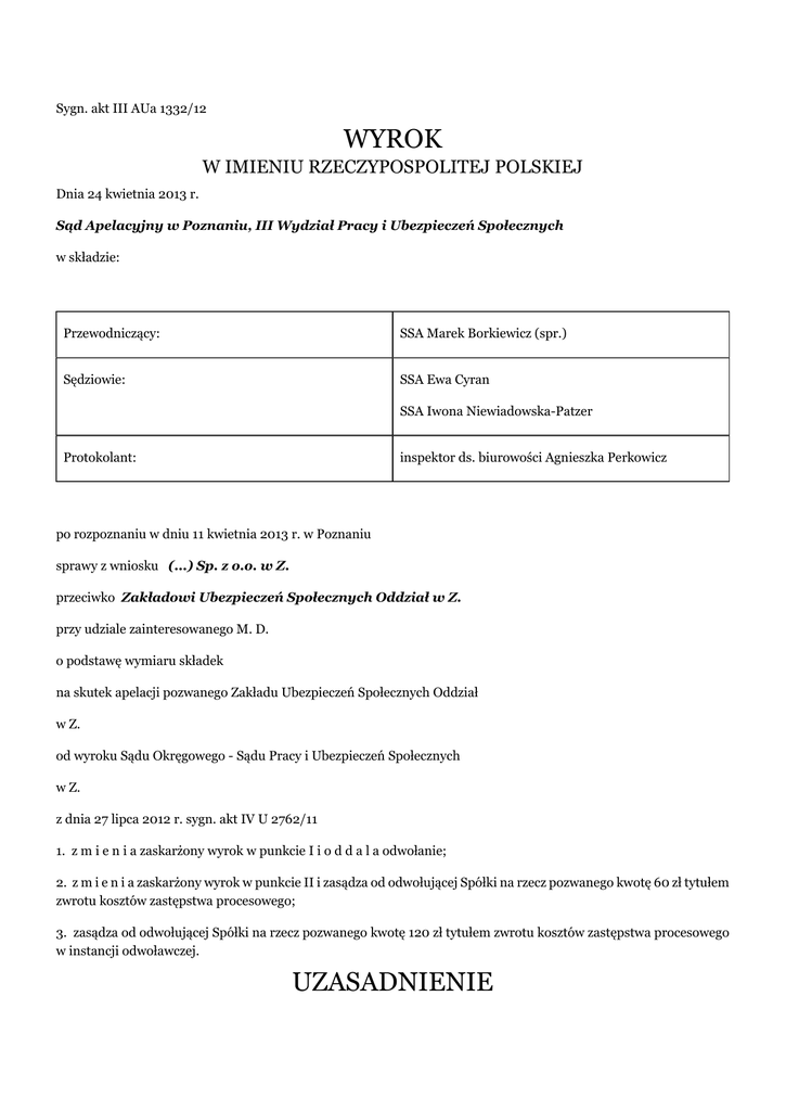 Sygn. akt III AUa 1332/12 WYROK W IMIENIU RZECZYPOSPOLITEJ POLSKIEJ Dnia 24 kwietnia 2013 r. Sąd Apelacyjny w Poznaniu, III Wydział Pracy i Ubezpieczeń Społecznych w składzie: Przewodniczący: SSA Marek Borkiewicz (spr.) Sędziowie: SSA Ewa Cyran SSA Iwona Niewiadowska-Patzer Protokolant: inspektor ds. biurowości Agnieszka Perkowicz po rozpoznaniu w dniu 11 kwietnia 2013 r. w Poznaniu sprawy z wniosku (...) Sp. z o.o. w Z. przeciwko Zakładowi Ubezpieczeń Społecznych Oddział w Z. przy udziale zainteresowanego M. D. o podstawę wymiaru składek na skutek apelacji pozwanego Zakładu Ubezpieczeń Społecznych Oddział w Z. od wyroku Sądu Okręgowego - Sądu Pracy i Ubezpieczeń Społecznych w Z. z dnia 27 lipca 2012 r. sygn. akt IV U 2762/11 1. z m i e n i a zaskarżony wyrok w punkcie I i o d d a l a odwołanie; 2. z m i e n i a zaskarżony wyrok w punkcie II i zasądza od odwołującej Spółki na rzecz pozwanego kwotę 60 zł tytułem zwrotu kosztów zastępstwa procesowego; 3. zasądza od odwołującej Spółki na rzecz pozwanego kwotę 120 zł tytułem zwrotu kosztów zastępstwa procesowego w instancji odwoławczej. UZASADNIENIE Decyzją z dnia 05.07.2011r. znak (...) Zakład Ubezpieczeń Społecznych Oddział w Z. stwierdził, że podstawę wymiaru składek na ubezpieczenie społeczne tj. emerytalne, chorobowe, wypadkowe M. D. z tytułu zatrudnienia u płatnika składek (...) Spółka z o.o. w Z. stanowią kwoty wymienione w tej decyzji. (...) Spółka z o.o. w Z. odwołała się od w/w decyzji wskazując, że organ rentowy dokonał nieprawidłowego, niezgodnego z obowiązującymi przepisami określenia podstawy wymiaru składek na ubezpieczenia społeczne pracowników delegowanych do pracy za granicą. W odpowiedzi na odwołanie, organ rentowy wniósł o jego oddalenie, podtrzymując argumentację zawartą w zaskarżonych decyzjach. Sąd wezwał do udziału w sprawie M. D., jako zainteresowanego. Sąd Okręgowy w Zielonej Górze IV Wydział Pracy i Ubezpieczeń Społecznych wyrokiem z dnia 27.07.2012r. zmienił zaskarżoną decyzję w ten sposób, że ustalił, iż koszt zakwaterowania M. D., zatrudnionego u polskiego pracodawcy (...) Sp. z o.o. w Z. poza granicami kraju w okresach i kwotach przyjętych przez organ rentowy w zaskarżonej decyzji, nie stanowią podstawy wymiaru składek na ubezpieczenia społeczne oraz zasądził od pozwanego Zakładu Ubezpieczeń Społecznych Oddział w Z. na rzecz odwołującego (...) Sp. z o.o. w Z. kwotę 60 złotych tytułem zwrotu kosztów zastępstwa procesowego. Rozpoznając odwołania Sąd Okręgowy ustalił następujący stan faktyczny: (...) Spółka z o.o. z siedzibą w Z. prowadzi działalność gospodarczą polegającą na przetwarzaniu i konserwacji mięsa oraz produkcji mięsa na terenie kraju i za granicą. Spółka posiada oddział w Republice Federalnej Niemiec - M. W. (...), (...) D.. Spółka w okresie 2007-2010 zawierała kontrakty na świadczenie usług w Rzeczypospolitej Polskiej oraz w Republice Federalnej Niemiec. W okresie od 2007-2010 płatnik składek zatrudniał pracowników, którzy byli delegowani do pracy w Republice Federalnej Niemiec: w okresie od V/2007 r. do XII/2007 r. - 47 pracowników, w okresie od 1/2008 r. do VII/2008 r. 100 pracowników, w okresie od 1/2009 r. do XII/2009 r. - 99 pracowników, w okresie od 1/2010 r. do IV/2010 r. - 73 pracowników. Odwołujący w ramach prowadzonej działalności w Niemczech, gwarantował pracownikom kwatery dla pracowników i wynajmował w Niemczech budynki, w których zamieszkiwali pracownicy. Pracodawca każdorazowo finansował koszty noclegów, płacąc za te noclegi właścicielom kwater na podstawie wystawionych faktur w języku niemieckim. Dokumenty księgowe potwierdzające te płatności stanowią element dokumentacji księgowej płatnika. Koszty noclegów pracowników nie były doliczone do przychodu i nie odprowadzano od nich składki na ubezpieczenie społeczne. Odwołujący w C. wynajmował w okresie od 2007 do 2010 r. m.in. 3 piętrowy budynek z łączną ilością 15 pokoi o łącznej powierzchni 450 m2. Budynek zawierał 36 miejsc noclegowych. Czynsz miesięczny wynosił łącznie 1764,04 euro. Koszt najmu nie miał związku z liczbą osób tam zakwaterowanych. Z tego budynku firma korzystała w ten sposób, że 6 pokoi było użytkowane wyłącznie na potrzeby firmy, (biura, pomieszczenia socjalne, warsztat do naprawy narzędzi i kolczug, pralnia suszarnia), pozostałe 9 były to pokoje noclegowe. Pokoje noclegowe posiadały różną wielkość i różny standard. W pokojach nocowało od 4 do 5 pracowników. Pracownicy zjeżdżali na weekendy do domów. Firma nie prowadziła ewidencji kiedy pracownicy zjeżdżali do domów na dni wolne od pracy. W ramach zawartej umowy o pracę zainteresowany M. D. w okresie od XII 2007, X 2008, XI-2008 został oddelegowany do pracy na terenie Niemiec. M. D. w okresie delegacji był zakwaterowany w C., skąd do domu miał ok.700 km. Zainteresowany nie zjeżdżał do domu na każdy weekend. Spółka wypłaciła pracownikowi M. D. w danym okresie objętym decyzją przychód w określonej w decyzji wysokości. W toku postępowania przed organem rentowym, zarówno przed wydaniem zaskarżonej decyzji organ rentowy nie ustalił faktycznych kosztów noclegów, poniesionych przez płatnika w rozliczeniu na poszczególnych pracowników z uwzględnieniem: czynszu miesięcznego za kwaterę, łącznej liczby pokoi i średniego kosztu miejsca noclegowego na jednego pracownika w okresach wskazanych w decyzji. Ustalenie kosztów noclegów w zaskarżonej decyzji nastąpiło poprzez przyjęcie za koszt noclegu jednego pracownika, średnich kosztów wynajmowanego budynku ustalonych w oparciu o dane pozyskane w toku kontroli tj. o zestawienie sporządzone przez pracownika spółki. Inspektor kontroli poprosił pracownicę Spółki o zestawienie faktur za kwatery na terenie Niemiec za dany okres oraz wskazanie liczby pracowników zatr