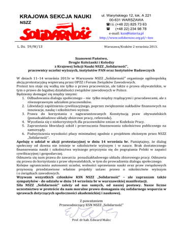 KRAJOWA SEKCJA NAUKI NSZZ ul. Waryńskiego 12, lok. A 221 00-631 WARSZAWA / (+48 22) 825 73 63 (+48 22) 234 98 78 e‐mail:[email protected] http://www.solidarnosc.org.pl/~ksn L.Dz.59/W/13Warszawa/Kraków2września2013. SzanowniPaństwo, DrogieKoleżankiiKoledzy zKrajowejSekcjiNaukiNSZZ„Solidarność”, pracownicyuczelniwyższych,instytutówPANorazInstytutówBadawczych W dniach 11–14 września 2013r w Warszawie NSZZ „Solidarność” organizuje ogólnopolską akcjąprotestacyjnąwspieranąprzezOPZZiForumZwiązkówZawodowych. Protesttenstajesięwalkąnietylkooprawapracownicze,aletakżeoprawaobywatelskie,w tymoprawodolegalnejdziałalnościzwiązkówzawodowychwPolsce. Będziemydomagaćsięmiędzyinnymi: 1. Odbudowaniadialoguspołecznego–nietylkomiędzyrządzącymiipracodawcami,alez równoprawnymudziałempracowników. 2. Likwidacjizapóźnieniacywilizacyjnego,poprzezzwiększenienakładówfinansowychna innowacje,naukęiszkolnictwowyższe. 3. Prawa do korzystania z zagwarantowanych Konstytucją praw obywatelskich (ponadzakładoweukładyzbiorowepracy,referenda). 4. WycofaniasięzniekorzystnychdlapracownikówzmianwKodeksiePracy. 5. Zaprzestania likwidacji szkół i przerzucania finansowania szkolnictwa publicznego na samorządy. 6. Podwyższenia wysokości płacy minimalnej zgodnie z projektem złożonym przez NSZZ „Solidarność”. Apeluję o udział w akcji protestacyjnej w dniu 14 września br. Pamiętajmy, że dialog społeczny od dawna nie istnieje w szkolnictwie wyższym i w nauce. Brak dostatecznego finansowania nauki i szkolnictwa wyższego przyczynia się do pogrążania Polski w zapaści cywilizacyjnejigospodarczej. Odmawiasięnamprawadozawarciaponadzakładowegoukładuzbiorowegopracy.Odmawia sięprawadokorzystaniazprawobywatelskich,wtymdoprowadzeniadialoguspołecznego. Kolejne ograniczenia autonomii uczelni, wolności uprawiania nauki oraz praw związkowych przynoszą przedstawione właśnie projekty ustaw: prawo o szkolnictwie wyższym iozwiązkachzawodowych. Wzywam wszystkich członków KSN NSZZ „Solidarność” – ale zapraszam także sympatyków‐doudziałuwdniu14wrześniabrwwarszawskiejmanifestacji. Siła NSZZ „Solidarność” zależy od nas samych, od naszej postawy. Nasze liczne uczestnictwowproteściedanammoralneprawodomaganiasięsolidarnegowsparciaw sprawachdotyczącychspołecznościakademickiejinaukowej. Zpoważaniem PrzewodniczącyKSNNSZZ„Solidarność” Prof.drhab.EdwardMalec