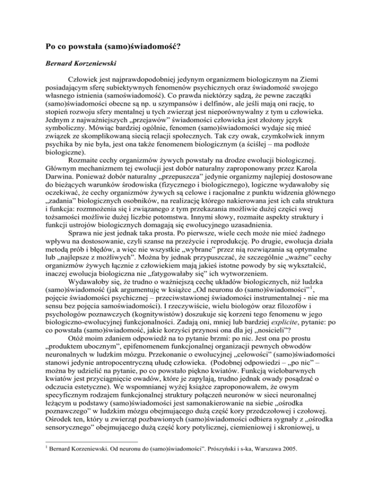 Po co powstała (samo)świadomość? Bernard Korzeniewski Człowiek jest najprawdopodobniej jedynym organizmem biologicznym na Ziemi posiadającym sferę subiektywnych fenomenów psychicznych oraz świadomość swojego własnego istnienia (samoświadomość). Co prawda niektórzy sądzą, że pewne zaczątki (samo)świadomości obecne są np. u szympansów i delfinów, ale jeśli mają oni rację, to stopień rozwoju sfery mentalnej u tych zwierząt jest nieporównywalny z tym u człowieka. Jednym z najważniejszych „przejawów” świadomości człowieka jest złożony język symboliczny. Mówiąc bardziej ogólnie, fenomen (samo)świadomości wydaje się mieć związek ze skomplikowaną siecią relacji społecznych. Tak czy owak, czymkolwiek innym psychika by nie była, jest ona także fenomenem biologicznym (a ściślej – ma podłoże biologiczne). Rozmaite cechy organizmów żywych powstały na drodze ewolucji biologicznej. Głównym mechanizmem tej ewolucji jest dobór naturalny zaproponowany przez Karola Darwina. Ponieważ dobór naturalny „przepuszcza” jedynie organizmy najlepiej dostosowane do bieżących warunków środowiska (fizycznego i biologicznego), logiczne wydawałoby się oczekiwać, że cechy organizmów żywych są celowe i racjonalne z punktu widzenia głównego „zadania” biologicznych osobników, na realizację którego nakierowana jest ich cała struktura i funkcja: rozmnożenia się i związanego z tym przekazania możliwie dużej części swej tożsamości możliwie dużej liczbie potomstwa. Innymi słowy, rozmaite aspekty struktury i funkcji ustrojów biologicznych domagają się ewolucyjnego uzasadnienia. Sprawa nie jest jednak taka prosta. Po pierwsze, wiele cech może nie mieć żadnego wpływu na dostosowanie, czyli szanse na przeżycie i reprodukcję. Po drugie, ewolucja działa metodą prób i błędów, a więc nie wszystkie „wybrane” przez nią rozwiązania są optymalne lub „najlepsze z możliwych”. Można by jednak przypuszczać, że szczególnie „ważne” cechy organizmów żywych łącznie z człowiekiem mają jakieś istotne powody by się wykształcić, inaczej ewolucja biologiczna nie „fatygowałaby się” ich wytworzeniem. Wydawałoby się, że trudno o ważniejszą cechę układów biologicznych, niż ludzka (samo)świadomość (jak argumentuję w książce „Od neuronu do (samo)świadomości” 1 , pojęcie świadomości psychicznej – przeciwstawionej świadomości instrumentalnej - nie ma sensu bez pojęcia samoświadomości). I rzeczywiście, wielu biologów oraz filozofów i psychologów poznawczych (kognitywistów) doszukuje się korzeni tego fenomenu w jego biologiczno-ewolucyjnej funkcjonalności. Zadają oni, mniej lub bardziej explicite, pytanie: po co powstała (samo)świadomość, jakie korzyści przynosi ona dla jej „nosicieli”? Otóż moim zdaniem odpowiedź na to pytanie brzmi: po nic. Jest ona po prostu „produktem ubocznym”, epifenomenem funkcjonalnej organizacji pewnych obwodów neuronalnych w ludzkim mózgu. Przekonanie o ewolucyjnej „celowości” (samo)świadomości stanowi jedynie antropocentryczną ułudę człowieka. (Podobnej odpowiedzi – „po nic” – można by udzielić na pytanie, po co powstało piękno kwiatów. Funkcją wielobarwnych kwiatów jest przyciągnięcie owadów, które je zapylają, trudno jednak owady posądzać o odczucia estetyczne). We wspomnianej wyżej książce zaproponowałem, że owym specyficznym rodzajem funkcjonalnej struktury połączeń neuronów w sieci neuronalnej leżącym u podstawy (samo)świadomości jest samonakierowanie na siebie „ośrodka poznawczego” w ludzkim mózgu obejmującego dużą część kory przedczołowej i czołowej. Ośrodek ten, który u zwierząt pozbawionych (samo)świadomości odbiera sygnały z „ośrodka sensorycznego” obejmującego dużą część kory potylicznej, ciemieniowej i skroniowej, u 1 Bernard Korzeniewski. Od neuronu do (samo)świadomości”. Prószyński i s-ka, Warszawa 2005. człowieka otrzymuje sygnały także od samego siebie. A zatem adekwatne pytanie w kontekście biologiczno-ewolucyjnej funkcjonalności to: po co powstało owo samonakierowanie na siebie ośrodka poznawczego, które „przypadkiem” zaowocowało wyłonieniem się (samo)świadomości? Tu oczywiście zdani jesteśmy jedynie na hipotezy. Jak wspomniałem powyżej, ewolucyjna geneza mechanizmów neurofizjologicznych leżących u podstawy omawianego fenomenu może być, przynajmniej wedle niektórych opinii, powiązana z genezą złożonego języka symbolicznego oraz, szerzej, bogatych i różnorodnych relacji społecznych. Nakierowanie na siebie ośrodka poznawczego będącego „siedliskiem” procesów myślenia i planowania, doprowadziło do wyłonienia się wyraźnego „ego”, a w konsekwencji do ostrego rozgraniczenia poniędzy „ja” i „on” („oni”). Znaczenie tego zjawiska dla skutecznego funkcjonowania w społeczeństwie wydaje się oczywista. Już u małp stwierdzono dodatnią korelację pomiędzy względną wielkością kory przedczołowej u poszczególnych gatunków, a wielkością tworzonych przez osobników tych gatunków społeczności. Co do języka, to, poza oczywistą funkcją komunikacyjną, pozwala on na bardzo wydajne operowanie zespołem pojęć obecnym w naszym umyśle (którego fizycznym „nośnikiem” jest dynamiczna sieć połączeń pomiędzy neuronami). Nazwy języka przypisane są pojęciom najlepiej wyodrębnionym, o największym natężeniu „pola semantycznego”. Jednakże gramatyczna struktura języka pozwala mu na odnoszenie się do samego siebie, swoich własnych nazw i zdań, a więc utworzenie metajązyka. Trudno nie zauważyć tu paraleli z omawianym powyżej samonakierowaniem się na siebie ośrodka poznawczego w ludzkim mózgu, leżącym, moim zdaniem, u podstaw (samo)świadomości. A więc język i samoświadomość wydają się być ściśle powiązane i jest prawdopodobne, 