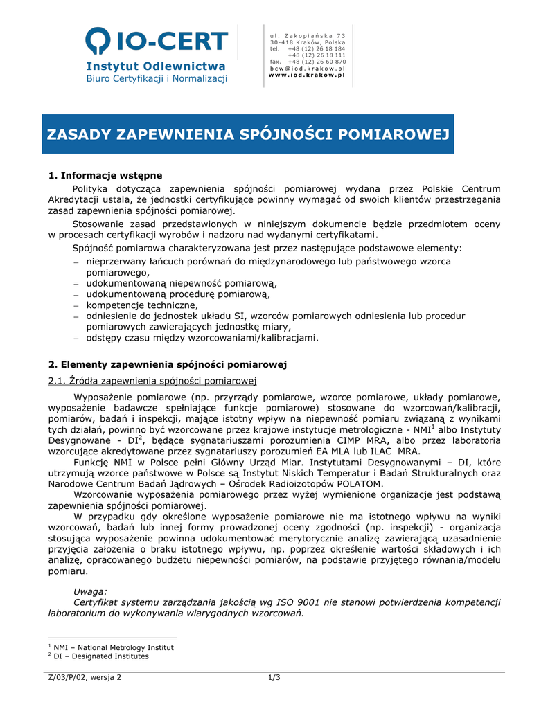 Instytut Odlewnictwa Biuro Certyfikacji i Normalizacji ul. Zakopiańska 73 3 0 - 4 1 8 K r ak ó w , P ol sk a tel. +48 (12) 26 18 184 +48 (12) 26 18 111 fax. +48 (12) 26 60 870 [email protected] www.iod.krakow.pl ZASADY ZAPEWNIENIA SPÓJNOŚCI POMIAROWEJ 1. Informacje wstępne Polityka dotycząca zapewnienia spójności pomiarowej wydana przez Polskie Centrum Akredytacji ustala, że jednostki certyfikujące powinny wymagać od swoich klientów przestrzegania zasad zapewnienia spójności pomiarowej. Stosowanie zasad przedstawionych w niniejszym dokumencie będzie przedmiotem oceny w procesach certyfikacji wyrobów i nadzoru nad wydanymi certyfikatami. Spójność pomiarowa charakteryzowana jest przez następujące podstawowe elementy: nieprzerwany łańcuch porównań do międzynarodowego lub państwowego wzorca pomiarowego, udokumentowaną niepewność pomiarową, udokumentowaną procedurę pomiarową, kompetencje techniczne, odniesienie do jednostek układu SI, wzorców pomiarowych odniesienia lub procedur pomiarowych zawierających jednostkę miary, odstępy czasu między wzorcowaniami/kalibracjami. 2. Elementy zapewnienia spójności pomiarowej 2.1. Źródła zapewnienia spójności pomiarowej Wyposażenie pomiarowe (np. przyrządy pomiarowe, wzorce pomiarowe, układy pomiarowe, wyposażenie badawcze spełniające funkcje pomiarowe) stosowane do wzorcowań/kalibracji, pomiarów, badań i inspekcji, mające istotny wpływ na niepewność pomiaru związaną z wynikami tych działań, powinno być wzorcowane przez krajowe instytucje metrologiczne - NMI1 albo Instytuty Desygnowane - DI2, będące sygnatariuszami porozumienia CIMP MRA, albo przez laboratoria wzorcujące akredytowane przez sygnatariuszy porozumień EA MLA lub ILAC MRA. Funkcję NMI w Polsce pełni Główny Urząd Miar. Instytutami Desygnowanymi – DI, które utrzymują wzorce państwowe w Polsce są Instytut Niskich Temperatur i Badań Strukturalnych oraz Narodowe Centrum Badań Jądrowych – Ośrodek Radioizotopów POLATOM. Wzorcowanie wyposażenia pomiarowego przez wyżej wymienione organizacje jest podstawą zapewnienia spójności pomiarowej. W przypadku gdy określone wyposażenie pomiarowe nie ma istotnego wpływu na wyniki wzorcowań, badań lub innej formy prowadzonej oceny zgodności (np. inspekcji) - organizacja stosująca wyposażenie powinna udokumentować merytorycznie analizę zawierającą uzasadnienie przyjęcia założenia o braku istotnego wpływu, np. poprzez określenie wartości składowych i ich analizę, opracowanego budżetu niepewności pomiarów, na podstawie przyjętego równania/modelu pomiaru. Uwaga: Certyfikat systemu zarządzania jakością wg ISO 9001 nie stanowi potwierdzenia kompetencji laboratorium do wykonywania wiarygodnych wzorcowań. 1 2 NMI – National Metrology Institut DI – Designated Institutes Z/03/P/02, wersja 2 1/3 2.2. Potwierdzenie spójności pomiarowej Potwierdzeniem przeprowadzonego wzorcowania jest świadectwo wzorcowania. Nie akceptuje się świadectw legalizacji jako potwierdzenia spójności pomiarowej. Świadectwa wzorcowania wydawane przez akredytowane laboratoria wzorcujące są dowodem zachowania spójności pomiarowej pod warunkiem, że zawierają symbol akredytacji, a wzorcowane przyrządy i parametry są w zakresie ich akredytacji. Świadectwa wydane przez NMI/DI, zawierające symbol Międzynarodowego Biura Miar - BIPM, są wystarczającym spełnieniem spójności pomiarowej. NMI/DI nie są zobowiązane do stosowania symbolu BIPM w wydanych świadectwach wzorcowania. W przypadku zlecania pomiarów do laboratorium zewnętrznego, organizacja powinna przedstawić dowody, że pomiary wykonywane są wyposażeniem, które posiada odpowiednie świadectwa wzorcowania. 2.3. Niepewność pomiaru Jednym z elementów spójności pomiarowej jest niepewność pomiaru, związana z wzorcowaniem wyposażenia pomiarowego. Przy wzorcowaniu przyrządów pomiarowych niepewność pomiaru należy szacować zgodnie z dokumentem EA-4/02. Całkowita niepewność pomiaru należy podawać w postaci niepewności rozszerzonej przy poziomie ufności ok. 95%. Świadectwo wzorcowania przyrządu pomiarowego powinno posiadać informację dotyczącą niepewności pomiaru. 2.4. Wzorcowanie wewnętrzne Rodzaje i zakres wzorcowań wewnętrznych mogą być różne, w zależności od potrzeb i możliwości danej organizacji, tak aby zapewnić wystarczającą dokładność i rzetelność wykonywanych pomiarów. Dla wzorcowań wewnętrznych akredytacja nie jest konieczna, jednakże, mając na względzie zapewnienie spójności pomiarowej należy spełnić co najmniej następujące warunki: procedury wzorcowania muszą być udokumentowane, wyniki wzorcowania przedstawione w formie świadectw, protokołów lub równoważnych dokumentów, a zapisy wzorcowania zachowywane, kompetencje personelu wykonującego wzorcowania wewnętrzne muszą być udokumentowane, należy przechowywać dokumentacje ze szkoleń oraz dowody kompetencji (np. wyniki egzaminu, raporty z auditów w zakresie wykonywania wzorcowań), wyniki wzorcowań powinny być powiązanie z międzynarodowymi lub państwowymi wzorcami pomiarowymi NMI/DI albo z wzorcami pomiarowymi odniesienia NMI/DI, co powinno być udokumentowane, procedury szacowania niepewności pomiaru powinny być ustalone, wzorce pomiarowe odniesienia powinny być wzorcowane w ustalonych odstępach czasu zgodnie z przyjętą polityką, wieloletnią obserwacją wzorców odniesienia. 3. Zlecanie pomiarów do laboratorium zewnętrznego Zlecanie pomiarów do zewnętrznego laboratorium nie zwalnia organizacji od zapewnienia spełnienia wymagań dotyczących spójności pomiarowej. Oznacza to, że po stronie organizacji (producenta) jest odpowiedzialność za wykonane pomiary. W przypadku reklamacji wyrobu producent musi przedstawić wiarygodne wyniki pomiarów przeprowadzone przez zewnętrzne laboratorium. Posiadanie akredytacji przez laboratorium stanowi dowód spełnienia wym