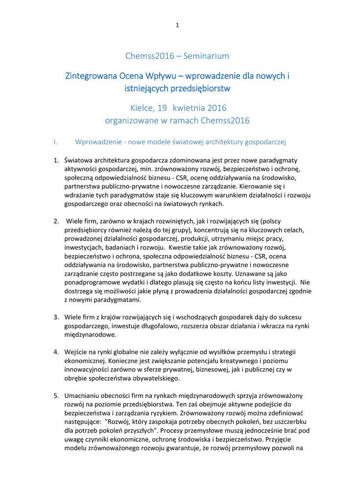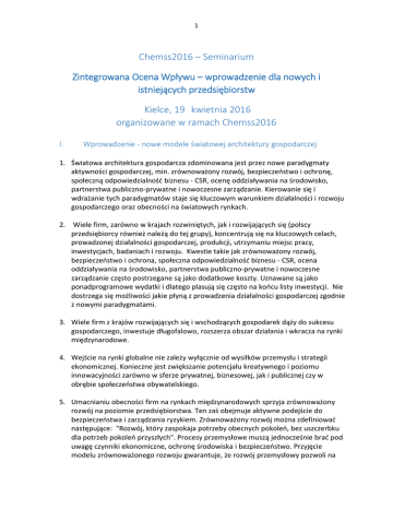 1 Chemss2016 – Seminarium Zintegrowana Ocena Wpływu – wprowadzenie dla nowych i istniejących przedsiębiorstw Kielce, 19 kwietnia 2016 organizowane w ramach Chemss2016 I. Wprowadzenie - nowe modele światowej architektury gospodarczej 1. Światowa architektura gospodarcza zdominowana jest przez nowe paradygmaty aktywności gospodarczej, min. zrównoważony rozwój, bezpieczeństwo i ochronę, społeczną odpowiedzialność biznesu - CSR, ocenę oddziaływania na środowisko, partnerstwa publiczno-prywatne i nowoczesne zarządzanie. Kierowanie się i wdrażanie tych paradygmatów staje się kluczowym warunkiem działalności i rozwoju gospodarczego oraz obecności na światowych rynkach. 2. Wiele firm, zarówno w krajach rozwiniętych, jak i rozwijających się (polscy przedsiębiorcy również należą do tej grupy), koncentrują się na kluczowych celach, prowadzonej działalności gospodarczej, produkcji, utrzymaniu miejsc pracy, inwestycjach, badaniach i rozwoju. Kwestie takie jak zrównoważony rozwój, bezpieczeństwo i ochrona, społeczna odpowiedzialność biznesu - CSR, ocena oddziaływania na środowisko, partnerstwa publiczno-prywatne i nowoczesne zarządzanie często postrzegane są jako dodatkowe koszty. Uznawane są jako ponadprogramowe wydatki i dlatego plasują się często na końcu listy inwestycji. Nie dostrzega się możliwości jakie płyną z prowadzenia działalności gospodarczej zgodnie z nowymi paradygmatami. 3. Wiele firm z krajów rozwijających się i wschodzących gospodarek dąży do sukcesu gospodarczego, inwestuje długofalowo, rozszerza obszar działania i wkracza na rynki międzynarodowe. 4. Wejście na rynki globalne nie zależy wyłącznie od wysiłków przemysłu i strategii ekonomicznej. Konieczne jest zwiększanie potencjału kreatywnego i poziomu innowacyjności zarówno w sferze prywatnej, biznesowej, jak i publicznej czy w obrębie społeczeństwa obywatelskiego. 5. Umacnianiu obecności firm na rynkach międzynarodowych sprzyja zrównoważony rozwój na poziomie przedsiębiorstwa. Ten zaś obejmuje aktywne podejście do bezpieczeństwa i zarządzania ryzykiem. Zrównoważony rozwój można zdefiniować następujące: "Rozwój, który zaspokaja potrzeby obecnych pokoleń, bez uszczerbku dla potrzeb pokoleń przyszłych". Procesy przemysłowe muszą jednocześnie brać pod uwagę czynniki ekonomiczne, ochronę środowiska i bezpieczeństwo. Przyjęcie modelu zrównoważonego rozwoju gwarantuje, że rozwój przemysłowy pozwoli na 2 uniknięcie lub minimalizacje negatywnego wpływu na środowisko. W dłuższej perspektywie, taki niepożądany wpływ doprowadziłby do pogorszenia jakości życia i stanu środowiska. 6. Zintegrowana ocena wpływu zapewnia procedury oparte na dowodach. Procedury te pozwalają na dokonanie oceny wpływu na środowisko nowych lub istniejących przedsiębiorstw, jednocześnie określające ich relację do czynników gospodarczych i społecznych. Procedury stanowią podstawę dla konsorcjum skupiającego Norweski Instytut Badań Atmosfery w Kjeller, Norwegia (NILU), NILU Polska sp. zoo. w Krakowie (NILU Polska), Centrum Energetyki Akademii GórniczoHutniczej Międzynarodowe Centrum Bezpieczeństwa Chemicznego (ICCSS) w Warszawie. Opracowało ono wspólną ofertę służącą do oceny oddziaływania na środowisko i rozwijania idei społecznej odpowiedzialności biznesu (CSR). 7. Seminarium - Zintegrowana Ocena Wpływu - wprowadzenie dla nowych i istniejących przedsiębiorstw organizowane jest w czasie Światowego Kongresu Bezpieczeństwa Chemicznego i Światowych Targów Bezpieczeństwa Chemicznego CHEM-SAFETYEXPO - Kielce, Polska (18-20 kwietnia 2016): www.chemss2016.org gdzie będą rozpatrywane nowe paradygmaty światowej architektury gospodarczej. II. Cele i zadania Seminarium: 1. Seminarium ma na celu wzmocnienie i wspieranie współpracy między przemysłem i interesariuszami na całym świecie, we wprowadzaniu nowych paradygmatów w działalności gospodarczej, ze szczególnym uwzględnieniem zrównoważonego rozwoju, zintegrowanej oceny wpływu oraz społecznej odpowiedzialności biznesu (CSR) tak w nowych jak i istniejących przedsiębiorstwach. 2. Głównym celem seminarium jest prezentacja narzędzi służących poprawie kompetencji w prowadzeniu działalności gospodarczej firm i prowadzeniu inwestycji, w zgodzie z krajowymi i międzynarodowymi przepisami oraz przy wykorzystaniu zintegrowanej oceny wpływu. III. Cele szczegółowe: 1. Wspieranie nowych i istniejących inwestycji w podnoszenie świadomości, poprawę polityki środowiskowej i społecznej poprzez badanie istniejących możliwości wprowadzenia zintegrowanej oceny wpływu; 2. Prezentowanie najlepszych praktyki i przykładów praktycznych u partnerów krajowych i międzynarodowych. 3. Wzmocnienie właściwych narzędzi w obrębie przemysłu, stosowanych w zakresie polityki ochrony środowiska i polityki społecznej, z jednoczesnym uwzględnieniem wymogów traktatów międzynarodowych, systemów regulacyjnych i ustaleń. 3 4. Zapewnienie informacji na temat działań, nakładów i planów, które mogą być poczynione na poziomie przedsiębiorstwa w celu wprowadzenia zintegrowanej oceny wpływu. IV. Oczekiwane rezultaty Seminarium. 1. Spotkania skupia się na wzmocnieniu koordynacji i współpracy między dostawcami i odbiorcami nowoczesnych rozwiązań w zakresie zintegrowanej oceny wpływu, społecznej odpowiedzialności biznesu (CSR) oraz zrównoważonego rozwoju nowych i istniejących przedsiębiorstw. 2. Seminarium, poprzez rozwój wzajemnych relacji między wszystkimi kluczowymi interesariuszami będzie usprawniać przepływ informacji i promować na poziomie krajowym i międzynarodowym zintegrowaną ocenę wpływu. 3. Oczekuje się, że spotkanie zintegruje wiodących interesariuszy , którzy służyć będą pomocom nowymi oraz istniejącym przedsiębiorstwom w rozwijaniu i wdrażaniu zintegrowanej oceny wpływu i społecznej odpowie