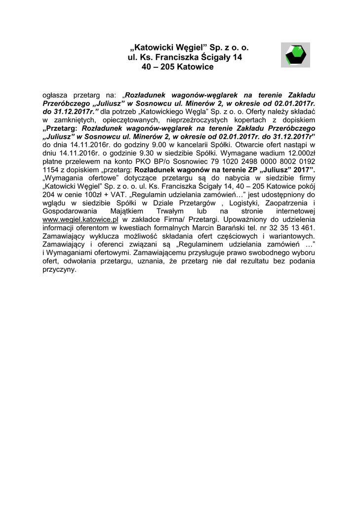„Katowicki Węgiel” Sp. z o. o. ul. Ks. Franciszka Ścigały 14 40 – 205 Katowice ogłasza przetarg na: „Rozładunek wagonów-węglarek na terenie Zakładu Przeróbczego „Juliusz” w Sosnowcu ul. Minerów 2, w okresie od 02.01.2017r. do 31.12.2017r.” dla potrzeb „Katowickiego Węgla” Sp. z o. o. Oferty należy składać w zamkniętych, opieczętowanych, nieprzeźroczystych kopertach z dopiskiem „Przetarg: Rozładunek wagonów-węglarek na terenie Zakładu Przeróbczego „Juliusz” w Sosnowcu ul. Minerów 2, w okresie od 02.01.2017r. do 31.12.2017r” do dnia 14.11.2016r. do godziny 9.00 w kancelarii Spółki. Otwarcie ofert nastąpi w dniu 14.11.2016r. o godzinie 9.30 w siedzibie Spółki. Wymagane wadium 12.000zł płatne przelewem na konto PKO BP/o Sosnowiec 79 1020 2498 0000 8002 0192 1154 z dopiskiem „przetarg: Rozładunek wagonów na terenie ZP „Juliusz” 2017”. „Wymagania ofertowe” dotyczące przetargu są do nabycia w siedzibie firmy „Katowicki Węgiel” Sp. z o. o. ul. Ks. Franciszka Ścigały 14, 40 – 205 Katowice pokój 204 w cenie 100zł + VAT. „Regulamin udzielania zamówień…” jest udostępniony do wglądu w siedzibie Spółki w Dziale Przetargów , Logistyki, Zaopatrzenia i Gospodarowania Majątkiem Trwałym lub na stronie internetowej www.wegiel.katowice.pl w zakładce Firma/ Przetargi. Upoważniony do udzielenia informacji oferentom w kwestiach formalnych Marcin Barański tel. nr 32 35 13 461. Zamawiający wyklucza możliwość składania ofert częściowych i wariantowych. Zamawiający i oferenci związani są „Regulaminem udzielania zamówień …” i Wymaganiami ofertowymi. Zamawiającemu przysługuje prawo swobodnego wyboru ofert, odwołania przetargu, uznania, że przetarg nie dał rezultatu bez podania przyczyny.