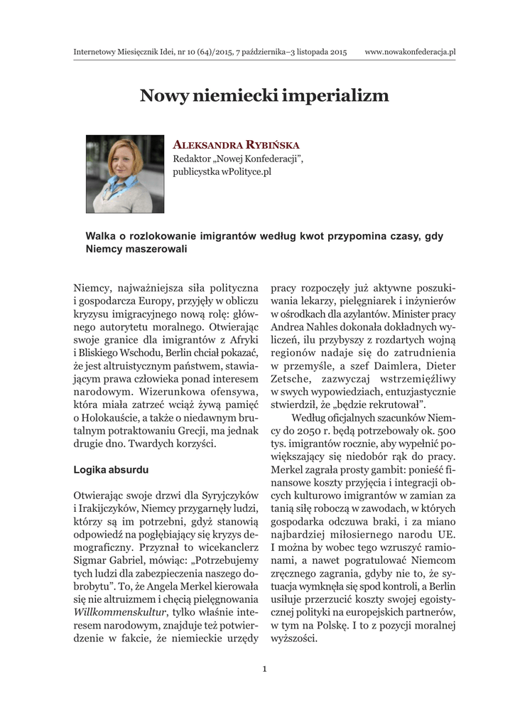 Internetowy Miesięcznik Idei, nr 10 (64)/2015, 7 października–3 listopada 2015 www.nowakonfederacja.pl Nowy niemiecki imperializm AleksANdrA rybińskA Redaktor „Nowej Konfederacji”, publicystka wPolityce.pl Walka o rozlokowanie imigrantów według kwot przypomina czasy, gdy Niemcy maszerowali Niemcy, najważniejsza siła polityczna i gospodarcza Europy, przyjęły w obliczu kryzysu imigracyjnego nową rolę: głównego autorytetu moralnego. Otwierając swoje granice dla imigrantów z Afryki i Bliskiego Wschodu, Berlin chciał pokazać, że jest altruistycznym państwem, stawiającym prawa człowieka ponad interesem narodowym. Wizerunkowa ofensywa, która miała zatrzeć wciąż żywą pamięć o Holokauście, a także o niedawnym brutalnym potraktowaniu Grecji, ma jednak drugie dno. Twardych korzyści. pracy rozpoczęły już aktywne poszukiwania lekarzy, pielęgniarek i inżynierów w ośrodkach dla azylantów. Minister pracy Andrea Nahles dokonała dokładnych wyliczeń, ilu przybyszy z rozdartych wojną regionów nadaje się do zatrudnienia w przemyśle, a szef Daimlera, Dieter Zetsche, zazwyczaj wstrzemięźliwy w swych wypowiedziach, entuzjastycznie stwierdził, że „będzie rekrutował”. Według oficjalnych szacunków Niemcy do 2050 r. będą potrzebowały ok. 500 tys. imigrantów rocznie, aby wypełnić powiększający się niedobór rąk do pracy. Merkel zagrała prosty gambit: ponieść finansowe koszty przyjęcia i integracji obcych kulturowo imigrantów w zamian za tanią siłę roboczą w zawodach, w których gospodarka odczuwa braki, i za miano najbardziej miłosiernego narodu UE. I można by wobec tego wzruszyć ramionami, a nawet pogratulować Niemcom zręcznego zagrania, gdyby nie to, że sytuacja wymknęła się spod kontroli, a Berlin usiłuje przerzucić koszty swojej egoistycznej polityki na europejskich partnerów, w tym na Polskę. I to z pozycji moralnej wyższości. Logika absurdu Otwierając swoje drzwi dla Syryjczyków i Irakijczyków, Niemcy przygarnęły ludzi, którzy są im potrzebni, gdyż stanowią odpowiedź na pogłębiający się kryzys demograficzny. Przyznał to wicekanclerz Sigmar Gabriel, mówiąc: „Potrzebujemy tych ludzi dla zabezpieczenia naszego dobrobytu”. To, że Angela Merkel kierowała się nie altruizmem i chęcią pielęgnowania Willkommenskultur, tylko właśnie interesem narodowym, znajduje też potwierdzenie w fakcie, że niemieckie urzędy 1 Internetowy Miesięcznik Idei, nr 10 (64)/2015, 7 października–3 listopada 2015 Polityka otwartych ramion, która zapewniła Berlinowi takie nagłówki w światowej prasie, jak „Niemcy wzorem dla świata” czy „Niemiecka polityka uczuć”, dotarła do swoich granic. Niemieckie kraje związkowe nie radzą sobie z napływem uchodźców, siostrzana partia rządzącej chadecji, bawarska CSU, buntuje się przeciwko polityce centrali, w niektórych miastach konfiskuje się prywatne mieszkania, by umieścić w nich imigrantów, zawieszając tymczasowo prawo do www.nowakonfederacja.pl Niemiecki kontrwywiad zidentyfikował wśród uchodźców już 29 bojowników Państwa Islamskiego. Nie przyznać się do błędu Niemcy zaczynają się bać. Plakaty z radosnym „Witamy” po angielsku i arabsku dawno zniknęły z ulic miast. Strach nie jest dobrym doradcą, ale nie jest nim również ulubiona maksyma pani kanclerz: „gdzie jest wola, tam znajdzie się i droga”. Im dłużej trwa kryzys imigracyjny, tym bardziej Merkel traci w sondażach. Pragmatyczna kanclerz, zmuszona wybierać między udawaną dobrocią a pokojem społecznym, wybrała ten ostatni. By nie musieć przyznawać się do błędu (podczas posiedzenia frakcji CDU/CSU stwierdziła, że „ma w nosie, że odpowiada za obecny kryzys imigracyjny”), szuka kozłów ofiarnych. System rozlokowania imigrantów według kwot zdejmuje z Niemców część odpowiedzialności, pozwala im pozbyć się „nadwyżki” w postaci imigrantów nienadających się do pracy i integracji i stanowi legitymizację dotychczasowej polityki. Merkel dobrze wie, że obecna fala imigracyjna to dopiero początek i że za w miarę wykształconymi Syryjczykami i Irakijczykami podążą kolejni. Mniej wykwalifikowani. Z Afryki subsaharyjskiej, Afganistanu, Pakistanu. Dla nich w Niemczech już nie będzie miejsca. Ich Niemcy nie okryją ciepłym płaszczykiem tolerancji. „Nasze możliwości są ograniczone” – przyznał prezydent Joachim Gauck. Imigranci mimo to przyjadą. Nie dotarła do nich informacja, że Niemcy zamknęli granice i zaostrzyli prawo imigracyjne i że szansę na azyl i zasiłki w germańskim eldorado będą mieli już tylko politycznie prześladowani i uciekinierzy z regionów wojennych. A jeśli dotarła, to Merkel zagrała prosty gambit: ponieść finansowe koszty przyjęcia i integracji obcych kulturowo imigrantów w zamian za tanią siłę roboczą w zawodach, w których gospodarka odczuwa braki, oraz za miano najbardziej miłosiernego narodu Ue własności. Na tej samej zasadzie pozbawia się ubogich Niemców mieszkań socjalnych. Jednostki Bundeswehry są przenoszone z koszar do namiotów w lesie, by zrobić miejsce dla przybyszy. A ci, niezadowoleni z warunków, w których przyszło im żyć, napadają na sklepy i wszczynają burdy na tle etnicznym i religijnym. W niektórych ośrodkach dla azylantów gnieździ się nawet do 2 tys. osób kilkunastu narodowości. Dominują syryjscy sunnici, usiłujący narzucić pozostałym prawo szariatu i szczególnie prześladujący chrześcijan. 2 Internetowy Miesięcznik Idei, nr 10 (64)/2015, 7 października–3 listopada 2015 nie dają jej wiary. Niemcy otworzyli puszkę Pandory. Francuski wywiad mówi o milionie osób szykujących się do podróży do Europy, inni, jak węgierski rząd – o 25 milionach. To przerażająca perspektywa. Miłosierni Niemcy zdjęli więc aksamitne rękawiczki i zaczęli reszcie Europy przykręcać śrubę. Mamy być solidarni i przygarnąć część ty