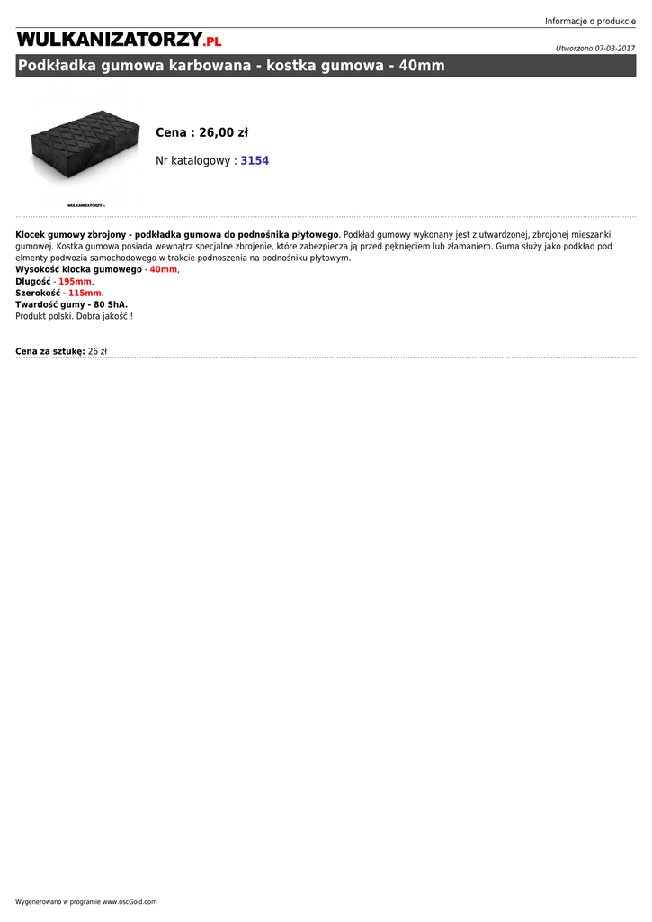 Informacje o produkcie Utworzono 07-03-2017 Podkładka gumowa karbowana - kostka gumowa - 40mm Cena : 26,00 zł Nr katalogowy : 3154 Klocek gumowy zbrojony - podkładka gumowa do podnośnika płytowego. Podkład gumowy wykonany jest z utwardzonej, zbrojonej mieszanki gumowej. Kostka gumowa posiada wewnątrz specjalne zbrojenie, które zabezpiecza ją przed pęknięciem lub złamaniem. Guma służy jako podkład pod elmenty podwozia samochodowego w trakcie podnoszenia na podnośniku płytowym. Wysokość klocka gumowego - 40mm, Dlugość - 195mm, Szerokość - 115mm. Twardość gumy - 80 ShA. Produkt polski. Dobra jakość ! Cena za sztukę: 26 zł Wygenerowano w programie www.oscGold.com