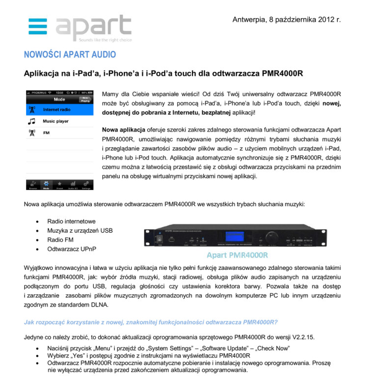Antwerpia, 8 października 2012 r. NOWOŚCI APART AUDIO Aplikacja na i-Pad’a, i-Phone’a i i-Pod’a touch dla odtwarzacza PMR4000R Mamy dla Ciebie wspaniałe wieści! Od dziś Twój uniwersalny odtwarzacz PMR4000R może być obsługiwany za pomocą i-Pad’a, i-Phone’a lub i-Pod’a touch, dzięki nowej, dostępnej do pobrania z Internetu, bezpłatnej aplikacji! Nowa aplikacja oferuje szeroki zakres zdalnego sterowania funkcjami odtwarzacza Apart PMR4000R, umożliwiając nawigowanie pomiędzy różnymi trybami słuchania muzyki i przeglądanie zawartości zasobów plików audio – z użyciem mobilnych urządzeń i-Pad, i-Phone lub i-Pod touch. Aplikacja automatycznie synchronizuje się z PMR4000R, dzięki czemu można z łatwością przestawić się z obsługi odtwarzacza przyciskami na przednim panelu na obsługę wirtualnymi przyciskami nowej aplikacji. Nowa aplikacja umożliwia sterowanie odtwarzaczem PMR4000R we wszystkich trybach słuchania muzyki: Radio internetowe Muzyka z urządzeń USB Radio FM Odtwarzacz UPnP Wyjątkowo innowacyjna i łatwa w użyciu aplikacja nie tylko pełni funkcję zaawansowanego zdalnego sterowania takimi funkcjami PMR4000R, jak: wybór źródła muzyki, stacji radiowej, obsługa plików audio zapisanych na urządzeniu podłączonym do portu USB, regulacja głośności czy ustawienia korektora barwy. Pozwala także na dostęp i zarządzanie zasobami plików muzycznych zgromadzonych na dowolnym komputerze PC lub innym urządzeniu zgodnym ze standardem DLNA. Jak rozpocząć korzystanie z nowej, znakomitej funkcjonalności odtwarzacza PMR4000R? Jedyne co należy zrobić, to dokonać aktualizacji oprogramowania sprzętowego PMR4000R do wersji V2.2.15. Naciśnij przycisk „Menu” i przejdź do „System Settings” – „Software Update” – „Check Now” Wybierz „Yes” i postępuj zgodnie z instrukcjami na wyświetlaczu PMR4000R Odtwarzacz PMR4000R rozpocznie automatyczne pobieranie i instalację nowego oprogramowania. Proszę nie wyłączać urządzenia przed zakończeniem aktualizacji oprogramowania. Skąd można pobrać aplikację? Instalacja oprogramowania FRONTIER SILICON na iPad: 1. 2. 3. 4. 5. Należy uruchomić zarejestrowany program iTunes na komputerze PC, w okienku wyszukiwarki iTunes wpisać FRONTIER SILICON, pobrać plik FRONTIER SILICON DIGITAL FSIRC, podłączyć, zsynchronizować iPad’a z iTunes, zainstalować pobraną aplikację FSIRC na iPad, przy pierwszym uruchomieniu programu należy wpisać PIN 1234. Oprogramowanie sprzętowe (firmware) dla odtwarzacza PMR4000R jest dostępne od dnia 8 października 2012 r. Więcej informacji można znaleźć pod adresem http://www.frontier-silicon.com/products/software/Apple_App.htm. W celu uzyskania informacji na temat innych produktów firmy Apart należy skontaktować się z przedstawicielem dystrybutora APART Audio.