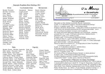 Statystyka Parafialna Roku Pańskiego 2014 I-sza Komunia święta Chrzty Bronder Weronika Dwornik Tymoteusz Fikus Marta Gryc Marcin Hornik Zuzanna Jarocki Wojciech Kensy Szymon Kroll Olivier Leś Milena Luckmann Karolina Machnik Marcel Michalska Maja Orlik Helena Pawłowski Marvin Pawłowski Nico Pawłowski Phillip Pinkosz Tomasz Piotrowska Emilia Szczepaniak Maksym Ulrich Ksawery Atamańczuk Mateusz Czupala Kamil Feliks Thomas Golla Patryk Gryc Kinga Halupczok Kamila Kapica Damian Klimas Paulina Knosala Krystian Łacniak Emilia Nowicki Aleksandra Piasecka Katarzyna Smandzich Wiktoria Stasiak Aleksandra Stasiuk Paulina Świętek Łukasz Świętek Paweł Tyburczy Emilia Wiesiołek Anna Bensch Sebastian Cieloch Monika Czyenia Tomasz Feliks Tomasz Hadasch Larysa Klyk Patryk Kulik Magdalena Leś Karolina Nadolna Mariola Pawłowska Aleksandra Röhrich Jan Słowik Kevin Stach Mateusz Szyporta Adam Wawrzyńczyk Monika Weinzettell Szymon Wiesiołek Dawid Zielonka Lena Zienć Michał Śluby Bronder Roman – Mrocheń Agnieszka Hahn Adrian – Wieczorek Anna Kokot Michał – Gola Karina Langner Robert – Pytel Małgorzata Lazar Robert – Mateja Jolanta Ledwoch Michał – Czichon Sabina Stawiarski Martin – Loch Magdalena Strzelczyk Martin – Dancewicz Joanna Szczypel Piotr – Burda Aleksandra Śnieżek Mariusz – Gabryś Katarzyna Wańczyk Krzysztof – Frasek Anna Wiench Krystian – Świętek Katrina Wolski Bartłomiej – Bestwina Anna Wróbel Marek – Kubiak Aldona U św. Mikołaja Bierzmowanie Pogrzeby Bonk Jan Bul Hubert Bul Jerzy Czech Renata Dudek Leokadia Emmerling Markus Gora Franciszka Gwiosda Gertrud Halupczok Adrian Kokot Agnieszka Kokot Benon Kulig Sebastian Lis Alfons Ozimek Monika Pańczyk Krzysztof Pańczyk Piotr Piechota Agnieszka Rogowska Anna Slonzok Elżbieta Spyra Teresa Wiesberg Werner Wrzeciono Jadwiga Wycisk Maria w Szczedrzyku Wiadomości parafialne Rzymskokatolickiej Parafii w Szczedrzyku 04.01.2015 Nr 319 PL 46-042 Szczedrzyk, Pl 1- go Maja 19 http://www.parafia-szczedrzyk.pl tel: (77) 4655192 Nasze życie parafialne Bóg zapłać za ofiary składane na potrzeby Diecezji i Seminarium. O godz. 15.15 nabożeństwo kolędowe i Koronka do Miłosierdzia Bożego. Msze św. w tygodniu o godz. 7.00 – z racji trwającej kolędy. Kolędowe odwiedziny duszpasterskie – według planu. Prośba do mieszkańców nowej części Niwek, aby nawzajem poinformowali się o przyjmowaniu kolędy – jest to ważne, by nikogo nie pominąć i nie tracić czasu na szukanie. We wtorek uroczystość Objawienia Pańskiego czyli Trzech Króli – niedzielny porządek Mszy św. (o godz. 10.00 będzie śpiewał chór z Dębskiej Kuźni), nabożeństwo o godz. 15.15, kolekta na misje. W piątek o godz. 15.00 Koronka do Miłosierdzia Bożego. W sobotę po Mszy św. o godz. 8.00 modlitwy Apostolstwa Dobrej Śmierci. W przyszłą niedzielę (11.01.) podczas nieszporów o godz. 15.15 dzieci będą mogły grać i śpiewać kolędy – serdecznie zapraszam. Można się zapisywać na majową (18 – 23) Pielgrzymkę do Całunu Turyńskiego. (w następnym tygodniu – po 11.01.) O godz. 15.15 nabożeństwo kolędowe z udziałem dzieci. W przyszłą niedzielę nie będzie nabożeństwa. Trwa duszpasterska wizyta kolędowa – według planu. Msze św. w tygodniu o godz. 7.00. We wtorek po Mszy św. porannej Różaniec fatimski i za młode pokolenie. W piątek o godz. 15.00 Koronka do Miłosierdzia Bożego. Od soboty tygodniowa przerwa w kolędzie. W tym czasie duszpastersko będzie zastępował ks. Rudolf – wszelkie sprawy załatwiać po Mszach św. Przypomnienie o Pielgrzymce do Całunu Turyńskiego Można już zapisywać się w biurze turystycznym STACHURA (tel. 77/44 10 540) lub w naszej parafii na planowaną w dniach 18 – 22 maja br. Pielgrzymkę. Jej głównym celem będzie wystawiony do czci wiernych Całun Turyński, ale w programie są także: Maria Worth, Turyn, Mediolan, Madonna della Corona, Werona, Bolonia, Rawenna, Padwa, Wiedeń. Koszt – ok. 1300 zł + 25 euro obejmuje: przejazd, 4 noclegi w 2 – 3 osobowych pokojach hotelowych, 4 obiadokolacje, 4 śniadania, ubezpieczenie. NIEDZIELA – 04.01.2015 – II po Narodzeniu Pańskim 730 (niem.) ------------------1000 za ++ rodziców Joannę i Wiktora, + brata Henryka, 2 ++ ciotki, bratową, 2 ++ szwagrów, za ++ teściów Agnieszkę i Piotra, 2 ++ synów, ++ z pokrew. Pytel – Nowak 1515 nabożeństwo kolędowe – Koronka do Miłosierdzia Bożego 1600 1) w int. rodziny Wiench – o zdrowie i błog. Boże 2) za + męża i ojca Krystiana w 3 roczn. śmierci PONIEDZIAŁEK – 05.01.2015 700 za + Marię Wieszołek, ++ rodziców i pokrew. z obu stron WTOREK – 06.01.2015 – Objawienie Pańskie (Trzech Króli) 730 za + męża i ojca Franciszka Wójcik, ++ rodziców Gola – Wójcik, ++ brata, bratową i szwagra, za ++ Gabrielę, Aniel, Helmuta, Manfreda, za ++ z pokrew. 00 10 w int. rocznego dziecka: Maksym Szczepaniak – z podzięk. za dar życia – o dalsze błog. Boże i opiekę Anioła Stróża oraz o wszelkie łaski dla rodziców i chrzestnych 1515 nabożeństwo kolędowe – modlitwa za misje 1600 dziękcz. z ok. 18 urodzin Moniki Wiench – o dary Ducha Świętego, opiekę NMP, zdrowie i błog. Boże ŚRODA – 07.01.2015 700 ---------------------- CZWARTEK – 08.01.2015 00 7 za ++ rodziców Julię i Pawła Panic, + brata Georga i + siostrę Elżbietę, + Gerharda Knop i jego ++ rodziców, za ++ z pokrew. Mańczyk – Panic PIĄTEK – 09.01.2015 700 dziękcz. z ok. 70 urodzin męża Reinholda – o zdrowie i błog. Boże w rodzinie i w rodzinie syna 00 15 Koronka do Miłosierdzia Bożego SOBOTA – 10.01.2015 800 za + Elżbietę Szlonzok w 1 roczn. śmierci 1800 za + męża i ojca Edwarda Klyk, + ojca Alojzego Krause – o zdrowie i błog. Boże w rodzinie NIEDZIELA – 11.01.2015 – Chrzest Pański 730 (niem.) dziękcz. z ok. 70 urodzin Klausa Leschik – o zdrowie i błog. Boże w rodzinie i w rodzinach dzieci 00 10 do Mi