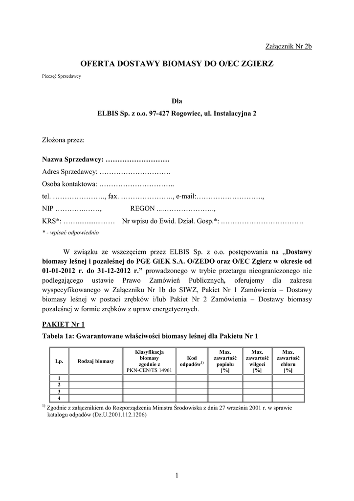 Załącznik Nr 2b OFERTA DOSTAWY BIOMASY DO O/EC ZGIERZ Pieczęć Sprzedawcy Dla ELBIS Sp. z o.o. 97-427 Rogowiec, ul. Instalacyjna 2 Złożona przez: Nazwa Sprzedawcy: ……………………… Adres Sprzedawcy: ………………………… Osoba kontaktowa: ………………………….. tel. …………………., fax. …………………., e-mail:………………………., NIP ………….……, REGON ...…………………., KRS*: …….............…… Nr wpisu do Ewid. Dział. Gosp.*: .……………………………. * - wpisać odpowiednio W związku ze wszczęciem przez ELBIS Sp. z o.o. postępowania na „Dostawy biomasy leśnej i pozaleśnej do PGE GiEK S.A. O/ZEDO oraz O/EC Zgierz w okresie od 01-01-2012 r. do 31-12-2012 r.” prowadzonego w trybie przetargu nieograniczonego nie podlegającego ustawie Prawo Zamówień Publicznych, oferujemy dla zakresu wyspecyfikowanego w Załączniku Nr 1b do SIWZ, Pakiet Nr 1 Zamówienia – Dostawy biomasy leśnej w postaci zrębków i/lub Pakiet Nr 2 Zamówienia – Dostawy biomasy pozaleśnej w formie zrębków z upraw energetycznych. PAKIET Nr 1 Tabela 1a: Gwarantowane właściwości biomasy leśnej dla Pakietu Nr 1 Lp. Rodzaj biomasy Klasyfikacja biomasy zgodnie z PKN-CEN/TS 14961 Kod odpadów1) Max. zawartość popiołu [%] Max. zawartość wilgoci [%] Max. zawartość chloru [%] 1 2 3 4 1) Zgodnie z załącznikiem do Rozporządzenia Ministra Środowiska z dnia 27 września 2001 r. w sprawie katalogu odpadów (Dz.U.2001.112.1206) 1 Tabela 1b: Rodzaj, ilość i cena biomasy leśnej dla Pakietu Nr 1 Lp. Rodzaj biomasy Ilość [Mg] Jednostkowa cena netto [PLN/GJ] Gwarantowa na wartość opałowa [GJ/Mg] Wartość netto oferty [PLN] 1 2 3 4 Łączna wartość oferty netto [Ilość x cena jednostkowa x gwarantowana wartość opałowa Łączna wartość oferty netto dla Pakietu Nr 1 wynosi: …………………..PLN (słownie złotych:………………………..……………………………..……………………..). Podatek VAT zostanie doliczony zgodnie z obowiązującymi przepisami. Tabela 1c: Cena biomasy w przypadku przekierowania do innego Oddziału PGE GiEK S.A. Oddział PGE GiEK S.A. Lp. 1 2 3 4 5 6 Ilość [Mg] Rodzaj biomasy Jednostkowa cena netto * [PLN/GJ] Gwarantowa na wartość opałowa [GJ/Mg] Wartość netto oferty [PLN] EC Bydgoszcz EC Kielce EL Bełchatów EL Turów EL Dolna Odra PGE EL Opole S.A. Łączna wartość oferty netto [Ilość x cena jednostkowa x gwarantowana wartość opałowa] *- ostateczna cena zostanie ustalona w dialogu ze Sprzedawcą. PAKIET Nr 2 Tabela 2a: Gwarantowane właściwości biomasy pozaleśnej dla Pakietu Nr 2 Lp. Rodzaj biomasy Klasyfikacja biomasy zgodnie z PKN-CEN/TS 14961 Kod odpadów1) Max. zawartość popiołu [%] Max. zawartość wilgoci [%] Max. zawartość chloru [%] 1 2 3 4 1) Zgodnie z załącznikiem do Rozporządzenia Ministra Środowiska z dnia 27 września 2001 r. w sprawie katalogu odpadów (Dz.U.2001.112.1206) Tabela 2b: Rodzaj, ilość i cena biomasy pozaleśnej dla Pakietu Nr 2 Lp. Rodzaj biomasy Ilość [Mg] Jednostkowa cena netto [PLN/GJ] Gwarantowa na wartość opałowa [GJ/Mg] Wartość netto oferty [PLN] 1 2 3 4 Łączna wartość oferty netto [Ilość x cena jednostkowa x gwarantowana wartość opałowa] Łączna wartość oferty netto dla Pakietu Nr 2 wynosi: …………………..PLN 2 (słownie złotych:…………………………..……………………………..…………………..). Podatek VAT zostanie doliczony zgodnie z obowiązującymi przepisami. Tabela 2c: Cena biomasy w przypadku przekierowania do innego Oddziału PGE GiEK S.A. Lp. 1 2 3 4 5 6 Oddział PGE GiEK S.A. Ilość [Mg] Rodzaj biomasy Jednostkowa cena netto * [PLN/GJ] Gwarantowa na wartość opałowa [GJ/Mg] Wartość netto oferty [PLN] EC Bydgoszcz EC Kielce EL Bełchatów EL Turów EL Dolna Odra PGE EL Opole S.A. Łączna wartość oferty netto [Ilość x cena jednostkowa x gwarantowana wartość opałowa] *- ostateczna cena zostanie ustalona w dialogu ze Sprzedawcą. 1. Łączna wartość netto oferty obejmująca Pakiety Nr 1 i Nr 2 wynosi …………………………………………………………………….. PLN (słownie złotych: ……………………………………………………………………..). Podatek VAT zostanie doliczony zgodnie z obowiązującymi przepisami. 2. Oświadczamy, że Zamówienie zrealizujemy w terminie określonym w Załączniku Nr 1 do SIWZ. 3. Oświadczamy, że oferowana przez nas biomasa zgodnie z Częścią F Załącznika nr 1 do Rozporządzenia Ministra Środowiska z dnia 12 stycznia 2006 (Dz.U.2006.16.124, z późn. zm.) zaliczana jest do czystej biomasy neutralnej pod względem CO2, a w związku z tym energia elektryczna lub cieplna wytworzona w wyniku jej spalania zostanie zaliczona do energii wytworzonej w odnawialnym źródle energii zgodnie z Rozporządzeniem Ministra Środowiska z dnia 14 sierpnia 2008 r. (Dz.U.2008.156.969), z późn. zm.). 4. Oświadczamy, że dostarczana do Miejsca Dostawy biomasa: a) nie będzie wytwarzana z odpadów drewna, które mogą zawierać związki fluorowcoorganiczne lub metale ciężkie, jako wynik obróbki środkami do konserwacji drewna lub powlekania, w skład których wchodzą w szczególności odpady drewna pochodzącego z budownictwa i odpady z rozbiórki, tj. spełnia wymogi §2 pkt.1 lit. e Rozporządzenia Ministra Środowiska z 22 kwietnia 2011 roku, w sprawie standardów emisyjnych z instalacji (Dz.U.2011r. Nr 95, poz 558), b) nie będzie zanieczyszczona frakcjami torfowymi i uwęglonymi skamieniałościami materiałów pochodzenia biomasowego (zgodnie z Załącznikiem nr 1 do Rozporządzenia Ministra Środowiska z dnia 12 stycznia 2006 r. – Dz.U.2006.16.124, z późn. zm.), c) nie będzie zawierać frakcji pochodzących z drewna twardego – dębu i buku (Rozporządzenie Ministra Zdrowia z dnia 01 grudnia 2004 r. w sprawie substancji, preparatów, czynni
