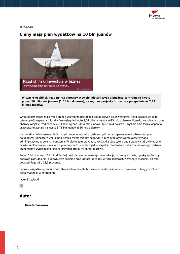 2011-03-28 Chiny mają plan wydatków na 10 bln juanów W tym roku chiński rząd po raz pierwszy w swojej historii wyda z budżetu centralnego kwotę ponad 10 bilionów juanów (1,51 bln dolarów), z czego na projekty biznesowe przypadnie aż 2,74 biliona juanów. Wydatki biznesowe mają mieć przede wszystkim postać ulg podatkowych dla inwestorów. Rząd szacuje, że tego tytułu całość wsparcia (ulg) dla firm osiągnie kwotę 2,74 biliona juanów (415 mld dolarów). Ponadto na rolnictwo oraz obszary wiejskie rząd chce w 2011 roku wydać 988,4 mld juanów (149,9 mld dolarów). Łącznie obie formy wsparcia oszacowane zostały na kwotę 3,73 bln juanów (566 mld dolarów). Na projekty niebiznesowe chiński rząd zamierza wydać przede wszystkim na zapewnienie środków do życia najuboższej ludności, w celu zmniejszenia różnic między bogatymi a biednymi oraz skumulować wydatki administracyjne w celu ich obniżenia. W pierwszym przypadku wydatki z tego tytułu będą stanowić aż dwie trzecie całości zaplanowanej sumy.W drugim przypadku chodzi o jedne wspólne zamówienia publiczne na różnego rodzaju przedmioty i wyposażenie, jak na przykład artykuły i sprzęt biurowy. Ponad 1 bln juanów (151 mld dolarów) rząd planuje przeznaczyć na edukację, ochronę zdrowia, opiekę społeczną, poprawę zatrudnienia, budownictwo socjalne oraz kulturę. Wydatki w tych sektorach wzrosną w stosunku do roku poprzedniego aż o 18,1 procenta. Łącznie wszystkie wydatki z budżetu państwa na cele biznesowe i niebiznesowe w porównaniu z ubiegłym rokiem będą wyższe o 11,9 procenta. Jacek Strzelecki Autor Gazeta Bankowa 1