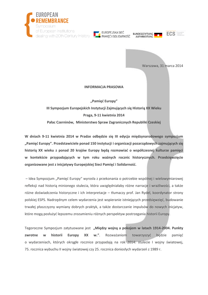 Warszawa, 31 marca 2014 INFORMACJA PRASOWA „Pamięć Europy” III Sympozjum Europejskich Instytucji Zajmujących się Historią XX Wieku Praga, 9-11 kwietnia 2014 Pałac Czerninów, Ministerstwo Spraw Zagranicznych Republiki Czeskiej W dniach 9-11 kwietnia 2014 w Pradze odbędzie się III edycja międzynarodowego sympozjum „Pamięć Europy”. Przedstawiciele ponad 150 instytucji i organizacji pozarządowych zajmujących się historią XX wieku z ponad 20 krajów Europy będą rozmawiać o współczesnej kulturze pamięci w kontekście przypadających w tym roku ważnych rocznic historycznych. Przedsięwzięcie organizowane jest z inicjatywy Europejskiej Sieci Pamięć i Solidarność. – Idea Sympozjum „Pamięć Europy“ wyrosła z przekonania o potrzebie wspólnej i wielowymiarowej refleksji nad historią minionego stulecia, która uwzględniałaby różne narracje i wrażliwości, a także różne doświadczenia historyczne i ich interpretacje – tłumaczy prof. Jan Rydel, koordynator strony polskiej ESPS. Nadrzędnym celem wydarzenia jest wspieranie istniejących przedsięwzięć, budowanie trwałej płaszczyzny wymiany dobrych praktyk, a także dostarczanie impulsów do nowych inicjatyw, które mogą posłużyć lepszemu zrozumieniu różnych perspektyw postrzegania historii Europy. Tegoroczne Sympozjum zatytuowane jest „Między wojną a pokojem w latach 1914-2004. Punkty zwrotne w historii Europy XX w.”. Rozważaniom towarzyszyć będzie pamięć o wydarzeniach, których okrągłe rocznice przypadają na rok 2014: stulecie I wojny światowej, 75. rocznica wybuchu II wojny światowej czy 25. rocznica doniosłych wydarzeń z 1989 r. Sympozjum otworzy wystąpienie Marci Shore – amerykańskiej historyk, zajmującej się badaniami historii Europy Wschodniej, wykładowczyni Uniwersytetu Yale (USA) – poświęcone właśnie przełomowym momentom w europejskiej historii: 1914-1939-1945-1989-2004. Podczas trzydniowego spotkania uczestnicy wezmą udział w dyskusjach i warsztatach, a także wysłuchają wystąpień wielu historyków i praktyków z zakresu badań nad pamięcią XX wieku, w tym m.in. Jamesa Marka z Uniwersytetu Exeter, Heidemarie Uhl z Austriackiej Akademiii Nauk, Włodzimierza Borodzieja z Uniwersytetu Warszawskiego i Uniwersytetu w Jenie, a także Oldřicha Tůmy z Instytutu Historii Współczesnej Czeskiej Akademii Nauk. Sympozjum zakończy finałowe wystąpienie Pietera Lagrou (Wolny Uniwersytet w Brukseli) na temat postrzegania historii 25 lat po upadku komunizmu. W programie Sympozjum znajduje się także prezentacja wystawy zatytułowanej „Między dyktaturą a demokracją”, na którą złoży się niemal 200 fotografii oraz dokumentów dźwiękowych z wielu europejskich archiwów. Za jej koncepcję odpowiadają prof. Andreas Wirsching i dr Petra Weber z Instytutu Historii Współczesnej w Monachium. Ponadto uczestnicy Sympozjum odwiedzą także Muzeum w Lidicach – ważne miejsce pamięci dla Czechów, w którym w 10 czerwca 1942 Niemcy dokonali masowej eksterminacji ludności cywilnej. – Mamy nadzieję, że Sympozjum „Pamięć Europy” na trwałe zapisze się w kalendarzu ważnych przedsięwzięć dotyczących kultury pamięci, jako platforma wymiany poglądów, pozwalająca nam spotykać się, dyskutować, spierać się i nawiązywać współpracę, a przy okazji osobiście zetknąć z kulturą pamięci kraju, w którym się spotykamy – tłumaczy Rafał Rogulski, Dyrektor Sekretariatu Europejskie Sieci Pamięć i Solidarność. Cykl sympozjów “Pamięć Europy” został rozpoczęty w 2012 roku w Gdańsku. Rok później sympozjum odbyło się w Berlinie. Organizacja kolejnej edycji planowana jest w Wiedniu. W tym roku partnerami Sympozjum są: Instytut Historii Najnowszej Czeskiej Akademii Nauk, Ministerstwo Spraw Zagranicznych Republiki Czeskiej oraz Komisja Europejska. Szczegółowy program konferencji znajduje się pod adresem: www.europeanremembrance.enrs.eu. Europejska Sieć Pamięć i Solidarność (ESPS) jest międzynarodowym przedsięwzięciem, które ma na celu badanie, dokumentowanie oraz upowszechnianie wiedzy na temat historii Europy XX wieku i sposobów jej upamiętniania ze szczególnym uwzględnieniem okresu dyktatur, wojen i społecznego sprzeciwu wobec zniewolenia. Członkami Sieci są: Niemcy, Polska, Słowacja i Węgry, do których niebawem dołączy Rumunia. Status obserwatora mają Austria i Czechy. www.enrs.eu ________________________________________ Federalna Fundacja Badań nad Dyktaturą Socjalistycznej Partii Jedności (SED) została założona w 1998 roku przez Bundestag. Fundacja bada przyczyny, historię i konsekwencje dyktatury w radzieckiej strefie okupacyjnej w Niemczech oraz w NRD. Jej działalność polega w głównej mierze na realizacji projektów o charakterze historyczny, edukacyjnym i naukowym, a także wsparciem ofiar reżimu komunistycznego w Niemczech. www.bundesstiftung-aufarbeitung.de ________________________________________ Europejskie Centrum Solidarności (ECS) to muzeum oraz centrum edukacyjne i naukowe, powstałe w 2007 roku w Gdańsku. ECS zajmuje się nie tylko historią i recepcją polskiej „Solidarności”, ale także wspiera refleksję nad stanem społeczeństwa otwartego, nad rolą państwa, tożsamością wspólnot demokratycznych, a także problemem sprawiedliwości społecznej. Ważnym celem ECS jest także promocja idei wolności i solidarności w państwach autorytarnych. www.ecs.gda.pl Kontakt dla mediów: Edyta Mietkowska Europejska Sieć Pamięć Solidarność Tel. +48 502.110.315 e-mail: [email protected]