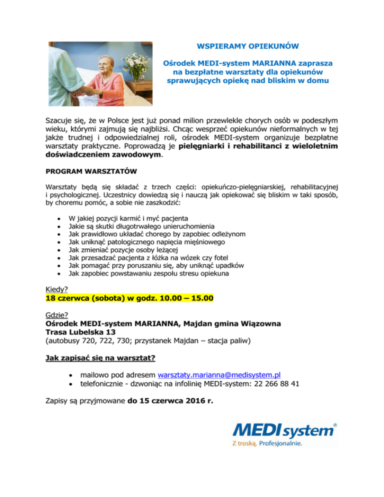 WSPIERAMY OPIEKUNÓW Ośrodek MEDI-system MARIANNA zaprasza na bezpłatne warsztaty dla opiekunów sprawujących opiekę nad bliskim w domu Szacuje się, że w Polsce jest już ponad milion przewlekle chorych osób w podeszłym wieku, którymi zajmują się najbliżsi. Chcąc wesprzeć opiekunów nieformalnych w tej jakże trudnej i odpowiedzialnej roli, ośrodek MEDI-system organizuje bezpłatne warsztaty praktyczne. Poprowadzą je pielęgniarki i rehabilitanci z wieloletnim doświadczeniem zawodowym. PROGRAM WARSZTATÓW Warsztaty będą się składać z trzech części: opiekuńczo-pielęgniarskiej, rehabilitacyjnej i psychologicznej. Uczestnicy dowiedzą się i nauczą jak opiekować się bliskim w taki sposób, by choremu pomóc, a sobie nie zaszkodzić: W jakiej pozycji karmić i myć pacjenta Jakie są skutki długotrwałego unieruchomienia Jak prawidłowo układać chorego by zapobiec odleżynom Jak uniknąć patologicznego napięcia mięśniowego Jak zmieniać pozycje osoby leżącej Jak przesadzać pacjenta z łóżka na wózek czy fotel Jak pomagać przy poruszaniu się, aby uniknąć upadków Jak zapobiec powstawaniu zespołu stresu opiekuna Kiedy? 18 czerwca (sobota) w godz. 10.00 – 15.00 Gdzie? Ośrodek MEDI-system MARIANNA, Majdan gmina Wiązowna Trasa Lubelska 13 (autobusy 720, 722, 730; przystanek Majdan – stacja paliw) Jak zapisać się na warsztat? mailowo pod adresem [email protected] telefonicznie - dzwoniąc na infolinię MEDI-system: 22 266 88 41 Zapisy są przyjmowane do 15 czerwca 2016 r.
