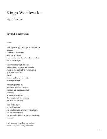 Kinga Wasilewska Wyróżnienie Tryptyk o człowieku *** Dlaczego mogę uwierzyć w człowieka jednego z imienia i nazwiska żeby się wyłamał z prześmiewczych statystyk rozsądku ale w ludzi nigdy Gdzie zaznać ulgi jeśli nie pod dachem twojego spojrzenia może w moim krętym rozumieniu ty to ktoś skalany iluzją ktoś ponad tym wszystkim co nie przemija Potrzebuję abyś był gdzieś w ścianach świata którego nie chcę naruszyć wiedzieć że stamtąd wrócisz choć nigdy już nie zechcę trzymać cię za rękę Dziś tylko żyję za daleko siebie nic oplata mnie łapczywymi palcami ale nie zawołam cię nie pozwolę żadnemu słowu do ciebie dojrzeć I nie umiem pogodzić się z ciszą która wie jak dobrze jest razem 1 przekraczać jedynie dosłowność *** Można na kogoś spojrzeć stwierdzić nic ponadto że człowiek przeniknięty do bólu ludzkością niewygodnym milczeniem lub spojrzeć w niego bardziej Stwórca musi mieć niesamowitą wyobraźnię i serce nieobjęte wahaniem bo wystarczyłeś ty żebym rankiem słysząc śpiew ptaków usłyszała więcej niż mogę pojąć Poznaję coś z siebie w twoich oczach ale nie dowierzam w słowo czas przecież się nie kończy jak go docenić chwytam cię rozpaczliwie już lecz czas żąda dla siebie szacunku Świat nas sobie nie wybrał po prostu dźwiga moje skargi na niebycie razem czasem westchnie nade mną wprost z burzowej chmury dobrze że chociaż milczy nam to samo niebo 2 *** Poprzedniej nocy dręczył mnie asfalt mokrej drogi spijał łzy jak wyschnięta ziemia bo bałam się spojrzeć mu w oczy myśl nawet zamarła w pół drogi aż nagle wszystkim wstrząsnął podmuch ciszy Czym jest to co gubi mnie w poszumie nocnego nieba zostawia z tyłu choć prowadzi w przekonaniu że tak trzeba zapala serce w końcu czuję że nie jest z kamienia Panie Twój Duch spotyka mnie w tym czego czas nie uleczy w tym co podnosi uderza w głowę Na imię mi Człowiek więcej niż dziś mnie nie będzie tak trzeba Panie jak Ty sumiennie zbierasz moje łzy 3 Jedność Otaczam cię ciszą zawieram w niej myśli zbyt delikatne by mogły przyjść na świat jeśli przestanę patrzeć w twoje zapłakane oczy wstyd zaciśnie się na gardle lepiej gdy sycę się twym bólem a ty myślisz że pod powłoką mojego spojrzenia nic nie ma Nie zamykasz bramy nóg i wpuszczasz mnie gościnnie w głąb nie warto żyć jeśli choć raz zobaczysz jak odwracają się role nasz zboczony świat pryśnie jeśli zapragniesz mnie powstrzymać To ja przegrywam ty odejdziesz i powiesz umarłem ja patrzę na ciebie bezwstydnie i ginę wciąż od nowa Jesteśmy ale to nie znaczy nic więcej niż wystękane w bólu prośby aby nie być 4 Jedność Otaczam cię ciszą zawieram w niej myśli zbyt delikatne by mogły przyjść na świat jeśli przestanę patrzeć w twoje zapłakane oczy wstyd zaciśnie się na gardle lepiej gdy sycę się twym bólem a ty myślisz że pod powłoką mojego spojrzenia nic nie ma Nie zamykasz bramy nóg i wpuszczasz mnie gościnnie w głąb nie warto żyć jeśli choć raz zobaczysz jak odwracają się role nasz zboczony świat pryśnie jeśli zapragniesz mnie powstrzymać To ja przegrywam ty odejdziesz i powiesz umarłem ja patrzę na ciebie bezwstydnie i ginę wciąż od nowa Jesteśmy ale to nie znaczy nic więcej niż wystękane w bólu prośby aby nie być 5