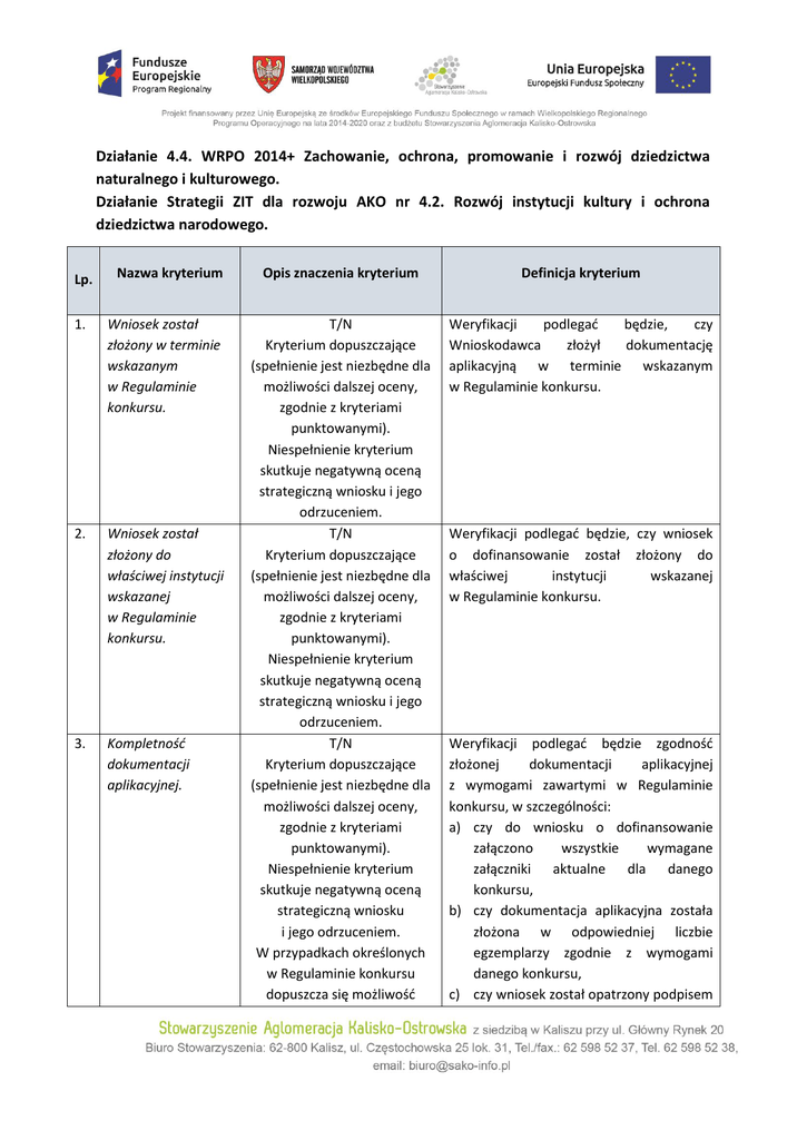Działanie 4.4. WRPO 2014+ Zachowanie, ochrona, promowanie i rozwój dziedzictwa naturalnego i kulturowego. Działanie Strategii ZIT dla rozwoju AKO nr 4.2. Rozwój instytucji kultury i ochrona dziedzictwa narodowego. Lp. Nazwa kryterium 1. Wniosek został złożony w terminie wskazanym w Regulaminie konkursu. 2. Wniosek został złożony do właściwej instytucji wskazanej w Regulaminie konkursu. 3. Kompletność dokumentacji aplikacyjnej. Opis znaczenia kryterium Definicja kryterium T/N Kryterium dopuszczające (spełnienie jest niezbędne dla możliwości dalszej oceny, zgodnie z kryteriami punktowanymi). Niespełnienie kryterium skutkuje negatywną oceną strategiczną wniosku i jego odrzuceniem. T/N Kryterium dopuszczające (spełnienie jest niezbędne dla możliwości dalszej oceny, zgodnie z kryteriami punktowanymi). Niespełnienie kryterium skutkuje negatywną oceną strategiczną wniosku i jego odrzuceniem. T/N Kryterium dopuszczające (spełnienie jest niezbędne dla możliwości dalszej oceny, zgodnie z kryteriami punktowanymi). Niespełnienie kryterium skutkuje negatywną oceną strategiczną wniosku i jego odrzuceniem. W przypadkach określonych w Regulaminie konkursu dopuszcza się możliwość Weryfikacji podlegać będzie, czy Wnioskodawca złożył dokumentację aplikacyjną w terminie wskazanym w Regulaminie konkursu. Weryfikacji podlegać będzie, czy wniosek o dofinansowanie został złożony do właściwej instytucji wskazanej w Regulaminie konkursu. Weryfikacji podlegać będzie zgodność złożonej dokumentacji aplikacyjnej z wymogami zawartymi w Regulaminie konkursu, w szczególności: a) czy do wniosku o dofinansowanie załączono wszystkie wymagane załączniki aktualne dla danego konkursu, b) czy dokumentacja aplikacyjna została złożona w odpowiedniej liczbie egzemplarzy zgodnie z wymogami danego konkursu, c) czy wniosek został opatrzony podpisem jednorazowego uzupełnienia wniosku. 4. Obszar realizacji projektu. 5. Prawidłowy poziom i wartość wnioskowanego dofinansowania. 6. Okres realizacji projektu. T/N Kryterium dopuszczające (spełnienie jest niezbędne dla możliwości dalszej oceny, zgodnie z kryteriami punktowanymi). Niespełnienie kryterium skutkuje negatywną oceną strategiczną wniosku i jego odrzuceniem. T/N Kryterium dopuszczające (spełnienie jest niezbędne dla możliwości dalszej oceny, zgodnie z kryteriami punktowanymi). Niespełnienie kryterium skutkuje negatywną oceną strategiczną wniosku i jego odrzuceniem. T/N/ND Kryterium dopuszczające (spełnienie jest niezbędne dla możliwości dalszej oceny, zgodnie z kryteriami punktowanymi). Niespełnienie kryterium skutkuje negatywną oceną strategiczną wniosku i jego osoby uprawnionej/ podpisami osób uprawnionych do złożenia wniosku, d) czy dokumentacja aplikacyjna w formie elektronicznej została przygotowana na właściwym nośniku informatycznym w odpowiednim pliku i możliwe jest odczytanie danych zawartych na nośniku informatycznym. Weryfikacja będzie miała charakter wstępny, pełna ocena kryterium będzie miała miejsce podczas oceny formalnej przeprowadzonej przez IZ WRPO 2014+. Weryfikacji podlegać będzie, czy projekt jest realizowany na obszarze Aglomeracji Kalisko-Ostrowskiej (tj. obszarze funkcjonalnym ośrodka regionalnego Kalisza z Ostrowem Wielkopolskim wyznaczonego Uchwałą Nr 4014/2013 ZWW z dn. 07.11.2013 r.). Weryfikacji podlegać będzie, czy poziom i wartość dofinansowania wskazanego we wniosku są zgodne z Regulaminem konkursu. Weryfikacji podlegać będzie, czy okres realizacji projektu jest zgodny z Regulaminem konkursu (jeśli dotyczy). odrzuceniem. 7. Wnioskodawca złożył w danym konkursie jeden projekt. 8. Zgodność projektu ze Strategią Zintegrowanych Inwestycji Terytorialnych dla rozwoju Aglomeracji Kalisko-Ostrowskiej. 9. Wpływ wartości wskaźników przyjętych w projekcie na realizację celów Strategii ZIT dla rozwoju AKO. T/N/ND Kryterium dopuszczające (spełnienie jest niezbędne dla możliwości dalszej oceny, zgodnie z kryteriami punktowanymi). Niespełnienie kryterium skutkuje negatywną oceną strategiczną wniosku i jego odrzuceniem. T/N Kryterium dopuszczające (spełnienie jest niezbędne dla możliwości dalszej oceny, zgodnie z kryteriami punktowanymi). Niespełnienie kryterium skutkuje negatywną oceną strategiczną wniosku i jego odrzuceniem. 0-8 Jeżeli w Regulaminie konkursu wskazano, że w ramach danego konkursu Wnioskodawca może złożyć maksymalnie jeden wniosek o dofinansowanie, to przekroczenie tej liczby wyklucza Wnioskodawcę z dalszej oceny (jeśli dotyczy). Weryfikacji podlegać będzie, czy projekt jest zgodny ze Strategią ZIT dla rozwoju AKO, tj.: - priorytetami/ celami/ działaniami określonymi w Strategii, planowanym zakresem wsparcia wskazanym w Strategii, - czy wybrane wskaźniki produktu i rezultatu odzwierciedlają zakres rzeczowy projektu, a założone do osiągnięcia wartości są realne do osiągnięcia. Ocenie podlegać będzie poprawność, wiarygodność i kompletność oraz wpływ zadeklarowanych wartości przyjętych wskaźników na osiągnięcie celów Strategii ZIT dla rozwoju AKO. Za spełnienie ww. wymogów projekt otrzyma: a) za poprawność, wiarygodność i kompletność przyjętych wskaźników – 0-2 pkt, b) za udział w realizacji wartości docelowych wskaźników produktu ujętych w Strategii ZIT dla rozwoju AKO – 0-3 pkt, c) za udział w realizacji wartości docelowej wskaźnika rezultatu ujętego w Strategii ZIT dla rozwoju AKO – 0-3 pkt. Dla określenia ilości punktów wg ww. wymogów określonych w ppkt b będą 10. Komplementarność projektu z innymi projektami. 0-3 11. Strategiczny charakter projektu. 1-10 brane pod uwagę wskaźniki produktu z najwyższą zadeklarowaną wartością względem wartości docelowej wskaźnika produktu ujętej w Strategii ZIT dla rozwoju AKO. Ocenie podlegać będzie powiązanie projektu z innymi przedsięwzięciami zrealizowanymi/ r