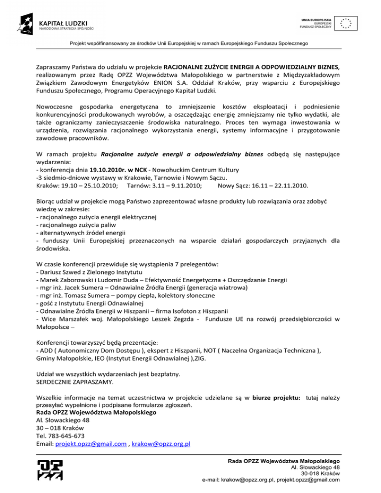 Projekt współfinansowany ze środków Unii Europejskiej w ramach Europejskiego Funduszu Społecznego Zapraszamy Państwa do udziału w projekcie RACJONALNE ZUŻYCIE ENERGII A ODPOWIEDZIALNY BIZNES, realizowanym przez Radę OPZZ Województwa Małopolskiego w partnerstwie z Międzyzakładowym Związkiem Zawodowym Energetyków ENION S.A. Oddział Kraków, przy wsparciu z Europejskiego Funduszu Społecznego, Programu Operacyjnego Kapitał Ludzki. Nowoczesne gospodarka energetyczna to zmniejszenie kosztów eksploatacji i podniesienie konkurencyjności produkowanych wyrobów, a oszczędzając energię zmniejszamy nie tylko wydatki, ale także ograniczamy zanieczyszczenie środowiska naturalnego. Proces ten wymaga inwestowania w urządzenia, rozwiązania racjonalnego wykorzystania energii, systemy informacyjne i przygotowanie zawodowe pracowników. W ramach projektu Racjonalne zużycie energii a odpowiedzialny biznes odbędą się następujące wydarzenia: - konferencja dnia 19.10.2010r. w NCK - Nowohuckim Centrum Kultury -3 siedmio-dniowe wystawy w Krakowie, Tarnowie i Nowym Sączu. Kraków: 19.10 – 25.10.2010; Tarnów: 3.11 – 9.11.2010; Nowy Sącz: 16.11 – 22.11.2010. Biorąc udział w projekcie mogą Państwo zaprezentować własne produkty lub rozwiązania oraz zdobyć wiedzę w zakresie: - racjonalnego zużycia energii elektrycznej - racjonalnego zużycia paliw - alternatywnych źródeł energii - funduszy Unii Europejskiej przeznaczonych na wsparcie działań gospodarczych przyjaznych dla środowiska. W czasie konferencji przewiduje się wystąpienia 7 prelegentów: - Dariusz Szwed z Zielonego Instytutu - Marek Zaborowski i Ludomir Duda – Efektywność Energetyczna + Oszczędzanie Energii - mgr inż. Jacek Sumera – Odnawialne Źródła Energii (generacja wiatrowa) - mgr inż. Tomasz Sumera – pompy ciepła, kolektory słoneczne - gość z Instytutu Energii Odnawialnej - Odnawialne Źródła Energii w Hiszpanii – firma Isofoton z Hiszpanii - Wice Marszałek woj. Małopolskiego Leszek Zegzda - Fundusze UE na rozwój przedsiębiorczości w Małopolsce – Konferencji towarzyszyć będą prezentacje: - ADD ( Autonomiczny Dom Dostępu ), ekspert z Hiszpanii, NOT ( Naczelna Organizacja Techniczna ), Gminy Małopolskie, IEO (Instytut Energii Odnawialnej ),ZIG. Udział we wszystkich wydarzeniach jest bezpłatny. SERDECZNIE ZAPRASZAMY. Wszelkie informacje na temat uczestnictwa w projekcie udzielane są w biurze projektu: tutaj należy przesyłać wypełnione i podpisane formularze zgłoszeń. Rada OPZZ Województwa Małopolskiego Al. Słowackiego 48 30 – 018 Kraków Tel. 783-645-673 Email: [email protected] , [email protected] Rada OPZZ Województwa Małopolskiego Al. Słowackiego 48 30-018 Kraków e-mail: [email protected], [email protected]