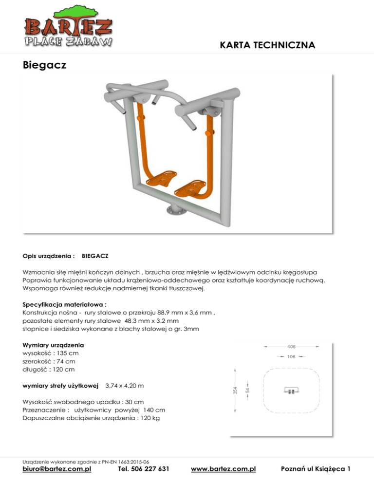 KARTA TECHNICZNA Biegacz Opis urządzenia : BIEGACZ Wzmacnia siłę mięśni kończyn dolnych , brzucha oraz mięśnie w lędźwiowym odcinku kręgosłupa Poprawia funkcjonowanie układu krążeniowo-oddechowego oraz kształtuje koordynację ruchową. Wspomaga również redukcje nadmiernej tkanki tłuszczowej. Specyfikacja materiałowa : Konstrukcja nośna - rury stalowe o przekroju 88,9 mm x 3,6 mm , pozostałe elementy rury stalowe 48,3 mm x 3,2 mm stopnice i siedziska wykonane z blachy stalowej o gr. 3mm Wymiary urządzenia wysokość : 135 cm szerokość : 74 cm długość : 120 cm wymiary strefy użytkowej 3,74 x 4,20 m Wysokość swobodnego upadku : 30 cm Przeznaczenie : użytkownicy powyżej 140 cm Dopuszczalne obciążenie urządzenia : 120 kg Urządzenie wykonane zgodnie z PN-EN 1663:2015-06 [email protected] Tel. 506 227 631 www.bartez.com.pl Poznań ul Książęca 1