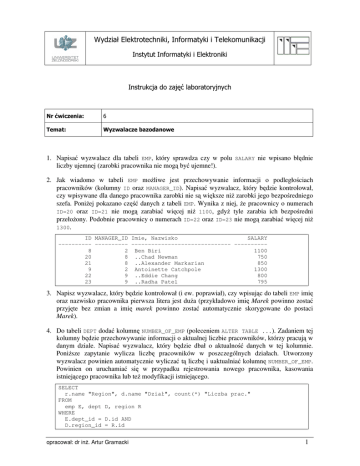 Wydział Elektrotechniki, Informatyki i Telekomunikacji Instytut Informatyki i Elektroniki Instrukcja do zajęć laboratoryjnych Nr ćwiczenia: 6 Temat: Wyzwalacze bazodanowe 1. Napisać wyzwalacz dla tabeli EMP, który sprawdza czy w polu SALARY nie wpisano błędnie liczby ujemnej (zarobki pracownika nie mogą być ujemne!). 2. Jak wiadomo w tabeli EMP możliwe jest przechowywanie informacji o podległościach pracowników (kolumny ID oraz MANAGER_ID). Napisać wyzwalacz, który będzie kontrolował, czy wpisywane dla danego pracownika zarobki nie są większe niż zarobki jego bezpośredniego szefa. Poniżej pokazano część danych z tabeli EMP. Wynika z niej, że pracownicy o numerach ID=20 oraz ID=21 nie mogą zarabiać więcej niż 1100, gdyż tyle zarabia ich bezpośredni przełożony. Podobnie pracownicy o numerach ID=22 oraz ID=23 nie mogą zarabiać więcej niż 1300. ID MANAGER_ID Imie, Nazwisko SALARY ---------- ---------- ------------------------------ ---------8 2 Ben Biri 1100 20 8 ..Chad Newman 750 21 8 ..Alexander Markarian 850 9 2 Antoinette Catchpole 1300 22 9 ..Eddie Chang 800 23 9 ..Radha Patel 795 3. Napisz wyzwalacz, który będzie kontrolował (i ew. poprawiał), czy wpisując do tabeli EMP imię oraz nazwisko pracownika pierwsza litera jest duża (przykładowo imię Marek powinno zostać przyjęte bez zmian a imię marek powinno zostać automatycznie skorygowane do postaci Marek). 4. Do tabeli DEPT dodać kolumnę NUMBER_OF_EMP (poleceniem ALTER TABLE ...). Zadaniem tej kolumny będzie przechowywanie informacji o aktualnej liczbie pracowników, którzy pracują w danym dziale. Napisać wyzwalacz, który będzie dbał o aktualność danych w tej kolumnie. Poniższe zapytanie wylicza liczbę pracowników w poszczególnych działach. Utworzony wyzwalacz powinien automatycznie wyliczać tą liczbę i uaktualniać kolumnę NUMBER_OF_EMP. Powinien on uruchamiać się w przypadku rejestrowania nowego pracownika, kasowania istniejącego pracownika lub też modyfikacji istniejącego. SELECT r.name "Region", d.name "Dział", count(*) "Liczba prac." FROM emp E, dept D, region R WHERE E.dept_id = D.id AND D.region_id = R.id opracował: dr inż. Artur Gramacki 1 GROUP BY D.name, D.region_id, R.name; Region -------------------North America North America North America South America Africa / Middle East Asia Europe North America South America Africa / Middle East Asia Europe Dział Liczba prac. ---------------- -----------Administration 2 Finance 1 Operations 4 Operations 3 Operations 3 Operations 2 Operations 3 Sales 2 Sales 1 Sales 1 Sales 2 Sales 1 12 wierszy zostało wybranych. 5. Napisać wyzwalacz, który będzie sprawdzał, czy dane w tabelach ORD oraz ITEM są spójne. Jeżeli stwierdzona zostanie niespójność wyzwalacz powinien odpowiednio zmodyfikować wartość kolumny TOTAL w tabeli ORD. Zgodnie z logiką modelu SUMMIT2 mamy, że kolumna ORD.TOTAL zawiera (powinna zawierać) sumaryczną wartość sprzedaży na danym zamówieniu. Jest ona ilościowo równa wartości wszystkich zamówionych produktów, których szczegóły zapisane są w tabeli ITEM (czyli jest to suma wszystkich iloczynów ITEM.PRICE * ITEM.QUANTITY dla danego zamówienia). fragment tabeli ITEM fragment tabel ORD ITEM_ID <pk> <fk> ID ORD_ID TOTAL PRICE QUANTITY 6. Zaprojektować a następnie zaimplementować (korzystając z odpowiednio zbudowanego wyzwalacza) mechanizm pozwalający rejestrować wszelkie operacje (w praktyce chodzi o INSERT, UPDATE, DELETE) wykonywane na tabeli EMP. Chodzi tu o rodzaj historii zmian zachodzących w tabeli EMP. Poniżej pokazano przykład działania opisanego wyżej mechanizmu dla bardzo prostej tabeli Na początek utwórzmy tą tabelę i wpiszmy do niej przykładowe dane: TEST. DROP TABLE test; CREATE TABLE test (id NUMBER, kol VARCHAR2(10)); INSERT INTO test VALUES (100, 'a'); INSERT INTO test VALUES (101, 'b'); INSERT INTO test VALUES (102, 'c'); SELECT * FROM test; opracował: dr inż. Artur Gramacki 2 Tabela TEST wygląda więc następująco: ID KOL 100 a 101 b 102 c Tabela TEST_HIST rejestrująca zmiany, które dokonują się w tabeli TEST niech wygląda jak poniżej: ID KOL ID_HIST TYP DATA 100 a 1001 U 09-09-2003 100 aa 1002 U 12-10-2003 100 aaa 1003 U 15-10-2003 103 d 1004 I 12-11-2003 101 b 1005 U 25-11-2003 101 bb 1006 D 29-11-2003 100 aaaa 1007 D 01-12-2003 Zawiera ona wszystkie kolumny tabeli TEST plus kilka kolumn „systemowych”, które zaznaczono szarym kolorem. Widać, że znajduje się w niej 7 rekordów. Rekordy te zostały wstawione automatycznie przez odpowiednio zaprojektowany wyzwalacz. Są one efektem wykonania na tabeli TEST czterech operacji UPDATE jednej operacji INSERT oraz dwóch operacji DELETE: UPDATE UPDATE UPDATE INSERT UPDATE DELETE DELETE test test test INTO test FROM FROM SET kol='aa' WHERE id='100'; SET kol='aaa' WHERE id='100'; SET kol='aaaa' WHERE id='100'; test VALUES (103, 'd'); SET kol='bb' WHERE id='101'; test WHERE id=101; test WHERE id=100; SELECT * FROM test; Zwróćmy uwagę na kolumnę ID_HIST, która pozwala nam odtworzyć kolejność dokonywanych w tabeli TEST zmian (liczby te najwygodniej generować za pomocą sekwencji). Kolumna TYP przechowuje symbol wykonywanej operacji (U – UPDATE, I – INSERT, D – DELETE). Tabela TEST po wykonaniu powyższych operacji ma następującą zawartość: ID KOL 102 c 103 d Zwróćmy uwagę, że dane z tabeli TEST_HIST można bardzo łatwo wykorzystać do wykonania operacji odtwarzających pierwotny stan tabeli TEST (ang. undo). W poniższej tabeli pokazano operacje, które należy wykonać, aby powrócić do stanu pierwotnego: TYP D Operacja do wykonania INSERT INTO test VALUES (100, 'aaaa'); D INSERT INTO test VALUES (101, 'bb'); U UPDATE test SET id=101, kol='b' WHERE id='101'; I DELETE FROM test WHERE id='103'; opracował: dr inż. Artur Gramacki 3 U UPDATE test SET id=100, kol='aaa' WHERE id='100'; U UPDATE test SET id=100, kol='aa' WHERE id='100'; U UPDATE test SET id=100,