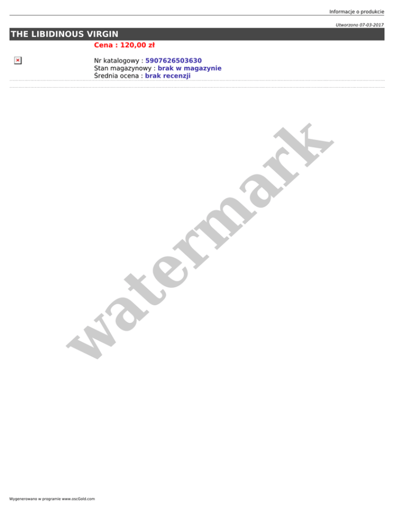 Informacje o produkcie Utworzono 07-03-2017 THE LIBIDINOUS VIRGIN Cena : 120,00 zł w at er m ar k Nr katalogowy : 5907626503630 Stan magazynowy : brak w magazynie Średnia ocena : brak recenzji Wygenerowano w programie www.oscGold.com