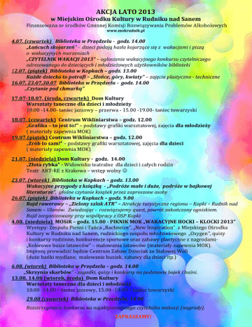 AKCJA LATO 2013 w Miejskim Ośrodku Kultury w Rudniku nad Sanem Finansowana ze środków Gminnej Komisji Rozwiązywania Problemów Alkoholowych www.mokrudnik.pl 4.07. (czwartek) Biblioteka w Przędzelu - godz. 14.00 „Łańcuch skojarzeń" - dzieci podają hasła kojarzące się z wakacjami i piszą o wakacyjnych marzeniach „CZYTELNIK WAKACJI 2013” – ogłoszenie wakacyjnego konkursu czytelniczego adresowanego do dziecięcych i młodzieżowych użytkowników biblioteki 12.07. (piątek) Biblioteka w Kopkach – godz. 13.00 Każde dziecko to potrafi – „Słońce, góry, kwiaty” – zajęcia plastyczno - techniczne 16.07, 23.07,30.07 Biblioteka w Przędzelu - godz. 14.00 „Czytanie pod chmurką” 17.07-18.07. (środa, czwartek) Dom Kultury Warsztaty taneczne dla dzieci i młodzieży 10.00 -14.00- taniec jazzowy – przerwa - 15.00 -19.00- taniec towarzyski 18.07. (czwartek) Centrum Wikliniarstwa – godz. 12.00 „Grafika – to jest to!” – podstawy grafiki warsztatowej, zajęcia dla młodzieży ( materiały zapewnia MOK) 19.07.(piątek) Centrum Wikliniarstwa – godz. 12.00 „Zrób to sam!” – podstawy grafiki warsztatowej, zajęcia dla dzieci ( materiały zapewnia MOK) 21.07. (niedziela) Dom Kultury - godz. 14.00 „Złota rybka” - Widowisko teatralne dla dzieci i całych rodzin Teatr ART-RE z Krakowa – wstęp wolny 23.07. (wtorek) Biblioteka w Kopkach – godz. 13.00 Wakacyjne przygody z książką - „Podróże małe i duże, podróże w bajkowej literaturze”, głośne czytanie książek przez zaproszone osoby 26.07. (piątek) Biblioteka w Kopkach – godz. 9.00 Rajd rowerowy – „Zielony szlak ATR” – Atrakcje turystyczne regionu – Kopki – Rudnik nad Sanem – Ulanów. Zwiedzając - rozwiązujemy quest, powrót zakończony ogniskiem. Rajd zorganizowany przy współpracy z OSP Kopki 4.08. (niedziela) MOSiR – godz. 15.00 - PIKNIK MOK „WAKACYJNE HOCKI – KLOCKI 2013” Występy: Zespołu Pieśni i Tańca „Racławice”, „New Inspiration” z Miejskiego Ośrodka Kultury w Rudniku nad Sanem, rudnickiego zespołu młodzieżowego „Oxygen”, quizy i konkursy rodzinne, konkurencje sportowe oraz zabawy plastyczne z nagrodami„Kolorowe buzie latawców” – malowanie latawców (materiały zapewnia MOK). Imprezę prowadzić będzie Centrum Zabaw Dzieciak ze Stalowej Woli (duże bańki mydlane, malowanie buziek, zabawy dla dzieci itp.) 6.08. (wtorek) Biblioteka w Przędzelu – godz. 14.00 „Skrzynia skarbów” - zagadki, quizy i konkursy na podstawie bajek i baśni. 13.08, 14.08 (wtorek, środa) Dom Kultury Warsztaty taneczne dla dzieci i młodzieży 10.00 -14.00 – taniec jazzowy, 15.00 -19.00 – taniec towarzyski 29.08 (czwartek) Biblioteka w Przędzelu, 14.00 Rozstrzygnięcie konkursu na najaktywniejszego czytelnika wakacji (nagrody). ZAPRASZAMY!