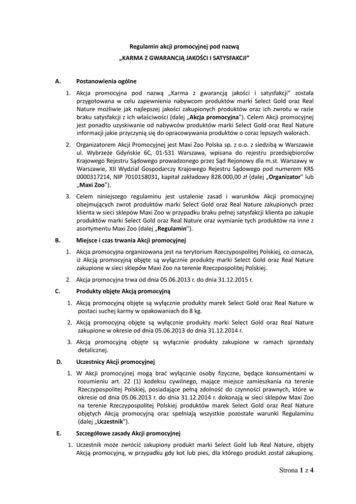 Regulamin akcji promocyjnej pod nazwą „KARMA Z GWARANCJĄ JAKOŚCI I SATYSFAKCJI” A. Postanowienia ogólne 1. Akcja promocyjna pod nazwą „Karma z gwarancją jakości i satysfakcji” została przygotowana w celu zapewnienia nabywcom produktów marki Select Gold oraz Real Nature możliwie jak najlepszej jakości zakupionych produktów oraz ich zwrotu w razie braku satysfakcji z ich właściwości (dalej „Akcja promocyjna”). Celem Akcji promocyjnej jest ponadto uzyskiwanie od nabywców produktów marki Select Gold oraz Real Nature informacji jakie przyczynią się do opracowywania produktów o coraz lepszych walorach. 2. Organizatorem Akcji Promocyjnej jest Maxi Zoo Polska sp. z o.o. z siedzibą w Warszawie ul. Wybrzeże Gdyńskie 6C, 01-531 Warszawa, wpisana do rejestru przedsiębiorców Krajowego Rejestru Sądowego prowadzonego przez Sąd Rejonowy dla m.st. Warszawy w Warszawie, XII Wydział Gospodarczy Krajowego Rejestru Sądowego pod numerem KRS 0000317214, NIP 7010158031, kapitał zakładowy 828.000,00 zł (dalej „Organizator” lub „Maxi Zoo”). 3. Celem niniejszego regulaminu jest ustalenie zasad i warunków Akcji promocyjnej obejmujących zwrot produktów marki Select Gold oraz Real Nature zakupionych przez klienta w sieci sklepów Maxi Zoo w przypadku braku pełnej satysfakcji klienta po zakupie produktów marki Select Gold oraz Real Nature oraz wymianie tych produktów na inne z asortymentu Maxi Zoo (dalej „Regulamin”). B. Miejsce i czas trwania Akcji promocyjnej 1. Akcja promocyjna organizowana jest na terytorium Rzeczypospolitej Polskiej, co oznacza, iż Akcją promocyjną objęte są wyłącznie produkty marki Select Gold oraz Real Nature zakupione w sieci sklepów Maxi Zoo na terenie Rzeczpospolitej Polskiej. 2. Akcja promocyjna trwa od dnia 05.06.2013 r. do dnia 31.12.2015 r. C. Produkty objęte Akcją promocyjną 1. Akcją promocyjną objęte są wyłącznie produkty marek Select Gold oraz Real Nature w postaci suchej karmy w opakowaniach do 8 kg. 2. Akcją promocyjną objęte są wyłącznie produkty marki Select Gold oraz Real Nature zakupione w okresie od dnia 05.06.2013 do dnia 31.12.2014 r. 3. Akcją promocyjną objęte są wyłącznie produkty zakupione w ramach sprzedaży detalicznej. D. Uczestnicy Akcji promocyjnej 1. W Akcji promocyjnej mogą brać wyłącznie osoby fizyczne, będące konsumentami w rozumieniu art. 22 (1) kodeksu cywilnego, mające miejsce zamieszkania na terenie Rzeczypospolitej Polskiej, posiadające pełną zdolność do czynności prawnych, które w okresie od dnia 05.06.2013 r. do dnia 31.12.2014 r. dokonają w sieci sklepów Maxi Zoo na terenie Rzeczypospolitej Polskiej produktów marek Select Gold oraz Real Nature objętych Akcją promocyjną oraz spełniają wszystkie pozostałe warunki Regulaminu (dalej „Uczestnik”). E. Szczegółowe zasady Akcji promocyjnej 1. Uczestnik może zwrócić zakupiony produkt marki Select Gold lub Real Nature, objęty Akcją promocyjną, w przypadku gdy kot lub pies, dla którego produkt został zakupiony, Strona 1 z 4 nie chce go jeść oraz wymienić zwracany produkt na inny produkt wybrany przez Uczestnika z asortymentu Maxi Zoo, dostępnego w momencie zwrotu w sklepie Maxi Zoo. 2. Zwrotu produktu marki Select Gold lub Real Nature należy dokonać w sklepie Maxi Zoo, w którym produkt został zakupiony. 3. Warunkiem zwrotu produktu jest w szczególności, aby Uczestnik w momencie zwrotu produktu: 1) przedstawił pracownikowi sklepu Maxi Zoo oryginał dowodu zakupu produktu marki Select Gold lub Real Nature, objętego Akcją promocyjną, w danym sklepie Maxi Z oo, to jest paragon lub fakturę; oraz 2) przyniósł do sklepu Maxi Zoo, w którym dokonał zakupu produktu, produkt marki Select Gold lub Real Natur w oryginalnym opakowaniu w ilości nie mniejszej niż 50% zawartości zwracanego opakowania produktu marki Select Gold lub Real Nature. 4. W celu ustalenia spełnienia warunków zwrotu, o których mowa w pkt 3 powyżej, pracownik sklepu Maxi Zoo waży otwarte i zwracane opakowanie produktu marki Select Gold lub Real Nature na wadze sklepowej jeszcze przed rozpoczęciem procedury wymiany produktu w obecności Uczestnika dokonującego zwrot produktu. 5. W przypadku braku wymaganej gramatury zwracanego produktu, określonej w pkt 3 ppkt 2 powyżej, lub braku dowodu zakupu, określonego w pkt 3 ppkt 1 powyżej, pracownik sklepu Maxi Zoo odmówi przyjęcia produktu i wymiany go na inny. 6. Zakupiony i zwracany produkt marki Select Gold lub Real Nature podlega wymianie na karmę innej marki o wartości tożsamej z wartością produktu zwracanego. 7. W przypadku wymiany na produkt droższy niż zwracany produkt marki Select Gold lub Real Nature, Uczestnik zobowiązany jest dopłacić różnicę pomiędzy produktem zwracanym a produktem wybranym przez Uczestnika. 8. Uczestnik nie może żądać zwrotu pieniędzy za zwracany produkt marki Select Gold lub Real Nature. 9. Pracownik sklepu Maxi Zoo zatrzymuje dowód zakupu zwracanego produktu marki Select Gold lub Real Nature. 10.Uczestnikowi wydawany jest nowy paragon/ faktura na wymieniony produkt. 11.Do zwracanego produktu Uczestnik może dołączyć własny opis braku satysfakcji z produktu. 12.Koszty zwrotu produktu marki Select Gold lub Real Nature ponosi Uczestnik. F. Ograniczenia udziału w Akcji promocyjnej 1. Uczestnikowi przysługuje prawo jednokrotnego udziału w Akcji promocyjnej. 2. W momencie przyjęcia zwrotu produktu marki Select Gold lub Real Nature pracownik sklepu Maxi Zoo poprosi Uczestnika o okazanie dowodu osobistego i spisze jego numer PESEL. W przypadku gdy okaże się, iż Uczestnik dokonał już wcześniej zwrotu produktu w ramach Akcji Promocyjnej, pracownik sklepu Maxi Zoo odmówi przyjęcia zwracanych produktów. 3. Zwrotu produktu marki Select Gold lub Real Nature można dokonać w nieprzekraczalnym terminie 30 dni od dnia zakupu. Strona 2 z 4 4. Uczestnik na podstawie jednego dowodu zakupu ma prawo do zwrotu ty