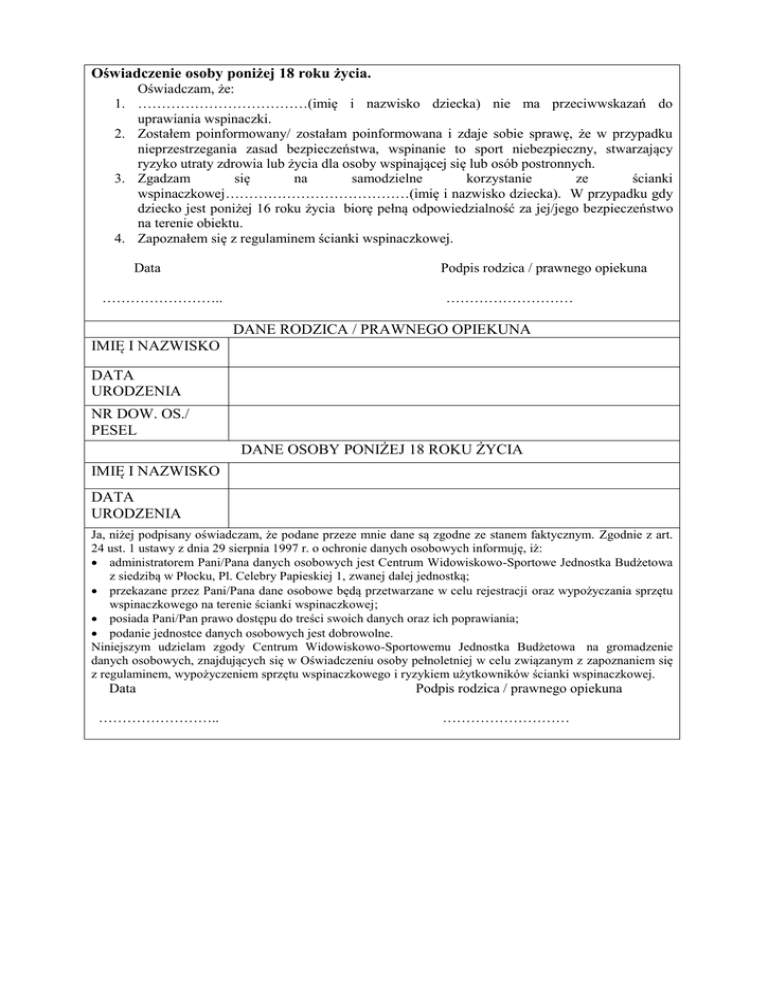 Oświadczenie osoby poniżej 18 roku życia. Oświadczam, że: 1. ………………………………(imię i nazwisko dziecka) nie ma przeciwwskazań do uprawiania wspinaczki. 2. Zostałem poinformowany/ zostałam poinformowana i zdaje sobie sprawę, że w przypadku nieprzestrzegania zasad bezpieczeństwa, wspinanie to sport niebezpieczny, stwarzający ryzyko utraty zdrowia lub życia dla osoby wspinającej się lub osób postronnych. 3. Zgadzam się na samodzielne korzystanie ze ścianki wspinaczkowej…………………………………(imię i nazwisko dziecka). W przypadku gdy dziecko jest poniżej 16 roku życia biorę pełną odpowiedzialność za jej/jego bezpieczeństwo na terenie obiektu. 4. Zapoznałem się z regulaminem ścianki wspinaczkowej. Data …………………….. Podpis rodzica / prawnego opiekuna ……………………… DANE RODZICA / PRAWNEGO OPIEKUNA IMIĘ I NAZWISKO DATA URODZENIA NR DOW. OS./ PESEL DANE OSOBY PONIŻEJ 18 ROKU ŻYCIA IMIĘ I NAZWISKO DATA URODZENIA Ja, niżej podpisany oświadczam, że podane przeze mnie dane są zgodne ze stanem faktycznym. Zgodnie z art. 24 ust. 1 ustawy z dnia 29 sierpnia 1997 r. o ochronie danych osobowych informuję, iż: administratorem Pani/Pana danych osobowych jest Centrum Widowiskowo-Sportowe Jednostka Budżetowa z siedzibą w Płocku, Pl. Celebry Papieskiej 1, zwanej dalej jednostką; przekazane przez Pani/Pana dane osobowe będą przetwarzane w celu rejestracji oraz wypożyczania sprzętu wspinaczkowego na terenie ścianki wspinaczkowej; posiada Pani/Pan prawo dostępu do treści swoich danych oraz ich poprawiania; podanie jednostce danych osobowych jest dobrowolne. Niniejszym udzielam zgody Centrum Widowiskowo-Sportowemu Jednostka Budżetowa na gromadzenie danych osobowych, znajdujących się w Oświadczeniu osoby pełnoletniej w celu związanym z zapoznaniem się z regulaminem, wypożyczeniem sprzętu wspinaczkowego i ryzykiem użytkowników ścianki wspinaczkowej. Data …………………….. Podpis rodzica / prawnego opiekuna ………………………