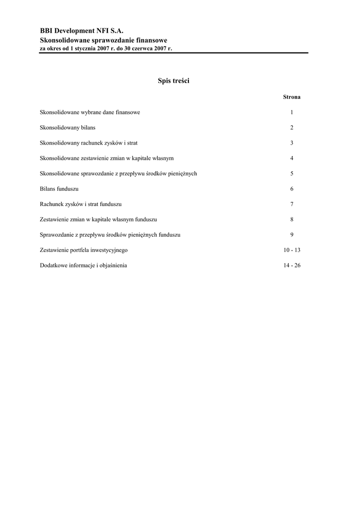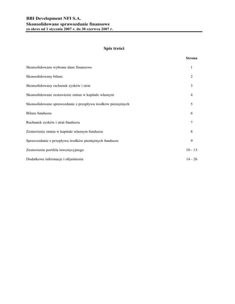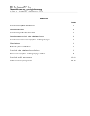 BBI Development NFI S.A. Skonsolidowane sprawozdanie finansowe za okres od 1 stycznia 2007 r. do 30 czerwca 2007 r. Spis treści Strona Skonsolidowane wybrane dane finansowe 1 Skonsolidowany bilans 2 Skonsolidowany rachunek zysków i strat 3 Skonsolidowane zestawienie zmian w kapitale własnym 4 Skonsolidowane sprawozdanie z przepływu środków pienięŜnych 5 Bilans funduszu 6 Rachunek zysków i strat funduszu 7 Zestawienie zmian w kapitale własnym funduszu 8 Sprawozdanie z przepływu środków pienięŜnych funduszu 9 Zestawienie portfela inwestycyjnego 10 - 13 Dodatkowe informacje i objaśnienia 14 - 26 BBI Development NFI S.A. Skonsolidowane wybrane dane finansowe 1 za okres od 1 stycznia 2007 r. do 30 czerwca 2007 r. Przychody z inwestycji Przychody operacyjne, razem Koszty operacyjne Zysk (strata) z działalności operacyjnej Zysk (strata) netto Zysk (strata) netto na akcję zwykłą (w zł/EUR): - podstawowy oraz rozwodniony w tys. zł 2007 r. 2006 r. narastająco narastająco 2 485 3 270 2 653 3 342 (1 752) (1 055) 901 2 287 103 2 678 0,00 0,12 w tys. EUR 2007 r. 2006 r. narastająco narastająco 646 838 689 857 (455) (270) 234 586 27 687 - - Przepływy środków pienięŜnych z działalności operacyjnej (95 461) 2 442 (24 804) 626 Przepływy środków pienięŜnych z działalności finansowej Przepływy pienięŜne netto 86 768 (8 693) 2 442 22 545 (2 259) 626 30.06.2007 Aktywa, razem Kapitał własny, razem Zobowiązania, razem Liczba akcji (w szt.) Wartość aktywów netto na jedną akcję (w zł/EUR) w tys. zł 31.12.2006 w tys. EUR 30.06.2007 31.12.2006 143 366 110 974 32 392 54 583 53 808 775 38 071 29 469 8 602 13 869 13 672 197 228 435 320 0,49 114 217 660 0,47 114 217 660 0,26 114 217 660 0,12 BBI Development NFI S.A. Skonsolidowany bilans na dzień 30 czerwca 2007 r. w tys. zł 2 30.06.2007 31.12.2006 AKTYWA Aktywa trwałe Rzeczowe aktywa trwałe Inwestycje - nieruchomości Wartość firmy Wartości niematerialne i prawne Aktywa z tytułu odroczonego podatku dochodowego Aktywa finansowe dostępne do sprzedaŜy Pozostałe aktywa finansowe Rozliczenia międzyokresowe 19 355 73 144 111 24 1 473 8 862 3 162 106 131 620 29 1 412 85 2 146 21 976 1 798 25 943 - 13 461 37 235 4 340 22 154 52 437 143 366 54 583 Kapitał własny przypisany akcjonariuszom Funduszu Kapitał zakładowy Kapitał zapasowy Niepodzielony zysk (nie pokryta strata) 22 844 163 230 (75 404) 11 422 117 845 (75 459) Udział mniejszości 110 670 304 53 808 - Kapitał własny, razem 110 974 53 808 30 619 847 31 466 537 537 926 926 238 238 32 392 775 143 366 54 583 Aktywa obrotowe NaleŜności z tytułu dostaw i usług oraz pozostałe Rozliczenia międzyokresowe Aktywa finansowe wg wart. godziwej przez rach.zysków i strat Środki pienięŜne i inne aktywa pienięŜne Aktywa, razem KAPITAŁ WŁASNY ZOBOWIĄZANIA Zobowiązania długoterminowe Zobowiąz. z tyt. wyemit. dłuŜnych papierów wart. Rezerwa z tytułu odroczonego podatku dochodowego Zobowiązania krótkoterminowe Zobowiązania z tytułu dostaw i usług oraz pozostałe Zobowiązania, razem Pasywa, razem BBI Development NFI S.A. Skonsolidowany rachunek zysków i strat 3 za okres od 1 stycznia 2007 r. do 30 czerwca 2007 r. 2007 r. w tys. zł II Kwartał Przychody z inwestycji Przychody z innych papierów wartościowych Przychody z tytułu odsetek 2006 r. II Kwartał narastająco II Kwartał II Kwartał narastająco 626 706 1 39 39 118 934 1 560 1 779 2 485 1 542 1 582 3 113 3 270 Pozostałe przychody operacyjne 149 168 56 72 Przychody operacyjne, razem 1 709 2 653 1 638 3 342 Zrealizowane i niezrealizowane zyski (straty) z inwestycji Koszty operacyjne Wynagrodzenia Ubezpieczenia społeczne i inne świadczenia Amortyzacja Pozostałe koszty administracyjne Pozostałe koszty operacyjne Zysk (strata) z działalności operacyjnej Koszty finansowe (netto) Podatek dochodowy Zysk (strata) netto Przypisany dla: Akcjonariuszy Funduszu Udział mniejszości Zysk (strata) netto na akcję zwykłą (w zł) - podstawowy oraz rozwodniony (214) (75) (42) (634) (965) (330) (124) (89) (1 209) (1 752) 744 901 (617) (18) (550) (248) 109 (136) (10) (11) (373) (57) (587) (406) (23) (27) (542) (57) (1 055) 1 051 2 287 12 379 12 379 103 1 442 2 678 91 18 109 55 48 103 1 442 2 678 1 442 2 678 0,00 0,00 0,06 0,12 BBI Development NFI S.A. Skonsolidowane zestawienie zmian w kapitale własnym 4 za okres od 1 stycznia 2007 r. do 30 czerwca 2007 r. w tys. zł 2007 r. Saldo na początek okresu PodwyŜszenie kapitału Zysk (strata) netto Saldo na koniec okresu 2006 r. Saldo na początek okresu Zysk (strata) netto PodwyŜszenie kapitału Saldo na koniec okresu Kapitał własny przypisany akcjonariuszom Funduszu Kapitał Kapitał Wynik zakładowy zapasowy finansowy 11 422 11 422 117 845 45 385 22 844 163 230 2 284 2 284 (75 459) Udział mniejszości Razem 55 (75 404) 102 154 48 304 53 910 56 961 103 110 974 109 119 (78 312) 2 678 - 109 119 (75 634) - 33 091 2 678 35 769 BBI Development NFI S.A. Skonsolidowane sprawozdanie z przepływu środków pienięŜnych 5 za okres od 1 stycznia 2007 r. do 30 czerwca 2007 r. w tys. zł Przepływy środków pienięŜnych z działalności operacyjnej Nabycie rzeczowych aktywów trwałych i wartości niematerialnych Nabycie nieruchomości inwestycyjnych Zbycie rzeczowych aktywów trwałych i wartości niematerialnych Nabycie papierów wartościowych Zbycie papierów wartościowych Odsetki i dywidendy Udzielone poŜyczki Zwrot z tytułu udzielonych poŜyczek Pozostałe przepływy Przepływy środków pienięŜnych z działalności finansowej Emisja akcji Emisja dłuŜnych papierów wartościowych 2007 r. (18 949) (67 150) 132 3 990 1 189 (9 472) 785 (5 986) (95 461) 56 990 29 778 86 768 2006 r. (10) 145 (4 778) 11 492 291 1 879 (6 577) 2 442 - Przepływy pienięŜne netto (8 693) 2 442 Środki pienięŜne na początek okresu 22 154 100 Środki pienięŜne na koniec okresu 13 461 2 542 BBI Development NFI S.A. Bilans funduszu na dzień 30 czerwca 2007 r. w