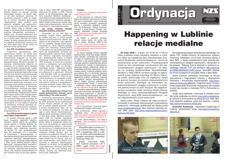Czy JOW nie zwiększy korupcji? Przeciwnicy wprowadzenia JOW argumentują czasem, że lokalni politycy będą uzależnieni od miejscowych biznesmenów, łożących na ich kampanie wyborcze. Tym samym JOW ma sprzyjać korupcji. Nie jest to prawda. Po pierwsze, doświadczenie ostatnich lat pokazuje, że to obecne partie wpadają w krąg interesów biznesmenów, często tych z najwyższej półki (tzw. oligarchów). (Oczywiście taniej jest kupić jeden okręg niż cały kraj, jeszcze mniej kosztuje jednak kupienie dobrego miejsca na liście wyborczej...). Co ważniejsze jednak, badania porównawcze krajów o różnych systemach wyborczych wykazały, że to ordynacja proporcjonalna sprzyja korupcji. [4] Wg autorek pracy, p. Kuznicovej i Rose-Ackerman, kluczową rolę odgrywa wielkość okręgu wyborczego: mały jednomandatowy okręg pozwala obywatelom lepiej nadzorować swojego posła. Również większa niezależność działaczy od kierownictwa partii powoduje, że są oni bardziej skłonni ujawniać afery w swojej partii. [5] Inne badania wskazują na pozytywną korelację pomiędzy korupcją a rządami koalicyjnymi, praktycznie nieuniknionymi przy tzw. ordynacji proporcjonalnej. [6] Czy JOW sprawdził się jeszcze gdzieś poza krajami anglosaskimi? Co prawda ordynacja oparta o JOW bywa nazywana systemem westminsterskim, jednak trudno jej początków szukać jedynie w Wielkiej Brytanii. Zasady wyboru przez głosowanie większościowe, jako najbardziej naturalne, są starsze niż sam parlamentaryzm. Były one stosowane m.in. w demokracji szlacheckiej I Rzeczpospolitej. [7] We współczesnej Europie zachodniej zdecydowana większość najpotężniejszych krajów stosuje ordynację większościową z JOW: oprócz Wielkiej Brytanii (JOW z jedna turą: „zwycięzca bierze wszystko”), są to Francja (dwie tury), Niemcy (ordynacja mieszana większościowo-proporcjonalna), a do niedawna również Włochy. W tym ostatnim kraju na fali akcji społecz4 Czy zmiana ordynacji rozwiąże wszystkie problemy polityczne? Oczywiście, że nie. Nikt tego nie oczekuje. Jednak trudno zaprzeczyć, że system wyborczy w istotny sposób wpływa na życie polityczne. Ważne, aby wpływ ten był pozytywny i aby odpowiadał na problemy stojące przed społeczeństwem tu i teraz. Obecnie obowiązująca tzw. ordynacja proporcjonalna nie sprawdza się, sprzyjając patologiom takim jak partyjniactwo, korupcja czy nieprzejrzystość mechanizmów rządzenia. Zarówno argumenty teoretyczne, jak i doświadczenie krajów, w których obowiązuje ordynacja większościowa z JOW wskazują, że może ona znacząco pomóc w rozwiązaniu tych problemów. Polska, jako kraj ciągle „na dorobku” potrzebuje silnych i stabilnych rządów oraz wzmacniania więzi między elitami politycznymi a wyborcami. Również w tym zakresie JOW są rozwiązaniem sprawdzonym w świecie. JOW nie stanowią panaceum na wszystkie problemy, ale to ważny krok, który pomoże nam spełnić marzenia o nowoczesnym i uczciwym państwie. Dzięki JOW znacznie więcej w naszym kraju będzie zależało od nas. Czy JOW sprawdzi się w Polsce? Czy polskie społeczeństwo „dojrzało” już do takiej zmiany? Czy sobie poradzi? Przeciwnicy wprowadzenia JOW powtarzają czasem, że nikt nie udowodnił, że JOW sprawdzi się we współczesnej Polsce. Trudno odmówić im racji. Nie jest to jednak słabość postulatu JOW, a prosta konsekwencja faktu, że życie społeczno-polityczne nie daje się ująć w ramy równań matematycznych. Niedojrzałość polskiego społeczeństwa to inny dość częsty argument przeciwników JOW. Co ciekawe, najczęściej podnoszony chyba przez polskich polityków, którzy w następnym zdaniu mówią o tym, że przecież oni zostali przez to społeczeństwo wybrani:-). Ale wracając do meritum. Z „niedojrzałością” społeczeństwa jest trochę tak jak z nauką chodzenia małego dziecka. Jeśli nie pozwolimy mu próbować chodzić, nawet jak czasami miałoby się przewrócić, to nigdy chodzić się nie nauczy. Jeśli polskie społeczeństwo dalej będzie funkcjonować w obecnym, deprawującym systemie, to nie tylko, że nie będzie się uczyć demokracji, ale wręcz przeciwnie, będzie się do niej coraz bardziej zniechęcać. Zresztą, czy naprawdę jesteśmy aż tak „niedojrzali”? Przypisy: [1] http://www.parliament.uk/about/how/ elections/general.cfm [2] Wg wskaźnika zw. indeksem Gallaghera lub indeksem najmniejszych kwadratów (jest to pierwiastek z sumy kwadratów różnić pomiędzy procentem uzyskanych głosów, a procentem zdobytych mandatów). Za M.Spławski, „Oblicza proporcjonalności” w Znaki Nowych Czasów, listopad/luty 2003/2004, Instytut Socjologii UMK (http://www.kontrateksty.pl/files/news/20040917102355.html) [3] CBOS: w wyborach samorządowych ważna osoba, nie partia artykuł w portalu Money.pl (2007-01-18): http://www.money.pl/archiwum/wiadomosci_agencyjne/pap/artykul/cbos;w;wyborach;samorzadowych;wazna;osoba;nie;partia,53,0,216629.html [4] Autorki poddając analizie ordynacje proporcjonalną, biorą pod uwagę oddziaływanie otwartej i zamkniętej listy wyborczej. W kręgu ich zainteresowań jest odpowiedź na pytanie, w jaki sposób poddane analizie ordynacje wyborcze wypełniają dwie główne - dla demokracji - funkcje: (1) wykluczają (selekcjonują) aktorów politycznych, którzy nie zaspokajają preferencji wyborczych; (2) pozwalają „ukarać” (rozliczyć) polityków, którzy na to zasłużą. Zob. A. Z. Kamiński, Ustrojowe źródła renty politycznej - kryzys III RP, referat wygłoszony podczas konferencji naukowej Jak wybierać naszych reprezentantów do Sejmu? System wyborczy większościowy czy proporcjonalny? Kielce, 17 marca 2004 r., publikacja w druku, referat dostępny jest na www.radiofama.com.pl. Za R. Graczkowski, „Znaczenie jednomandatowych okręgów wyborczych dla zmiany standardów sprawowania funkcji publicznych” w: „Kierunki badawcze młodzieży akademickiej”,