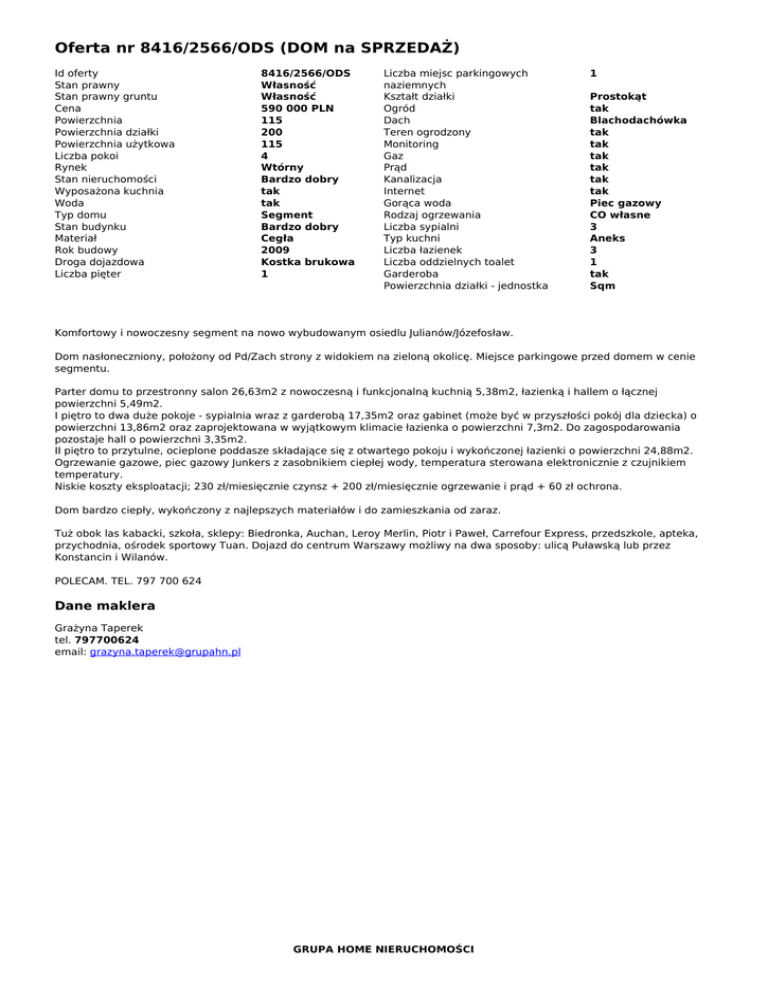 Oferta nr 8416/2566/ODS (DOM na SPRZEDAŻ) Id oferty Stan prawny Stan prawny gruntu Cena Powierzchnia Powierzchnia działki Powierzchnia użytkowa Liczba pokoi Rynek Stan nieruchomości Wyposażona kuchnia Woda Typ domu Stan budynku Materiał Rok budowy Droga dojazdowa Liczba pięter 8416/2566/ODS Własność Własność 590 000 PLN 115 200 115 4 Wtórny Bardzo dobry tak tak Segment Bardzo dobry Cegła 2009 Kostka brukowa 1 Liczba miejsc parkingowych naziemnych Kształt działki Ogród Dach Teren ogrodzony Monitoring Gaz Prąd Kanalizacja Internet Gorąca woda Rodzaj ogrzewania Liczba sypialni Typ kuchni Liczba łazienek Liczba oddzielnych toalet Garderoba Powierzchnia działki - jednostka 1 Prostokąt tak Blachodachówka tak tak tak tak tak tak Piec gazowy CO własne 3 Aneks 3 1 tak Sqm Komfortowy i nowoczesny segment na nowo wybudowanym osiedlu Julianów/Józefosław. Dom nasłoneczniony, położony od Pd/Zach strony z widokiem na zieloną okolicę. Miejsce parkingowe przed domem w cenie segmentu. Parter domu to przestronny salon 26,63m2 z nowoczesną i funkcjonalną kuchnią 5,38m2, łazienką i hallem o łącznej powierzchni 5,49m2. I piętro to dwa duże pokoje - sypialnia wraz z garderobą 17,35m2 oraz gabinet (może być w przyszłości pokój dla dziecka) o powierzchni 13,86m2 oraz zaprojektowana w wyjątkowym klimacie łazienka o powierzchni 7,3m2. Do zagospodarowania pozostaje hall o powierzchni 3,35m2. II piętro to przytulne, ocieplone poddasze składające się z otwartego pokoju i wykończonej łazienki o powierzchni 24,88m2. Ogrzewanie gazowe, piec gazowy Junkers z zasobnikiem ciepłej wody, temperatura sterowana elektronicznie z czujnikiem temperatury. Niskie koszty eksploatacji; 230 zł/miesięcznie czynsz + 200 zł/miesięcznie ogrzewanie i prąd + 60 zł ochrona. Dom bardzo ciepły, wykończony z najlepszych materiałów i do zamieszkania od zaraz. Tuż obok las kabacki, szkoła, sklepy: Biedronka, Auchan, Leroy Merlin, Piotr i Paweł, Carrefour Express, przedszkole, apteka, przychodnia, ośrodek sportowy Tuan. Dojazd do centrum Warszawy możliwy na dwa sposoby: ulicą Puławską lub przez Konstancin i Wilanów. POLECAM. TEL. 797 700 624 Dane maklera Grażyna Taperek tel. 797700624 email: [email protected] GRUPA HOME NIERUCHOMOŚCI Powered by TCPDF (www.tcpdf.org)