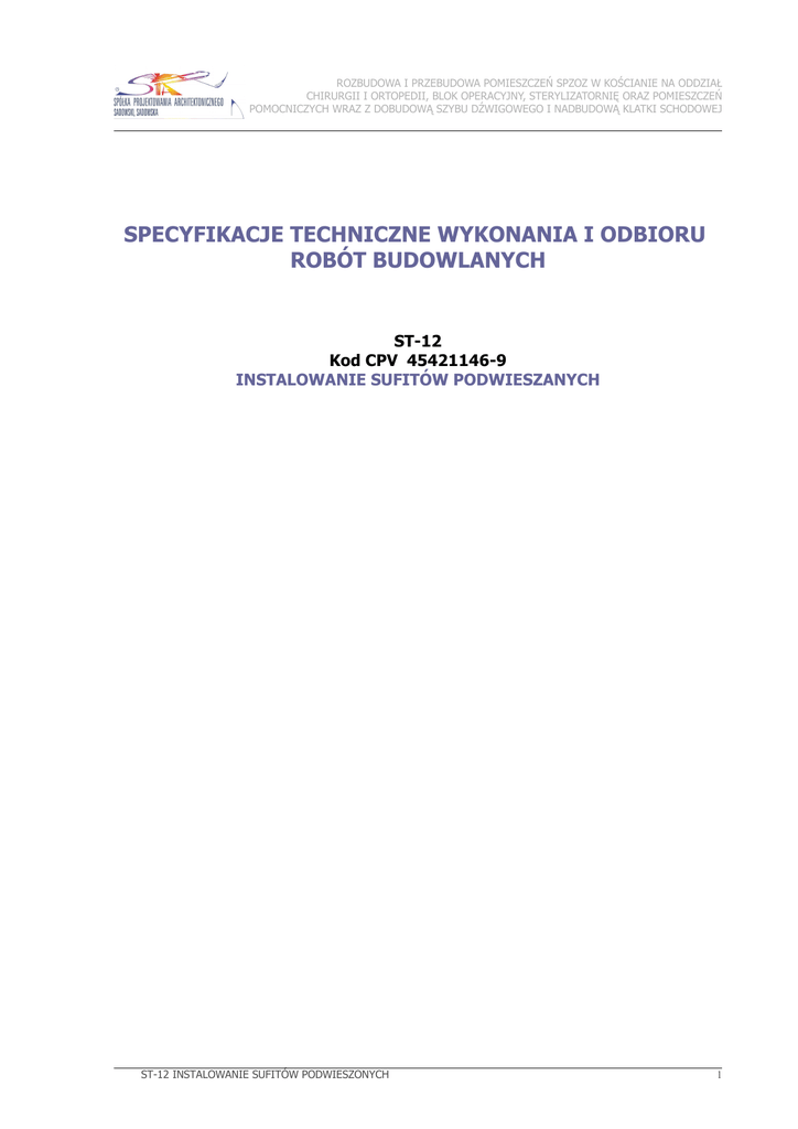 ROZBUDOWA I PRZEBUDOWA POMIESZCZEŃ SPZOZ W KOŚCIANIE NA ODDZIAŁ CHIRURGII I ORTOPEDII, BLOK OPERACYJNY, STERYLIZATORNIĘ ORAZ POMIESZCZEŃ POMOCNICZYCH WRAZ Z DOBUDOWĄ SZYBU DŹWIGOWEGO I NADBUDOWĄ KLATKI SCHODOWEJ SPECYFIKACJE TECHNICZNE WYKONANIA I ODBIORU ROBÓT BUDOWLANYCH ST-12 Kod CPV 45421146-9 INSTALOWANIE SUFITÓW PODWIESZANYCH ST-12 INSTALOWANIE SUFITÓW PODWIESZONYCH 1 ROZBUDOWA I PRZEBUDOWA POMIESZCZEŃ SPZOZ W KOŚCIANIE NA ODDZIAŁ CHIRURGII I ORTOPEDII, BLOK OPERACYJNY, STERYLIZATORNIĘ ORAZ POMIESZCZEŃ POMOCNICZYCH WRAZ Z DOBUDOWĄ SZYBU DŹWIGOWEGO I NADBUDOWĄ KLATKI SCHODOWEJ SPIS TREŚCI 1. WSTĘP ..................................................................................................................... 2. MATERIAŁY .............................................................................................................. 3. SPRZĘT .................................................................................................................... 4. TRANSPORT ............................................................................................................. 5. WYKONANIE ROBÓT .................................................................................................. 6. KONTROLA JAKOŚCI ROBÓT ..................................................................................... 7. OBMIAR ROBÓT ....................................................................................................... 8. ODBIÓR ROBÓT ....................................................................................................... 9. PODSTAWA PŁATNOŚCI ............................................................................................ 10. PRZEPISY ZWIĄZANE .............................................................................................. NajwaŜniejsze oznaczenia i skróty: ST – Specyfikacja Techniczna PZJ – Program Zabezpieczenia Jakości ITB – Instytut Techniki Budowlanej 2 ST-12 INSTALOWANIE SUFITÓW PODWIESZONYCH 3 3 5 5 6 8 8 8 9 9 ROZBUDOWA I PRZEBUDOWA POMIESZCZEŃ SPZOZ W KOŚCIANIE NA ODDZIAŁ CHIRURGII I ORTOPEDII, BLOK OPERACYJNY, STERYLIZATORNIĘ ORAZ POMIESZCZEŃ POMOCNICZYCH WRAZ Z DOBUDOWĄ SZYBU DŹWIGOWEGO I NADBUDOWĄ KLATKI SCHODOWEJ 1. WSTĘP 1.1. Przedmiot ST Przedmiotem niniejszej standardowej specyfikacji technicznej (ST) są wymagania dotyczące wykonania i odbioru robót związanych z instalowaniem sufitów podwieszanych dla rozbudowy i przebudowy pomieszczeń szpitala SPZOZ w Kościanie na oddział chirurgii i ortopedii, blok operacyjny, sterylizatornię oraz pomieszczeń pomocniczych z dobudową szybu dźwigowego i nadbudową klatki schodowej. 1.2. Zakres stosowania ST Niniejsza specyfikacja techniczna (ST) jest stosowana przy realizacji robót wymienionych w pkt. 1.1. Odstępstwa od wymagań podanych w niniejszej specyfikacji mogą mieć miejsce tylko w przypadkach prostych robót o niewielkim znaczeniu, dla których istnieje pewność, Ŝe podstawowe wymagania będą spełnione przy zastosowaniu metod wykonania wynikających z doświadczenia oraz uznanych reguł i zasad sztuki budowlanej oraz przy uwzględnieniu obowiązujących przepisów bhp. 1.3. Zakres robót objętych ST W ramach prac budowlanych przewiduje się wykonanie wszystkich czynności mających na celu montaŜ sufitów podwieszanych systemowych na ruszcie stalowym. W zakres tych robót wchodzą: - sprawdzenie z jakiego materiału wykonany jest strop zasadniczy, naniesienie siatki konstrukcji na stropie zasadniczym oraz wytrasowanie miejsc montaŜu wieszaków, - zaznaczenie na ścianach linii poziomów sufitu i montaŜ listew przyściennych, - montaŜ stalowej konstrukcji nośnej – na wieszakach wieszane są profile główne i poprzeczne, - wykonanie montaŜu w koordynacji z wykonawcą branŜy teletechnicznej i elektrycznej montowanych nad sufitami urządzeń, wykonania przejść przez sufity, - montaŜ płyt, - wykończenie styku ze ścianą kątownikiem przyściennym lub listwą cieniową. Uwaga: miejscowo występujące obrzeŜa sufitów systemowych wykonane z płyt gipsowo – kartonowych podano w specyfikacji technicznej ST-09. 1.4. Określenia podstawowe Określenia podstawowe uŜyte w niniejszej ST są zgodne z obowiązującymi Polskimi Normami i Ogólną Specyfikacją Techniczną pkt.1.5. 1.5. Ogólne wymagania dotyczące robót Wykonawca robót jest odpowiedzialny za jakość ich wykonania oraz za ich zgodność z dokumentacją projektową, ST. Ogólne wymagania dotyczące robót podano w ST Kod CPV 45000000-7 „Wymagania ogólne” pkt 1.5. Przed przystąpieniem do montaŜu sufitów na ruszcie powinny zostać zakończone wszelkie roboty stanu surowego wraz z montaŜem instalacji elektrycznych i teletechnicznych, wentylacyjnych, c.o. wodno – kanalizacyjnych, itd. Pomieszczenia powinny być suche i przewietrzone. 2. MATERIAŁY 2.1. Ogólne wymagania dotyczące materiałów. Ogólne wymagania dotyczące materiałów i ich rodzaju podano w ST Kod CPV 45000000-7 „Wymagania ogólne” pkt 2. 2.2. Rodzaje sufitów podwieszonych przyjętych w projekcie: 2.2.1. Sufity podwieszone systemowe kasetonowe : a) ROCKFON MEDICARE - Higieniczny i akustyczny sufit podwieszony z płyt wypełniających typu ST-12 INSTALOWANIE SUFITÓW PODWIESZONYCH 3 ROZBUDOWA I PRZEBUDOWA POMIESZCZEŃ SPZOZ W KOŚCIANIE NA ODDZIAŁ CHIRURGII I ORTOPEDII, BLOK OPERACYJNY, STERYLIZATORNIĘ ORAZ POMIESZCZEŃ POMOCNICZYCH WRAZ Z DOBUDOWĄ SZYBU DŹWIGOWEGO I NADBUDOWĄ KLATKI SCHODOWEJ ROCKFON MEDICARE lub równowaŜny - z prasowanej wełny kamiennej bez dodatków organicznych; kolor RAL 9016 (biały); w module 600x600mm, 600x1200mm, 600x1800mm, 600x2100mm, 600x2400mm ; grubość 20mm; E24 (efekt sufitu z częściowo ukrytą krawędzią ); demontowalny. b) ROCKFON MEDICARE ULTRA - Higieniczny i akustyczny sufit podwieszony z płyt wypełniających typu ROCKFON MEDICARE ULTRA lub równowaŜny - z prasowanej wełny kamiennej bez dodatków organicznyc