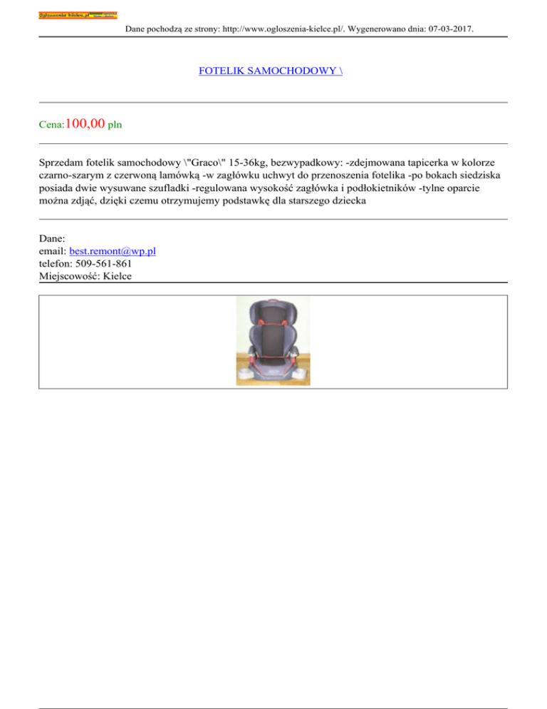 Dane pochodzą ze strony: http://www.ogloszenia-kielce.pl/. Wygenerowano dnia: 07-03-2017. FOTELIK SAMOCHODOWY \ Cena:100,00 pln Sprzedam fotelik samochodowy \"Graco\" 15-36kg, bezwypadkowy: -zdejmowana tapicerka w kolorze czarno-szarym z czerwoną lamówką -w zagłówku uchwyt do przenoszenia fotelika -po bokach siedziska posiada dwie wysuwane szufladki -regulowana wysokość zagłówka i podłokietników -tylne oparcie można zdjąć, dzięki czemu otrzymujemy podstawkę dla starszego dziecka Dane: email: [email protected] telefon: 509-561-861 Miejscowość: Kielce