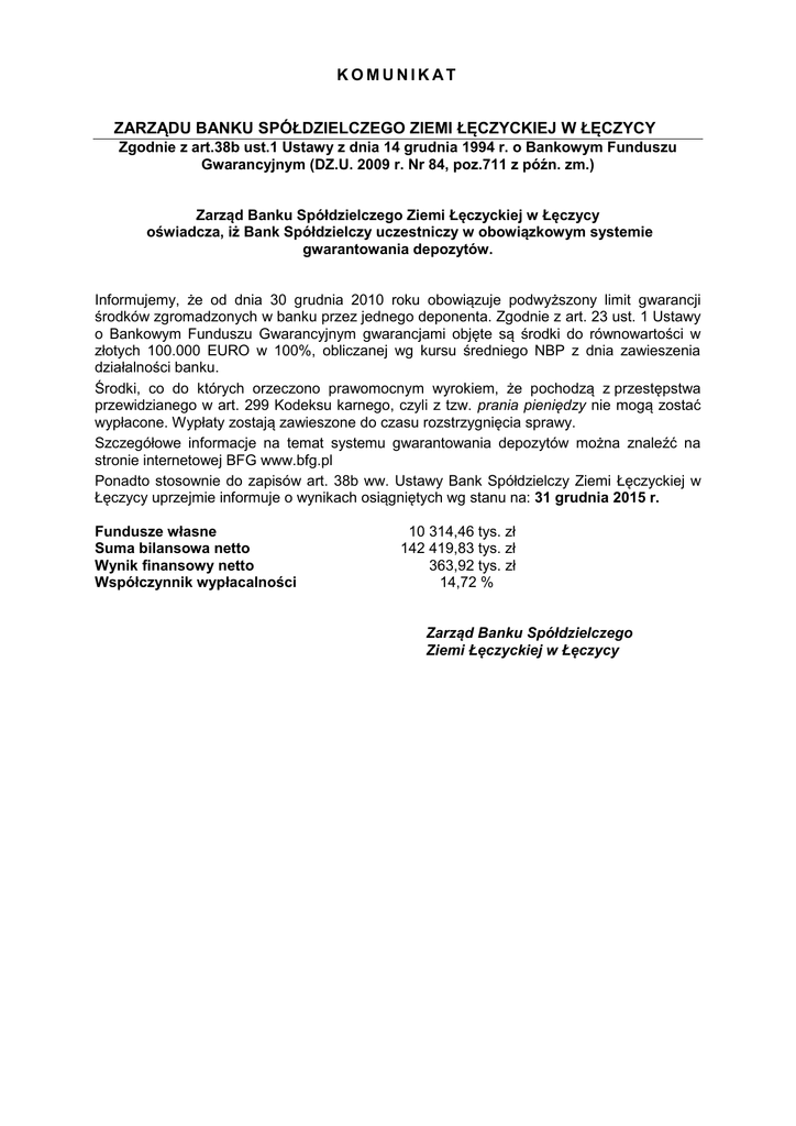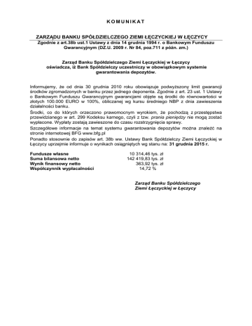 KOMUNIKAT ZARZĄDU BANKU SPÓŁDZIELCZEGO ZIEMI ŁĘCZYCKIEJ W ŁĘCZYCY Zgodnie z art.38b ust.1 Ustawy z dnia 14 grudnia 1994 r. o Bankowym Funduszu Gwarancyjnym (DZ.U. 2009 r. Nr 84, poz.711 z późn. zm.) Zarząd Banku Spółdzielczego Ziemi Łęczyckiej w Łęczycy oświadcza, iż Bank Spółdzielczy uczestniczy w obowiązkowym systemie gwarantowania depozytów. Informujemy, że od dnia 30 grudnia 2010 roku obowiązuje podwyższony limit gwarancji środków zgromadzonych w banku przez jednego deponenta. Zgodnie z art. 23 ust. 1 Ustawy o Bankowym Funduszu Gwarancyjnym gwarancjami objęte są środki do równowartości w złotych 100.000 EURO w 100%, obliczanej wg kursu średniego NBP z dnia zawieszenia działalności banku. Środki, co do których orzeczono prawomocnym wyrokiem, że pochodzą z przestępstwa przewidzianego w art. 299 Kodeksu karnego, czyli z tzw. prania pieniędzy nie mogą zostać wypłacone. Wypłaty zostają zawieszone do czasu rozstrzygnięcia sprawy. Szczegółowe informacje na temat systemu gwarantowania depozytów można znaleźć na stronie internetowej BFG www.bfg.pl Ponadto stosownie do zapisów art. 38b ww. Ustawy Bank Spółdzielczy Ziemi Łęczyckiej w Łęczycy uprzejmie informuje o wynikach osiągniętych wg stanu na: 31 grudnia 2015 r. Fundusze własne Suma bilansowa netto Wynik finansowy netto Współczynnik wypłacalności 10 314,46 tys. zł 142 419,83 tys. zł 363,92 tys. zł 14,72 % Zarząd Banku Spółdzielczego Ziemi Łęczyckiej w Łęczycy