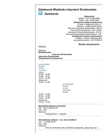 Dziekanat Wydziału Inżynierii Środowiska Dziekanat Sekretariat Telefon: +48 12 628 2801 Faks: +48 12 628 3080 Dziekanat studiów stacjonarnych E-mail: [email protected] Telefony - studia stacjonarne: kierunek Inżynieria Środowiska: +48 12 628 2 kierunek Budownictwo: +48 12 628 2097 kierunek Ochrona Środowiska: +48 12 628 28 kierunek Gospodarka Przestrzenna: +48 12 628 Dziekanat studiów niestaconarmych Telefony - studia niestacjonarne: wszystkie kierunki: +48 12 628 2805 Studia stacjonarne: Kierunki: Kierunki: Budownictwo Ochrona Środowiska Inżynieria Środowiska Gospodarka Przestrzenna poniedziałek: wtorek: środa: czwartek: piątek: 10.00 - 13.00 10.00 - 13.00 10.00 - 13.00 nieczynne 10.00 - 13.00 poniedziałek: wtorek: środa: czwartek: piątek: 10.00 - 12.00 10.00 - 12.00 10.00 - 12.00 nieczynne 13.00 - 15.00 Specjalista Bożena Kośmider Tel.: +48 12 628 20 97, Pok.: 332. Kierunki: - Budownictwo - I stopień, Samodzielny referent inż. Anna Hodbod Tel.: + 12 628 20 97, Pok.: 332. Kierunki: - Pomoc materialna dla studentów (stypendia, zapomogi, itp.) samodzielny referent mgr Anna Rogóż samodzielny referent mgr Anna Rogóż Tel.: + 12 628 28 05, Pok.: 328. Kierunki: - Gospodarka Przestrzenna - Ochrona Środowiska Starszy referent: mgr Zoya Świerk Tel: +12 628 2095 Pok.329 Kierunki: - Inżynieria Środowiska, rok I i II - studia I stopnia Starszy referent: Agnieszka Klimala Tel: +12 628 2095 Pok.329 Kierunki: - Inżynieria Środowiska, rok III - studia I stopnia - Inżynieria Środowiska - studia II stopnia Studia niestacjonarne: poniedziałek nieczynne wtorek 10 ÷ 12 środa 10 ÷ 12 czwartek nieczynne piątek 13 ÷ 15 sobota Specjalista mgr inż. Andrzej Kulig tel: 012 628 2805 pok. 328 kierunki: (I i II stopnia) Inżynieria Środowiska Budownictwo Ochrona Środowiska 9 ÷ 14 00 00 00 00 00 00 00 00 POMOC MATERIALNA, STYPENDIA, SPRAWY SOCJALNE Prowadzenie spraw związanych z pomocą naterialną dla studentów studiów stacjonarnych i niestacjonarnych, zaświadczenia ZUS Specjalista inż. Anna Hodbod tel: 012 628 2097 pok. 332 Wydawanie dyplomów i suplementów - studia stacjonarne i niestacjonarne mgr Marta Madej tel:SPRAWY 012 628 2801 pok. 326 DYPLOMY, SUPLEMENTY, ABSOLWENTÓW © Wydział Inżynierii Środowiska http://www.wis.pk.edu.pl/