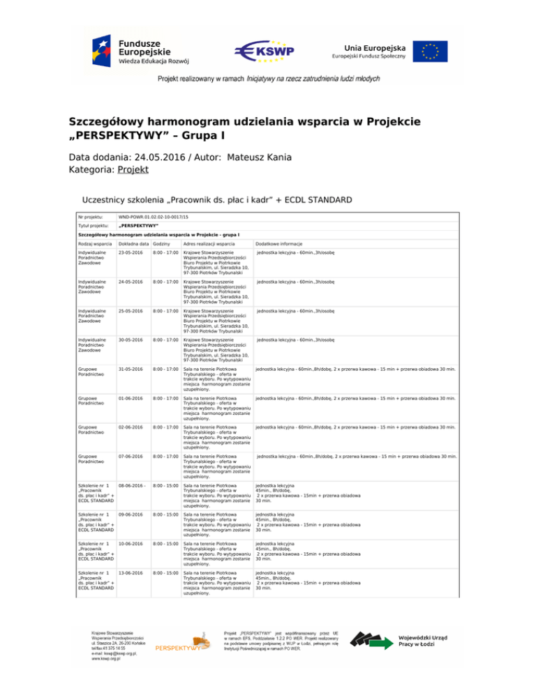 . Szczegółowy harmonogram udzielania wsparcia w Projekcie „PERSPEKTYWY” – Grupa I Data dodania: 24.05.2016 / Autor: Mateusz Kania Kategoria: Projekt Uczestnicy szkolenia „Pracownik ds. płac i kadr” + ECDL STANDARD Nr projektu: WND-POWR.01.02.02-10-0017/15 Tytuł projektu: „PERSPEKTYWY” Szczegółowy harmonogram udzielania wsparcia w Projekcie - grupa I Rodzaj wsparcia Dokładna data Godziny Adres realizacji wsparcia Dodatkowe informacje Indywidualne Poradnictwo Zawodowe 23-05-2016 8:00 - 17:00 Krajowe Stowarzyszenie Wspierania Przedsiębiorczości Biuro Projektu w Piotrkowie Trybunalskim, ul. Sieradzka 10, 97-300 Piotrków Trybunalski jednostka lekcyjna - 60min.,3h/osobę Indywidualne Poradnictwo Zawodowe 24-05-2016 8:00 - 17:00 Krajowe Stowarzyszenie Wspierania Przedsiębiorczości Biuro Projektu w Piotrkowie Trybunalskim, ul. Sieradzka 10, 97-300 Piotrków Trybunalski jednostka lekcyjna - 60min.,3h/osobę Indywidualne Poradnictwo Zawodowe 25-05-2016 8:00 - 17:00 Krajowe Stowarzyszenie Wspierania Przedsiębiorczości Biuro Projektu w Piotrkowie Trybunalskim, ul. Sieradzka 10, 97-300 Piotrków Trybunalski jednostka lekcyjna - 60min.,3h/osobę Indywidualne Poradnictwo Zawodowe 30-05-2016 8:00 - 17:00 Krajowe Stowarzyszenie Wspierania Przedsiębiorczości Biuro Projektu w Piotrkowie Trybunalskim, ul. Sieradzka 10, 97-300 Piotrków Trybunalski jednostka lekcyjna - 60min.,3h/osobę Grupowe Poradnictwo 31-05-2016 8:00 - 17:00 Sala na terenie Piotrkowa Trybunalskiego - oferta w trakcie wyboru. Po wytypowaniu miejsca harmonogram zostanie uzupełniony. jednostka lekcyjna - 60min.,8h/dobę, 2 x przerwa kawowa - 15 min + przerwa obiadowa 30 min. Grupowe Poradnictwo 01-06-2016 8:00 - 17:00 Sala na terenie Piotrkowa Trybunalskiego - oferta w trakcie wyboru. Po wytypowaniu miejsca harmonogram zostanie uzupełniony. jednostka lekcyjna - 60min.,8h/dobę, 2 x przerwa kawowa - 15 min + przerwa obiadowa 30 min. Grupowe Poradnictwo 02-06-2016 8:00 - 17:00 Sala na terenie Piotrkowa Trybunalskiego - oferta w trakcie wyboru. Po wytypowaniu miejsca harmonogram zostanie uzupełniony. jednostka lekcyjna - 60min.,8h/dobę, 2 x przerwa kawowa - 15 min + przerwa obiadowa 30 min. Grupowe Poradnictwo 07-06-2016 8:00 - 17:00 Sala na terenie Piotrkowa Trybunalskiego - oferta w trakcie wyboru. Po wytypowaniu miejsca harmonogram zostanie uzupełniony. jednostka lekcyjna - 60min.,8h/dobę, 2 x przerwa kawowa - 15 min + przerwa obiadowa 30 min. Szkolenie nr 1 08-06-2016 „Pracownik ds. płac i kadr” + ECDL STANDARD 8:00 - 15:00 Sala na terenie Piotrkowa Trybunalskiego - oferta w trakcie wyboru. Po wytypowaniu miejsca harmonogram zostanie uzupełniony. jednostka lekcyjna 45min., 8h/dobę, 2 x przerwa kawowa - 15min + przerwa obiadowa 30 min. Szkolenie nr 1 09-06-2016 „Pracownik ds. płac i kadr” + ECDL STANDARD 8:00 - 15:00 Sala na terenie Piotrkowa Trybunalskiego - oferta w trakcie wyboru. Po wytypowaniu miejsca harmonogram zostanie uzupełniony. jednostka lekcyjna 45min., 8h/dobę, 2 x przerwa kawowa - 15min + przerwa obiadowa 30 min. Szkolenie nr 1 10-06-2016 „Pracownik ds. płac i kadr” + ECDL STANDARD 8:00 - 15:00 Sala na terenie Piotrkowa Trybunalskiego - oferta w trakcie wyboru. Po wytypowaniu miejsca harmonogram zostanie uzupełniony. jednostka lekcyjna 45min., 8h/dobę, 2 x przerwa kawowa - 15min + przerwa obiadowa 30 min. Szkolenie nr 1 13-06-2016 „Pracownik ds. płac i kadr” + ECDL STANDARD 8:00 - 15:00 Sala na terenie Piotrkowa Trybunalskiego - oferta w trakcie wyboru. Po wytypowaniu miejsca harmonogram zostanie uzupełniony. jednostka lekcyjna 45min., 8h/dobę, 2 x przerwa kawowa - 15min + przerwa obiadowa 30 min. . Szkolenie nr 1 14-06-2016 „Pracownik ds. płac i kadr” + ECDL STANDARD 8:00 - 15:00 Sala na terenie Piotrkowa Trybunalskiego - oferta w trakcie wyboru. Po wytypowaniu miejsca harmonogram zostanie uzupełniony. jednostka lekcyjna 45min., 8h/dobę, 2 x przerwa kawowa - 15min + przerwa obiadowa 30 min. Szkolenie nr 1 15-06-2016 „Pracownik ds. płac i kadr” + ECDL STANDARD 8:00 - 15:00 Sala na terenie Piotrkowa Trybunalskiego - oferta w trakcie wyboru. Po wytypowaniu miejsca harmonogram zostanie uzupełniony. jednostka lekcyjna 45min., 8h/dobę, 2 x przerwa kawowa - 15min + przerwa obiadowa 30 min. Szkolenie nr 1 16-06-2016 „Pracownik ds. płac i kadr” + ECDL STANDARD 8:00 - 15:00 Sala na terenie Piotrkowa Trybunalskiego - oferta w trakcie wyboru. Po wytypowaniu miejsca harmonogram zostanie uzupełniony. jednostka lekcyjna 45min., 8h/dobę, 2 x przerwa kawowa - 15min + przerwa obiadowa 30 min. Szkolenie nr 1 17-06-2016 „Pracownik ds. płac i kadr” + ECDL STANDARD 8:00 - 15:00 Sala na terenie Piotrkowa Trybunalskiego - oferta w trakcie wyboru. Po wytypowaniu miejsca harmonogram zostanie uzupełniony. jednostka lekcyjna 45min., 8h/dobę, 2 x przerwa kawowa - 15min + przerwa obiadowa 30 min. Szkolenie nr 1 20-06-2016 „Pracownik ds. płac i kadr” + ECDL STANDARD 8:00 - 15:00 Sala na terenie Piotrkowa Trybunalskiego - oferta w trakcie wyboru. Po wytypowaniu miejsca harmonogram zostanie uzupełniony. jednostka lekcyjna 45min., 8h/dobę, 2 x przerwa kawowa - 15min + przerwa obiadowa 30 min. Szkolenie nr 1 21-06-2016 „Pracownik ds. płac i kadr” + ECDL STANDARD 8:00 - 15:00 Sala na terenie Piotrkowa Trybunalskiego - oferta w trakcie wyboru. Po wytypowaniu miejsca harmonogram zostanie uzupełniony. jednostka lekcyjna 45min., 8h/dobę, 2 x przerwa kawowa - 15min + przerwa obiadowa 30 min. Szkolenie nr 1 22-06-2016 „Pracownik ds. płac i kadr” + ECDL STANDARD 8:00 - 15:00 Sala na terenie Piotrkowa Trybunalskiego - oferta w trakcie wyboru. Po wytypowaniu miejsca harmonogram zostanie uzupełniony. jednostka lekcyjna 45min., 8h/dobę, 2 x przerwa kawowa - 15min + przerwa obiadowa 30 min. Szkolenie nr 1 23-06-2016 „Pracownik ds. płac i kadr” + ECDL STANDARD 8:00 - 15:00 Sala na terenie Piotrkowa Trybunalskiego - oferta w trakcie wyboru. Po wytypowaniu mi