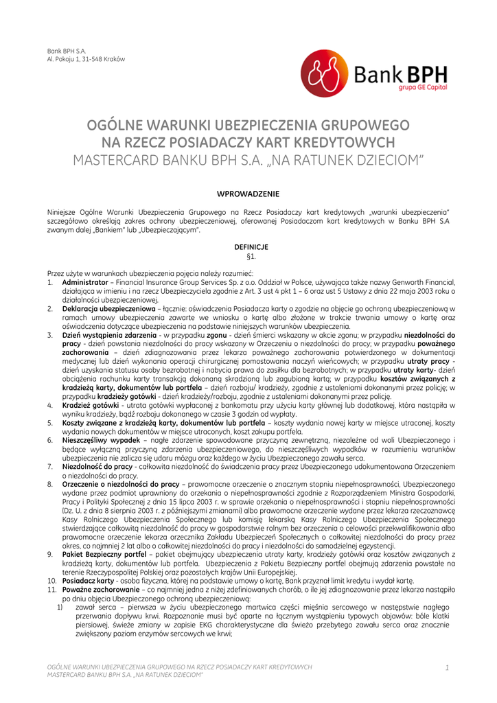 Bank BPH S.A. Al. Pokoju 1, 31-548 Kraków OGÓLNE WARUNKI UBEZPIECZENIA GRUPOWEGO NA RZECZ POSIADACZY KART KREDYTOWYCH MASTERCARD BANKU BPH S.A. „NA RATUNEK DZIECIOM” WPROWADZENIE Niniejsze Ogólne Warunki Ubezpieczenia Grupowego na Rzecz Posiadaczy kart kredytowych „warunki ubezpieczenia” szczegółowo określają zakres ochrony ubezpieczeniowej, oferowanej Posiadaczom kart kredytowych w Banku BPH S.A zwanym dalej „Bankiem” lub „Ubezpieczającym”. DEFINICJE §1. Przez użyte w warunkach ubezpieczenia pojęcia należy rozumieć: 1. Administrator – Financial Insurance Group Services Sp. z o.o. Oddział w Polsce, używająca także nazwy Genworth Financial, działająca w imieniu i na rzecz Ubezpieczyciela zgodnie z Art. 3 ust 4 pkt 1 – 6 oraz ust 5 Ustawy z dnia 22 maja 2003 roku o działalności ubezpieczeniowej. 2. Deklaracja ubezpieczeniowa – łącznie: oświadczenia Posiadacza karty o zgodzie na objęcie go ochroną ubezpieczeniową w ramach umowy ubezpieczenia zawarte we wniosku o kartę albo złożone w trakcie trwania umowy o kartę oraz oświadczenia dotyczące ubezpieczenia na podstawie niniejszych warunków ubezpieczenia. 3. Dzień wystąpienia zdarzenia - w przypadku zgonu - dzień śmierci wskazany w akcie zgonu; w przypadku niezdolności do pracy - dzień powstania niezdolności do pracy wskazany w Orzeczeniu o niezdolności do pracy; w przypadku poważnego zachorowania – dzień zdiagnozowania przez lekarza poważnego zachorowania potwierdzonego w dokumentacji medycznej lub dzień wykonania operacji chirurgicznej pomostowania naczyń wieńcowych; w przypadku utraty pracy dzień uzyskania statusu osoby bezrobotnej i nabycia prawa do zasiłku dla bezrobotnych; w przypadku utraty karty- dzień obciążenia rachunku karty transakcją dokonaną skradzioną lub zagubioną kartą; w przypadku kosztów związanych z kradzieżą karty, dokumentów lub portfela – dzień rozboju/ kradzieży, zgodnie z ustaleniami dokonanymi przez policję; w przypadku kradzieży gotówki - dzień kradzieży/rozboju, zgodnie z ustaleniami dokonanymi przez policję. 4. Kradzież gotówki - utrata gotówki wypłaconej z bankomatu przy użyciu karty głównej lub dodatkowej, która nastąpiła w wyniku kradzieży, bądź rozboju dokonanego w czasie 3 godzin od wypłaty. 5. Koszty związane z kradzieżą karty, dokumentów lub portfela – koszty wydania nowej karty w miejsce utraconej, koszty wydania nowych dokumentów w miejsce utraconych, koszt zakupu portfela. 6. Nieszczęśliwy wypadek – nagłe zdarzenie spowodowane przyczyną zewnętrzną, niezależne od woli Ubezpieczonego i będące wyłączną przyczyną zdarzenia ubezpieczeniowego, do nieszczęśliwych wypadków w rozumieniu warunków ubezpieczenia nie zalicza się udaru mózgu oraz każdego w życiu Ubezpieczonego zawału serca. 7. Niezdolność do pracy - całkowita niezdolność do świadczenia pracy przez Ubezpieczonego udokumentowana Orzeczeniem o niezdolności do pracy. 8. Orzeczenie o niezdolności do pracy – prawomocne orzeczenie o znacznym stopniu niepełnosprawności, Ubezpieczonego wydane przez podmiot uprawniony do orzekania o niepełnosprawności zgodnie z Rozporządzeniem Ministra Gospodarki, Pracy i Polityki Społecznej z dnia 15 lipca 2003 r. w sprawie orzekania o niepełnosprawności i stopniu niepełnosprawności (Dz. U. z dnia 8 sierpnia 2003 r. z późniejszymi zmianami) albo prawomocne orzeczenie wydane przez lekarza rzeczoznawcę Kasy Rolniczego Ubezpieczenia Społecznego lub komisję lekarską Kasy Rolniczego Ubezpieczenia Społecznego stwierdzające całkowitą niezdolność do pracy w gospodarstwie rolnym bez orzeczenia o celowości przekwalifikowania albo prawomocne orzeczenie lekarza orzecznika Zakładu Ubezpieczeń Społecznych o całkowitej niezdolności do pracy przez okres, co najmniej 2 lat albo o całkowitej niezdolności do pracy i niezdolności do samodzielnej egzystencji. 9. Pakiet Bezpieczny portfel – pakiet obejmujący ubezpieczenia utraty karty, kradzieży gotówki oraz kosztów związanych z kradzieżą karty, dokumentów lub portfela. Ubezpieczenia z Pakietu Bezpieczny portfel obejmują zdarzenia powstałe na terenie Rzeczypospolitej Polskiej oraz pozostałych krajów Unii Europejskiej. 10. Posiadacz karty - osoba fizyczna, której na podstawie umowy o kartę, Bank przyznał limit kredytu i wydał kartę. 11. Poważne zachorowanie – co najmniej jedna z niżej zdefiniowanych chorób, o ile jej zdiagnozowanie przez lekarza nastąpiło po dniu objęcia Ubezpieczonego ochroną ubezpieczeniową: 1) zawał serca – pierwsza w życiu ubezpieczonego martwica części mięśnia sercowego w następstwie nagłego przerwania dopływu krwi. Rozpoznanie musi być oparte na łącznym wystąpieniu typowych objawów: bóle klatki piersiowej, świeże zmiany w zapisie EKG charakterystyczne dla świeżo przebytego zawału serca oraz znacznie zwiększony poziom enzymów sercowych we krwi; OGÓLNE WARUNKI UBEZPIECZENIA GRUPOWEGO NA RZECZ POSIADACZY KART KREDYTOWYCH MASTERCARD BANKU BPH S.A. „NA RATUNEK DZIECIOM” 1 2) udar mózgu – nagłe, ogniskowe uszkodzenie mózgu powstałe w następstwie zmian naczyniowych, powodujące powstanie trwałych ubytków neurologicznych. Rozpoznanie musi zostać poparte świeżymi zmianami w obrazie tomografii komputerowej lub jądrowego rezonansu magnetycznego. Ubezpieczeniem nie są objęte jakiekolwiek epizody przemijającego niedokrwienia mózgu; 3) niewydolność nerek – schyłkowe stadium choroby nerek wyrażające się nieodwracalnym upośledzeniem czynności obu nerek oraz stanowiące bezwzględne wskazanie do przewlekłej dializoterapii lub przeszczepu nerek; 4) nowotwór (rak) – guz złośliwy, charakteryzujący się niekontrolowanym wzrostem i rozprzestrzenianiem się komórek nowotworowych powodujący naciekanie i niszczenie prawidłowych tkanek potwierdzony badaniem histopatologicznym przeprowadzonym przez wykwalifikowanego lekarza onkologa