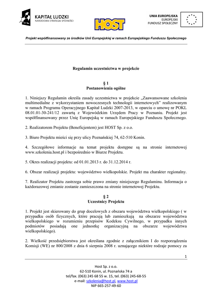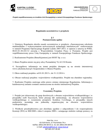 Projekt współfinansowany ze środków Unii Europejskiej w ramach Europejskiego Funduszu Społecznego Regulamin uczestnictwa w projekcie §1 Postanowienia ogólne 1. Niniejszy Regulamin określa zasady uczestnictwa w projekcie „Zaawansowane szkolenia multimedialne z wykorzystaniem nowoczesnych technologii internetowych” realizowanym w ramach Programu Operacyjnego Kapitał Ludzki 2007-2013, w oparciu o umowę nr POKL 08.01.01-30-241/12 zawartą z Wojewódzkim Urzędem Pracy w Poznaniu. Projekt jest współfinansowany przez Unię Europejską w ramach Europejskiego Funduszu Społecznego. 2. Realizatorem Projektu (Beneficjentem) jest HOST Sp. z o.o. 3. Biuro Projektu mieści się przy ulicy Poznańskiej 74, 62-510 Konin. 4. Szczegółowe informacje na temat projektu dostępne są na stronie internetowej www.szkolenia.host.pl i bezpośrednio w Biurze Projektu. 5. Okres realizacji projektu: od 01.01.2013 r. do 31.12.2014 r. 6. Obszar realizacji projektu: województwo wielkopolskie. Projekt ma charakter regionalny. 7. Realizator Projektu zastrzega sobie prawo zmiany niniejszego Regulaminu. Informacja o każdorazowej zmianie zostanie zamieszczona na stronie internetowej Projektu. §2 Uczestnicy Projektu 1. Projekt jest skierowany do grup docelowych z obszaru województwa wielkopolskiego ( w przypadku osób fizycznych, które pracują lub zamieszkują na obszarze województwa wielkopolskiego w rozumieniu przepisów Kodeksu Cywilnego, w przypadku innych podmiotów posiadają one jednostkę organizacyjną na obszarze województwa wielkopolskiego). 2. Wielkość przedsiębiorstwa jest określana zgodnie z załącznikiem I do rozporządzenia Komisji (WE) nr 800/2008 z dnia 6 sierpnia 2008 r. uznającego niektóre rodzaje pomocy za 1 Host Sp. z o.o. 62-510 Konin, ul. Poznańska 74 a tel/fax. (063) 245 68 55 w. 15, tel. (063) 245-68-55 e-mail: [email protected], www.host.pl NIP 665-257-49-60 Projekt współfinansowany ze środków Unii Europejskiej w ramach Europejskiego Funduszu Społecznego zgodne ze wspólnym rynkiem w zastosowaniu art. 87 i 88 Traktatu (ogólnego rozporządzenia w sprawie wyłączeń blokowych) (Dz. Urz. UE L 214 z 9.08.2008, str 3). 3. W szkoleniu mogą brać udział przedsiębiorstwa z branży uznanej przez Wojewódzki Urząd Pracy za kluczowe w województwie wielkopolskim, zgodnie z sekcjami PKD 2007 (wymienionymi w § 5 ust. 2 Regulaminu): przetwórstwo przemysłowe; budownictwo; handel hurtowy i detaliczny, naprawa pojazdów samochodowych (włączając motocykle); transport i gospodarka magazynowa; działalność związana z zakwaterowaniem i usługami gastronomicznymi; informacja i komunikacja; działalność finansowa i ubezpieczeniowa; działalność związana z obsługą rynku nieruchomości; opieka zdrowotna i pomoc społeczna; działalność profesjonalna, naukowa i techniczna. §3 Cel Projektu 1. Celem Projektu jest nabycie umiejętności posługiwania się programami informatycznymi i/lub systemami zarządzania przedsiębiorstwem przez co najmniej 200 pracowników z 40 wielkopolskich mikro, małych i średnich przedsiębiorstw w okresie do 31.12.2014 r. §4 Kryteria uczestnictwa w projekcie 1. Uczestnikiem szkolenia może być pracownik oddelegowany przez Beneficjenta pomocy (pracodawcę). Za pracowników uznawane są osoby: a) Pracownicy w rozumieniu art. 2 ustawy z dnia 26 czerwca 1974 r. – Kodeks pracy (Dz. U. z 1998 r. Nr 21, poz. 94, z późn. zm.), b) Właściciele, pełniący funkcje kierownicze, c) Wspólnicy, w tym partnerzy prowadzący regularną działalność w przedsiębiorstwie i czerpiący z niego korzyści finansowe. 2. Udział w szkoleniu jest nieodpłatny. Wartość usługi szkoleniowej otrzymanej przez Beneficjenta pomocy stanowi pomoc de minimis, która jest udzielana zgodnie z rozporządzeniem Komisji (WE) nr 1998/2006 z dnia 15grudnia 2006r., w sprawie stosowania art. 87 i 88 Traktatu do pomocy de minimis (Dz. Urz. UE L 379 z 28.12.2011, str. 5) oraz rozporządzeniem Ministra Rozwoju Regionalnego w sprawie udzielania pomocy publicznej w ramach Programu Operacyjnego Kapitał Ludzki z dnia 15.12.2010r. (Dz.U. Nr 239, poz. 1598). 2 Host Sp. z o.o. 62-510 Konin, ul. Poznańska 74 a tel/fax. (063) 245 68 55 w. 15, tel. (063) 245-68-55 e-mail: [email protected], www.host.pl NIP 665-257-49-60 Projekt współfinansowany ze środków Unii Europejskiej w ramach Europejskiego Funduszu Społecznego 3. Przed rozpoczęciem szkolenia w ramach Projektu, Przedsiębiorcy zobowiązani są dostarczyć do Biura Projektu następujące dokumenty: • • Wypełniony i podpisany formularz zgłoszeniowy wraz z załącznikami, Wypełnioną i podpisaną Umowę szkoleniową wraz z załącznikami. §5 Zasady kwalifikacji 1. Wstępna kwalifikacja Uczestnika do Projektu następuje na podstawie Formularza Zgłoszeniowego wraz z załącznikami. 2. O zakwalifikowaniu Uczestnika na szkolenie będzie decydowało spełnienie następujących kryteriów: - badanie poziomu znajomości obsługi zintegrowanych systemów ERP; - potwierdzenie statusu MŚP; - weryfikacja branży wg. PKD 2007 - Sekcja C, Dział 10 – 33; Sekcja F, Dział 41 – 43; Sekcja G, Dział 45 – 47; Sekcja H, Dział 49 – 53; Sekcja I, Dział 55 – 56; Sekcja J, Dział 58 – 63); Sekcja K, Dział 64 – 66; Sekcja L, Dział 68; Sekcja Q, Dział 86 – 88; Sekcja M, Dział 69 – 75. - przynależność do grupy docelowej pod względem wykształcenia (min. 50% uczestników z wykształceniem co najwyżej średnim) i stanu zdrowia (min. 10% uczestników niepełnosprawnych). 3. Nabór Uczestników prowadzony będzie zgodnie z zasadą równości szans, w sposób otwarty i niedyskryminujący. Przedsiębiorcy powinni kierować na szkolenia zarówno kobiety, jak i mężczyzn. Planuje się udział w projekcie ok. 60% kobiet. §6 Opis platformy 1. W celu skorzystania ze szkoleń e-learningowych Uczestnik zobowiązany jest do posiadania aktywnego konta e-mail, na który zostaną przesłane dane do logowania do szkole