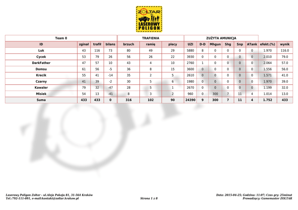 Team 0 TRAFIENIA ZUŻYTA AMUNICJA ID zginał trafił bilans brzuch ramię plecy UZI D-D Mhgun Shg Snp Luk 43 116 73 80 49 29 5880 8 0 0 0 0 1.970 116.0 Cycek 53 79 26 56 26 22 3930 0 0 0 0 0 2.010 79.0 DarkFather 47 57 10 43 4 10 2760 1 0 0 0 0 2.064 57.0 Domsu 61 56 -5 36 8 15 3600 0 0 0 0 0 1.556 56.0 Krecik 55 41 -14 35 2 5 2610 0 0 0 0 0 1.571 41.0 Czarny 41 39 -2 30 5 6 1980 0 0 0 0 0 1.970 39.0 Kawaler 79 32 -47 28 5 1 2670 0 0 0 0 0 1.199 32.0 Misiek 54 13 -41 8 3 2 960 0 300 7 11 4 1.014 13.0 Suma 433 433 0 316 102 90 24390 9 300 7 11 4 1.752 433 Laserowy Poligon Zoltar - ul.Aleja Pokoju 81, 31-564 Kraków Tel.:792-111-091, e-mail:[email protected] Strona 1 z 8 ATank efekt.(%) wynik Data: 2015-04-25; Godzina: 11:07; Czas gry: 25minut Prowadzący: Gamemaster ZOLTAR Team 1 TRAFIENIA ZUŻYTA AMUNICJA ID zginał trafił bilans brzuch ramię plecy UZI D-D efekt.(%) wynik Luk 24 45 21 24 22 6 4470 0 1.007 45.0 Krecik 40 24 -15 18 6 3 3420 0 0.702 24.0 DarkFather 17 19 2 11 6 3 1980 0 0.960 19.0 Kawaler 40 15 -25 9 4 4 3510 0 0.427 15.0 Krzys 33 12 -21 9 2 2 1380 1 0.869 12.0 Suma 154 115 -38 71 40 18 14760 1 0.779 115 Team 2 TRAFIENIA ZUŻYTA AMUNICJA ID zginał trafił bilans brzuch ramię plecy UZI D-D efekt.(%) wynik Cycek 40 62 62 41 30 14 3420 0 1.813 62.0 Domsu 44 54 10 30 20 7 3240 0 1.667 54.0 Misiek 36 19 -17 14 3 3 1740 29 1.074 19.0 Czarny 35 18 -17 12 4 4 1620 8 1.106 18.0 Suma 155 153 38 97 57 28 10020 37 1.521 153 Laserowy Poligon Zoltar - ul.Aleja Pokoju 81, 31-564 Kraków Tel.:792-111-091, e-mail:[email protected] Team 2 Team 1 153 115 Strona 2 z 8 Data: 2015-04-25; Godzina: 11:42; Czas gry: 21minut Prowadzący: Gamemaster ZOLTAR Team 1 TRAFIENIA ZUŻYTA AMUNICJA ID zginał trafił bilans brzuch ramię plecy UZI efekt.(%) wynik Luk 31 103 72 67 58 25 6360 1.619 103.0 Domsu 35 41 6 25 12 6 3870 1.059 41.0 DarkFather 26 26 0 17 7 3 2610 0.996 26.0 Suma 92 170 78 109 77 34 12840 1.324 170 Team 2 TRAFIENIA ZUŻYTA AMUNICJA ID zginał trafił bilans brzuch ramię plecy UZI efekt.(%) wynik Cycek 27 64 37 42 33 17 3570 1.793 64.0 Krecik 46 33 -13 24 10 3 4530 0.728 33.0 Misiek 40 13 -27 10 0 3 3690 0.352 13.0 Suma 113 110 -3 76 43 23 11790 0.933 110 Team 3 TRAFIENIA ZUŻYTA AMUNICJA ID zginał trafił bilans brzuch ramię plecy UZI efekt.(%) wynik Czarny 47 30 -17 21 7 6 3180 0.943 30.0 Kawaler 56 27 -29 17 6 4 3660 0.738 27.0 Krzys 53 24 -29 14 10 6 1530 1.569 24.0 Suma 156 81 -75 52 23 16 8370 0.968 81 Laserowy Poligon Zoltar - ul.Aleja Pokoju 81, 31-564 Kraków Tel.:792-111-091, e-mail:[email protected] Team 1 Team 2 Team 3 170 110 81 Strona 3 z 8 Data: 2015-04-25; Godzina: 12:10; Czas gry: 21minut Prowadzący: Gamemaster ZOLTAR Team 1 TRAFIENIA ZUŻYTA AMUNICJA ID zginał trafił bilans brzuch ramię plecy UZI efekt.(%) wynik Luk 35 108 73 69 70 20 7170 1.506 108.0 Domsu 32 65 33 27 26 17 5040 1.290 65.0 DarkFather 30 39 9 22 6 12 2880 1.354 39.0 Suma 97 212 115 118 102 49 15090 1.405 212 Team 2 TRAFIENIA ZUŻYTA AMUNICJA ID zginał trafił bilans brzuch ramię plecy UZI efekt.(%) wynik Cycek 35 74 39 44 38 14 4290 1.725 74.0 Krecik 56 23 -32 15 3 6 3060 0.752 23.0 Misiek 50 19 -31 11 6 2 3870 0.491 19.0 Suma 141 116 -24 70 47 22 11220 1.034 116 Team 3 TRAFIENIA ZUŻYTA AMUNICJA ID zginał trafił bilans brzuch ramię plecy UZI efekt.(%) wynik Czarny 51 31 -20 15 16 2 4110 0.754 31.0 Krzys 46 29 -17 15 10 10 2280 1.272 29.0 Kawaler 70 16 -54 8 9 1 4200 0.381 16.0 Suma 167 76 -91 38 35 13 10590 0.718 76 Laserowy Poligon Zoltar - ul.Aleja Pokoju 81, 31-564 Kraków Tel.:792-111-091, e-mail:[email protected] Team 1 Team 2 Team 3 212 116 76 Strona 4 z 8 Data: 2015-04-25; Godzina: 12:56; Czas gry: 22minut Prowadzący: Gamemaster ZOLTAR Drużyny Miejsce Laserowy Poligon Zoltar - ul.Aleja Pokoju 81, 31-564 Kraków Tel.:792-111-091, e-mail:[email protected] Rozgrywki Nazwa 1 2 Team 1 - 115 170 212 497 Team 2 - 153 110 116 379 Team 3 - - Strona 5 z 8 3 81 4 76 Suma 157 Data: 2015-04-25 Prowadzący: Gamemaster ZOLTAR Zestawienie wg wyniku Miejsce TRAFIENIA ZUŻYTA AMUNICJA ID zginał trafił bilans brzuch ramię plecy UZI D-D Mhgun Shg Snp aTank efekt.(%) wynik Luk 88.95 248.95 160.00 160.05 134.27 53.18 16152.35 4.80 0.00 0.00 0.00 0.00 1.541 248.95 Cycek 103.52 187.85 84.33 122.89 86.51 44.89 10275.86 0.00 0.00 0.00 0.00 0.00 1.828 187.85 Domsu 114.85 145.78 30.93 79.29 45.38 29.88 10674.94 0.00 0.00 0.00 0.00 0.00 1.366 145.78 4 DarkFather 79.37 92.93 13.56 60.80 15.78 18.47 6898.21 0.60 0.00 0.00 0.00 0.00 1.347 92.93 5 Krecik 132.61 81.00 -51.61 61.23 14.67 11.38 9330.94 0.00 0.00 0.00 0.00 0.00 0.868 81.00 6 Czarny 117.94 78.82 -39.12 51.80 21.77 12.11 7418.84 5.71 0.00 0.00 0.00 0.00 1.062 78.82 7 Krzys 123.72 60.65 -63.07 35.54 20.52 16.71 4844.16 0.95 0.00 0.00 0.00 0.00 1.252 60.65 8 Kawaler 163.70 60.11 -103.59 40.83 16.28 7.00 9587.06 0.00 0.00 0.00 0.00 0.00 0.627 60.11 9 Misiek 120.78 43.61 -77.16 29.44 8.03 6.85 7093.21 20.71 180.00 4.20 6.60 2.40 0.597 43.61 Laserowy Poligon Zoltar - ul.Aleja Pokoju 81, 31-564 Kraków Tel.:792-111-091, e-mail:[email protected] Strona 6 z 8 Data: 2015-04-25 Prowadzący: Gamemaster ZOLTAR Zestawienie wg bilansu Miejsce TRAFIENIA ZUŻYTA AMUNICJA ID zginał trafił bilans brzuch ramię plecy UZI D-D Mhgun Shg Snp aTank efekt.(%) wynik Luk 88.95 248.95 160.00 160.05 134.27 53.18 16152.35 4.80 0.00 0.00 0.00 0.00 1.541 248.95 Cycek 103.52 187.85 84.33 122.89 86.51 44.89 10275.86 0.00 0.00 0.00 0.00 0.00 1.828 187.85 Domsu 114.85 145.78 30.93 79.29 45.38 29.88 10674.94 0.00 0.00 0.00 0.00 0.00 1.366 145.78 4 DarkFather 79.37 92.93 13.56 60.80 15.78 18.47 6898.21 0.60 0.00 0.00 0.00 0.00 1.347 92.93 5 Czarny 117.94 78.82 -39.12 51.80 21.77 12.11 7418.84 5.71 0.00 0.00 0.00 0.00 1.062 78.82 6 Krecik 132.61 81.00 -51.61 61.23 14.67 11.38 9330.94 0.00 0.00 0.00 0.00 0.00 0.868 81.00 7 Krzys 123.72 60.65 -63.07 35.54 20.52 16.71 4844.16 0.95 0.00 0.00 0.00 0.00 1.252 60.65 8 Misiek 120.78 43.61 -77.16 29.44 8.03 6.85 7093.21 20.71 180.00 4.20 6.