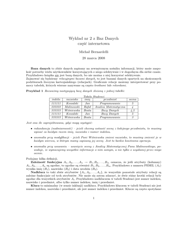 zgodne dla wszystkich atrybutów Ai . Przykładowo nadkluczem w tabeli Studenci jest numer indeksu,